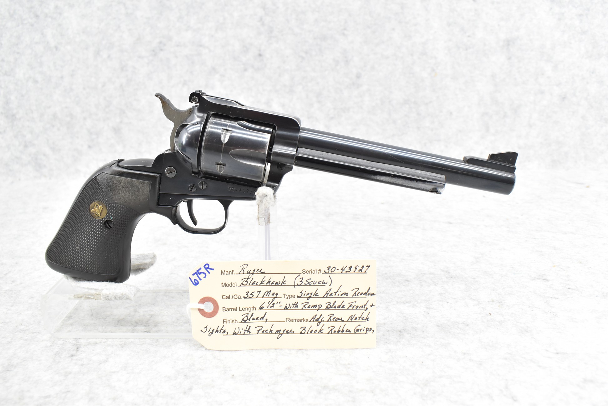 675R. Ruger – Mod. Blackhawk (3-Screw) – 357 Mag. Cal. Single Action Revolver – w/6 ½” Barrel w/Ramp Blade Front & Adj. Rear Notch Sights – Blued Finish – w/Pachmayr Black Rubber Grips