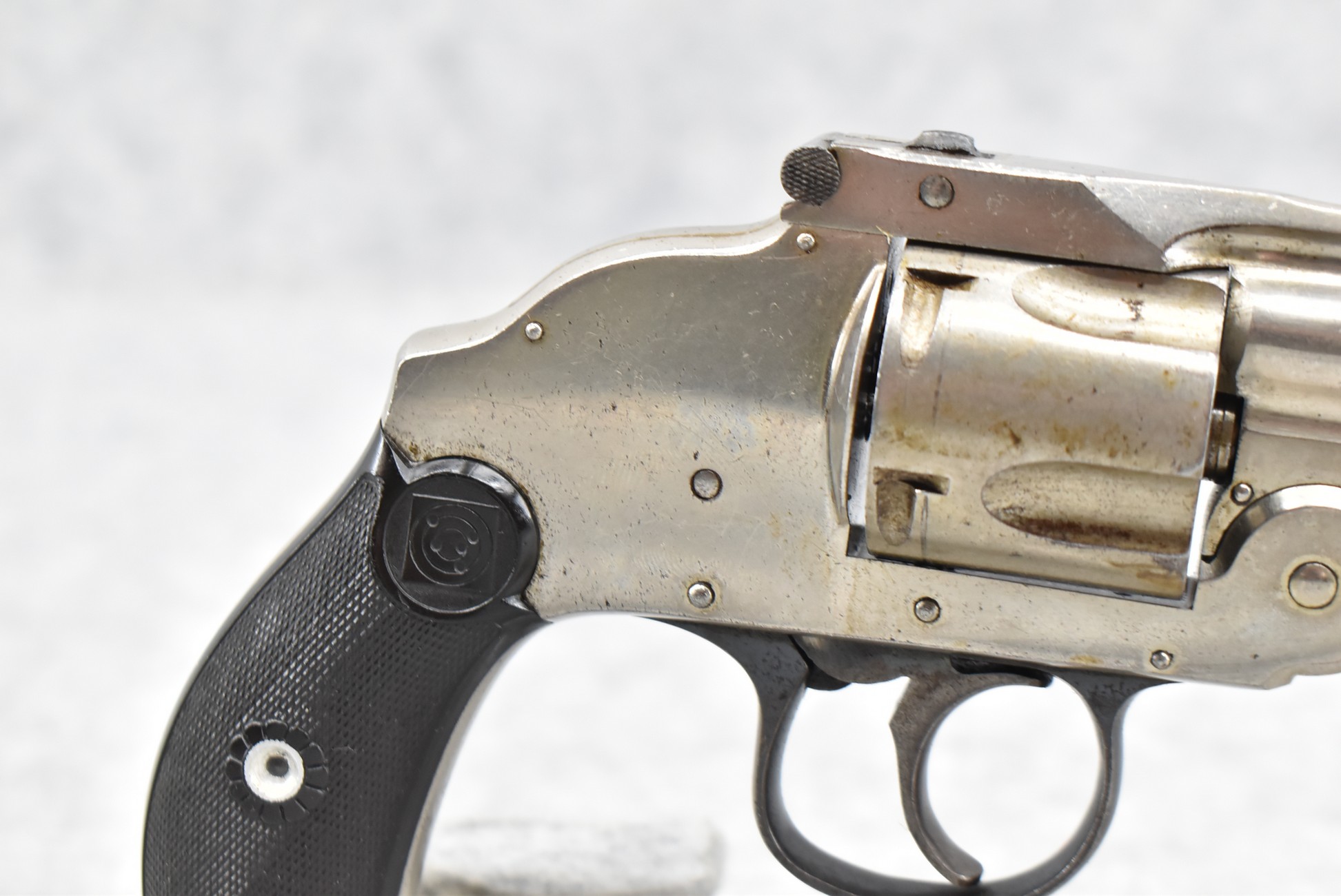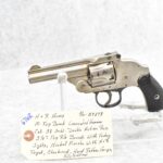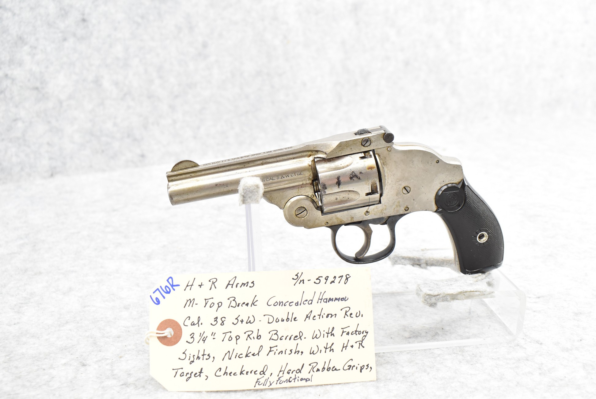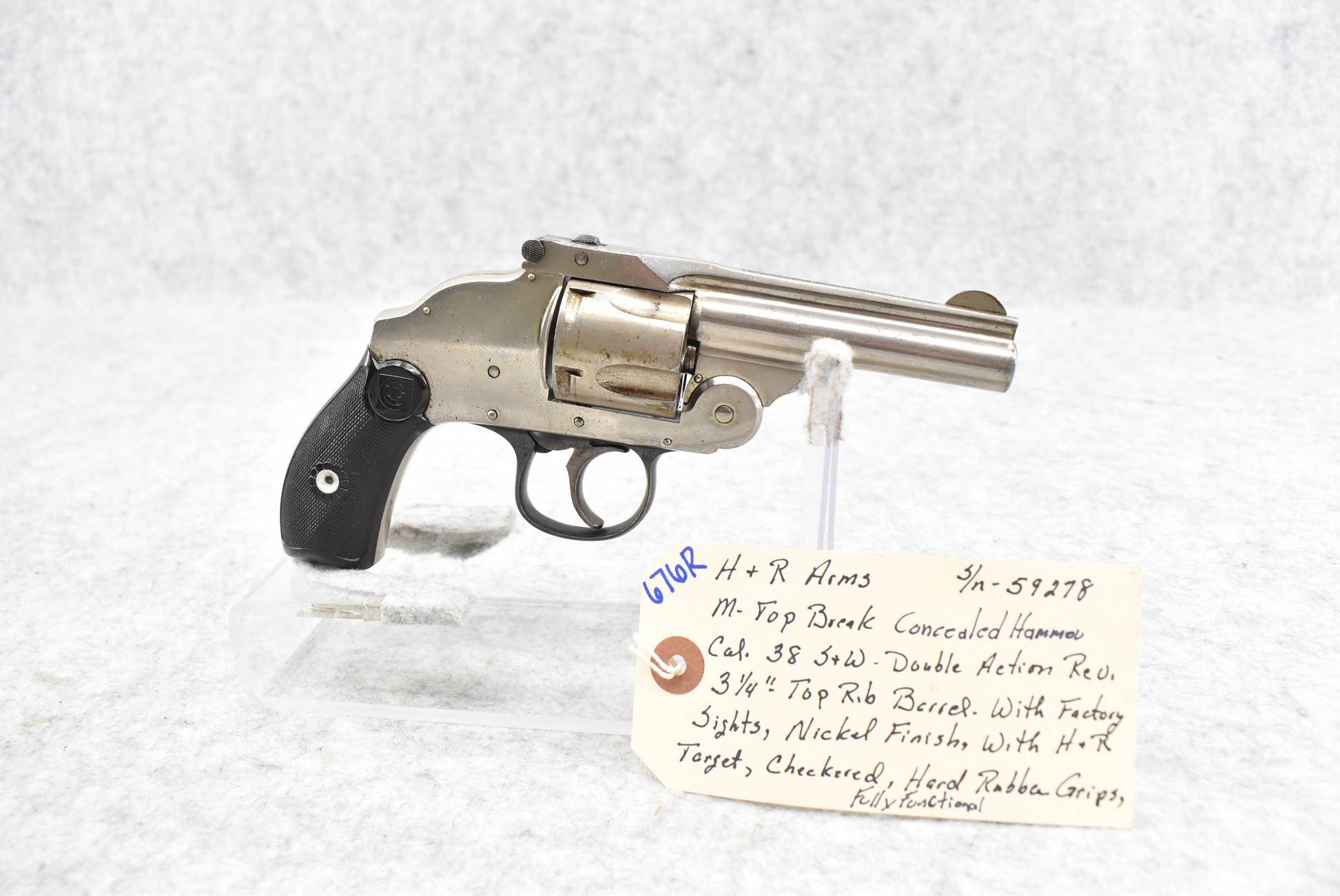 676R. H. & R. Arms – Mod. Top Break Concealed Hammer – 38 S&W Cal. Double Action Revolver – w/3 ¼” Top Rib Barrel w/Factory Sights – Nickel Finish – w/H&R Target Checkered Hard Rubber Grips – Fully Functional