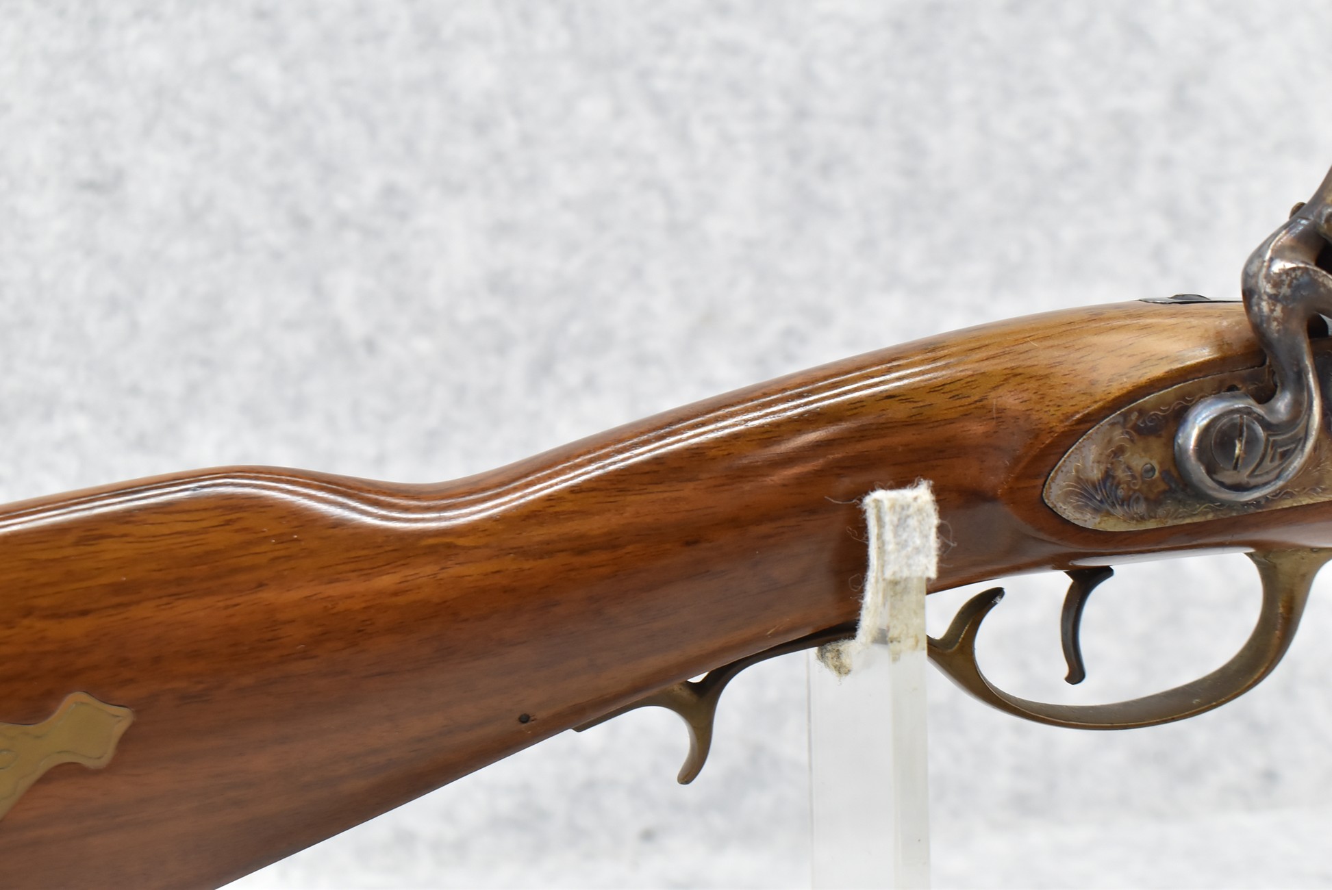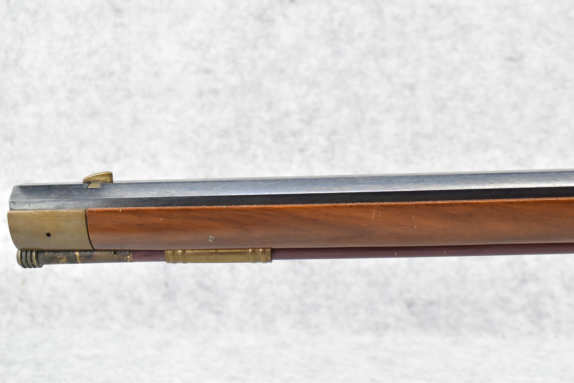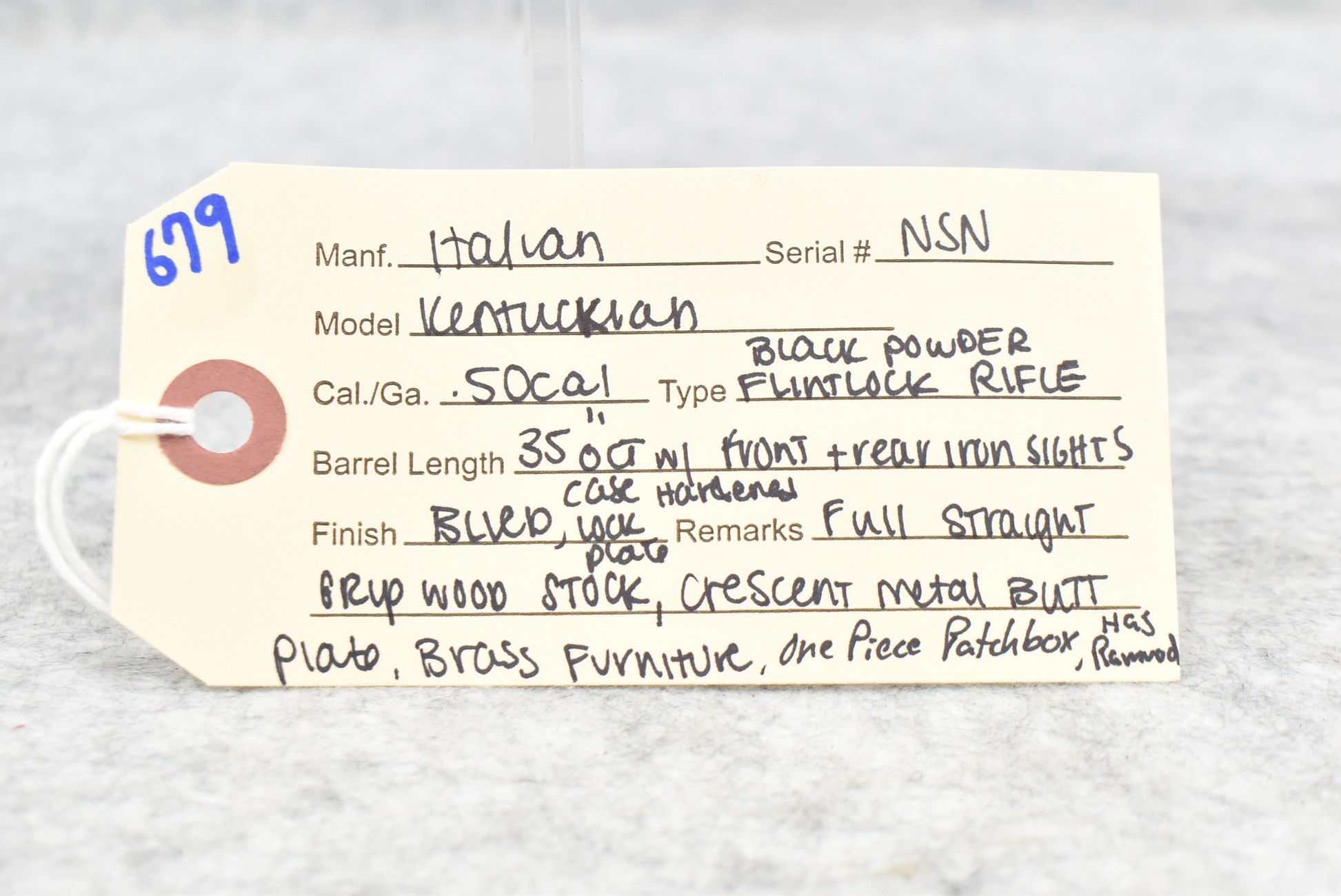 679.        Italian – Mod. Kentuckian – 50 Cal. Black Powder Flintlock Rifle – w/35” Octagon Barrel w/Front and Rear Iron Sights – Blued Finish w/Case Hardened Lock Plate – w/Full Straight Grip Wood Stock w/Crescent Metal Butt Plate – w/Brass Furniture – w/1-Piece Patch Box – w/Ramrod