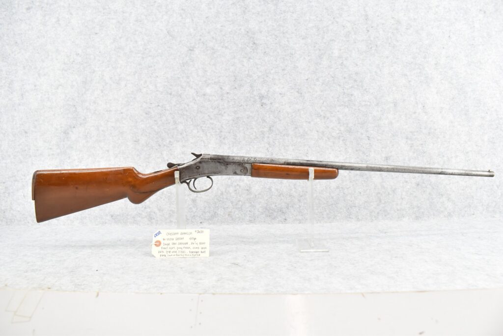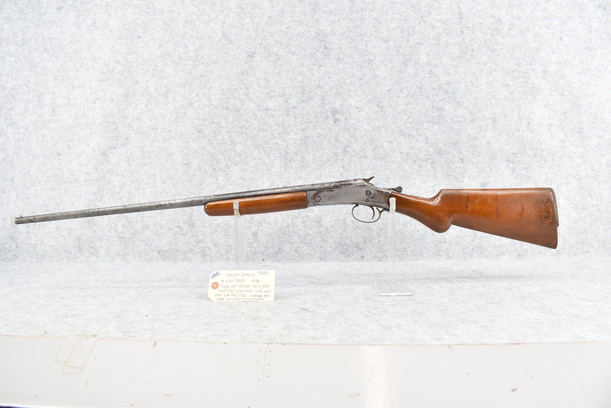 683R.     Crescent Arms Co. – Mod. Victor Special – 410ga. Single Shot Shotgun – w/26” Barrel w/Front Bead Sight – Grey Finish – w/Round Knob Pistol Grip Wood Stocks w/Damaged Butt Plate – There is a Crack at Pistol Grip Wrist on Right Side