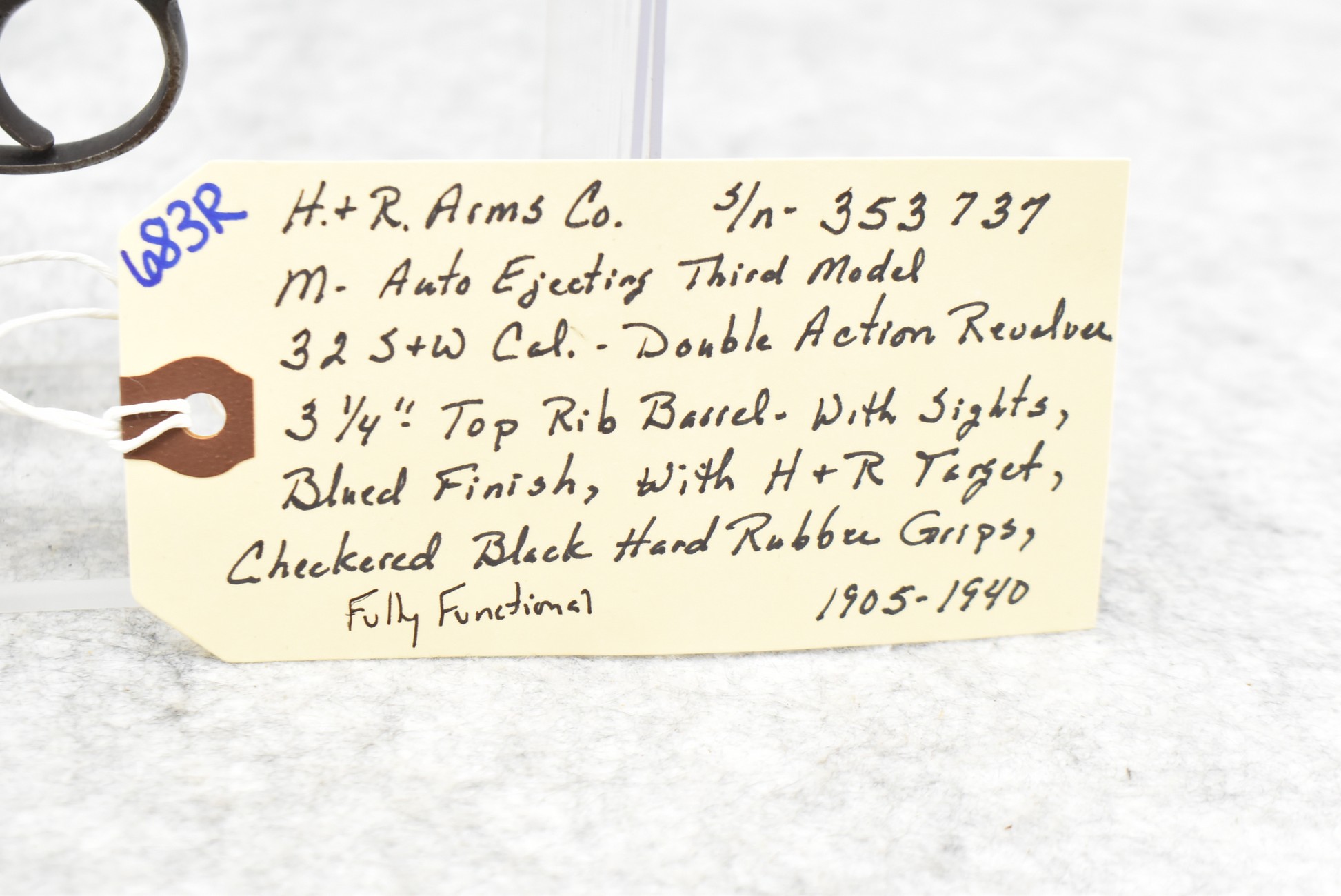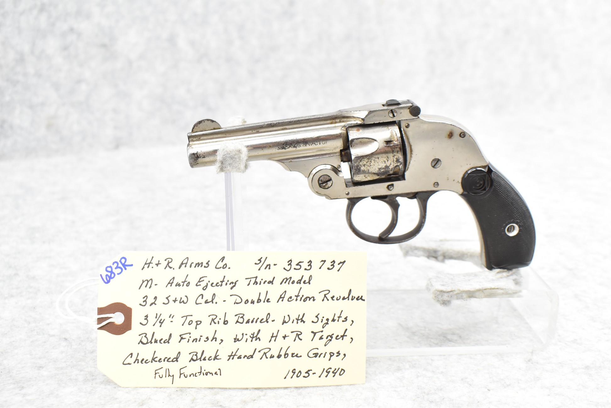 683R. H. & R. Arms Co. – Mod. Auto Ejecting Third Model – 32 S&W Cal. Double Action Revolver – w/3 ¼” Top Rib Barrel w/Sights – Blued Finish – w/H&R Target Checkered Black Hard Rubber Grips – Fully Functional