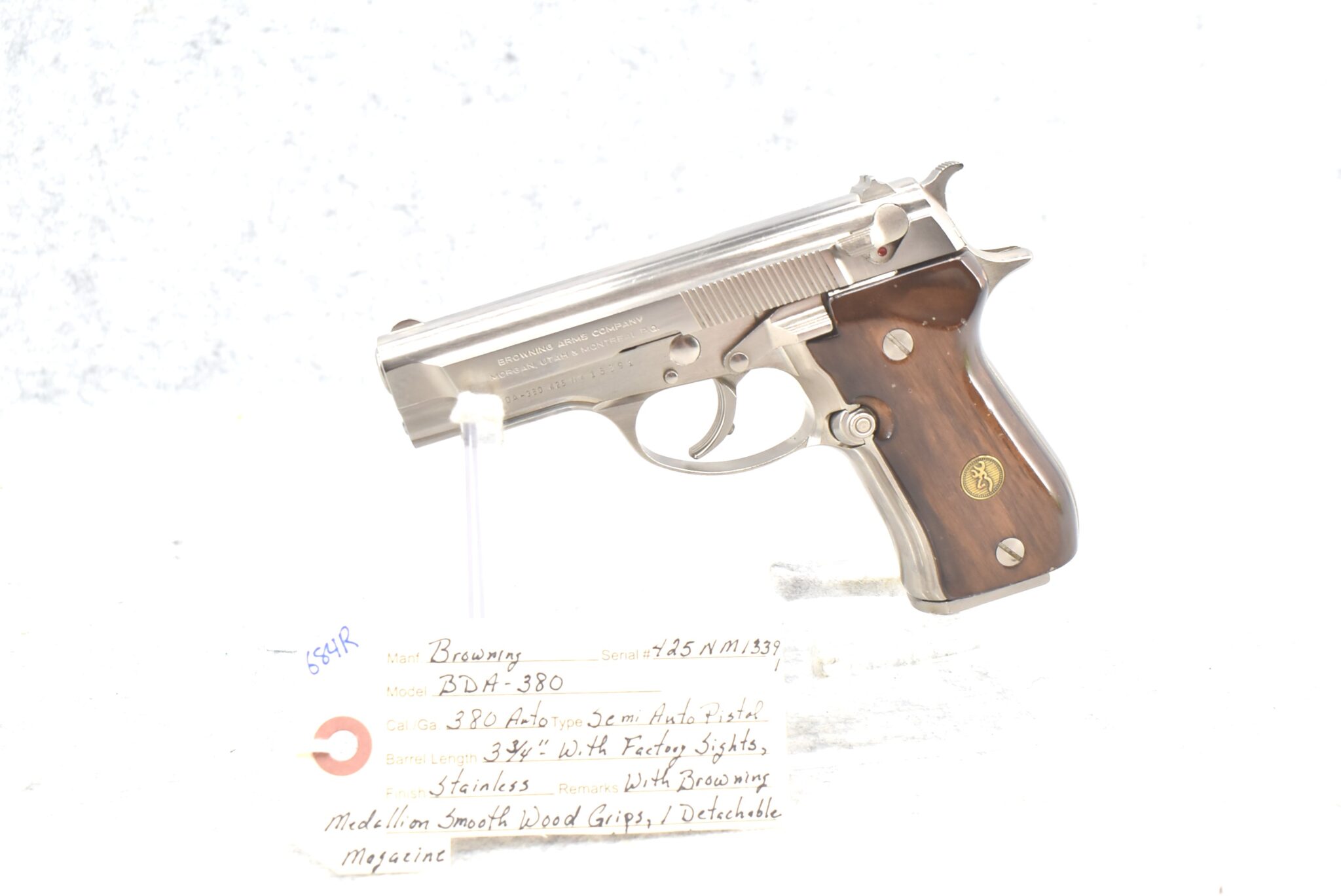 684R. Browning – Mod. BDA-380 – 380 Auto Cal. Semi-Auto Pistol – w/3 ¾” Barrel w/Factory Sights – Stainless Finish – w/Browning Medallion Smooth Wood Grips – w/Detachable Magazine