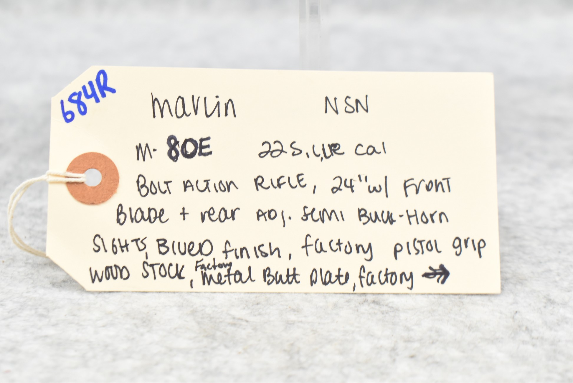 684R. Marlin – Mod. 80E – 22 Cal. Bolt Action Rifle – w/24” Barrel w/Blade Front and Adjustable Rear Semi-Buckhorn Sights – Blued Finish – w/Factory Pistol Grip Wood Stock w/Factory Metal Butt Plate – w/Factory Detachable Magazine
