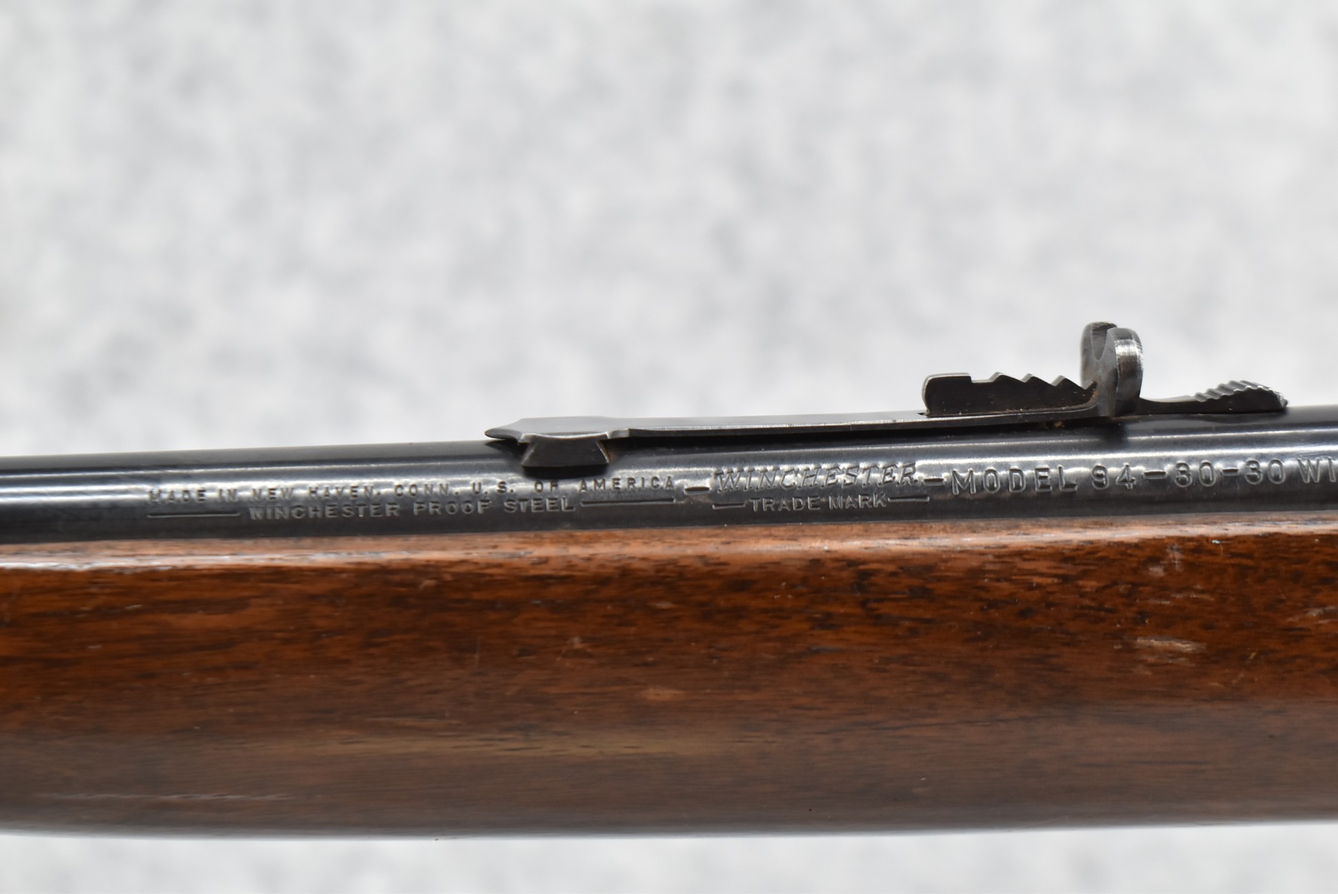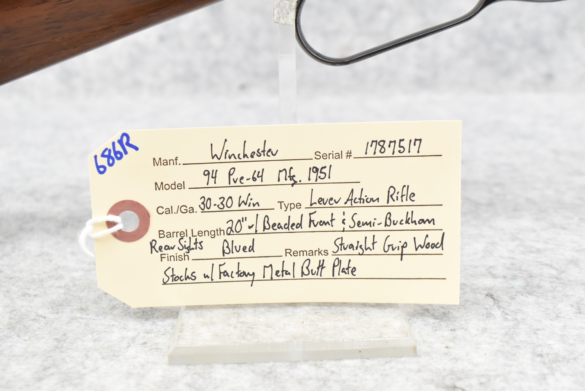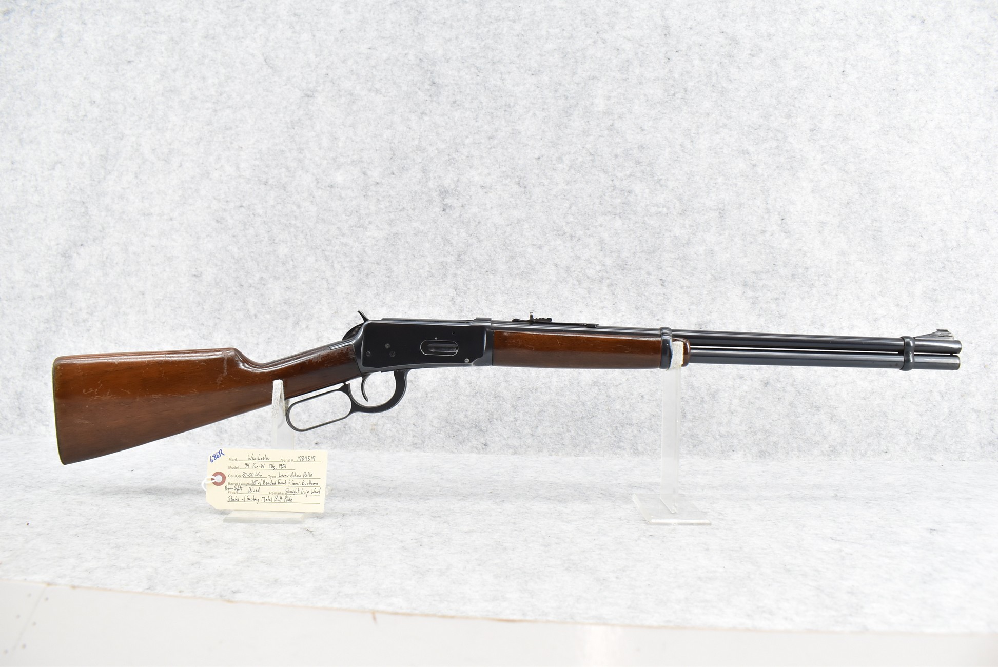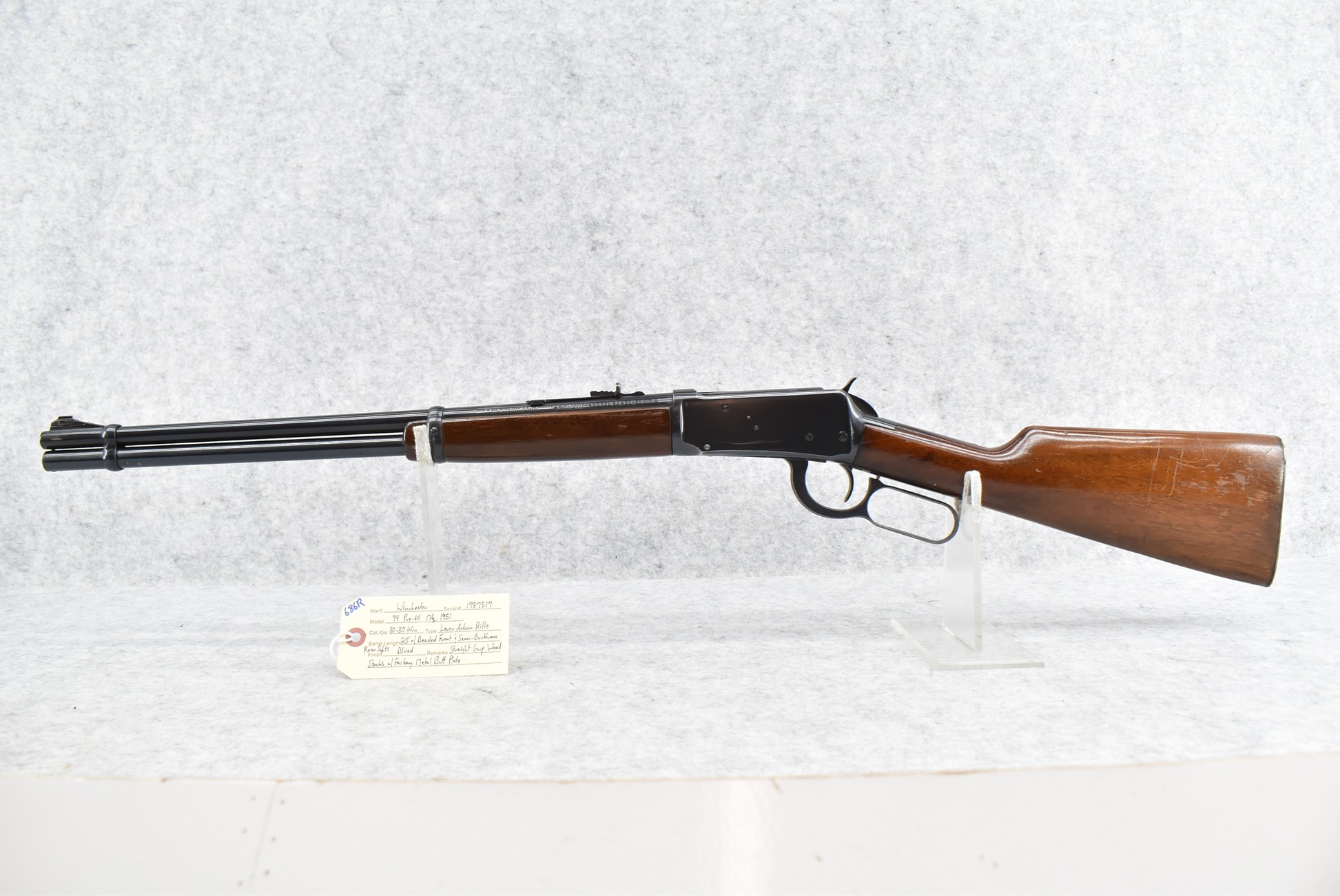 686R. Winchester – Mod. 94 Pre-64 – 30-30 Win. Cal. Lever Action Rifle – w/20” Barrel w/Beaded Front and Semi-Buckhorn Rear Sights – Blued Finish – w/Straight Grip Wood Stocks w/Factory Metal Butt Plate – Manufactured 1951