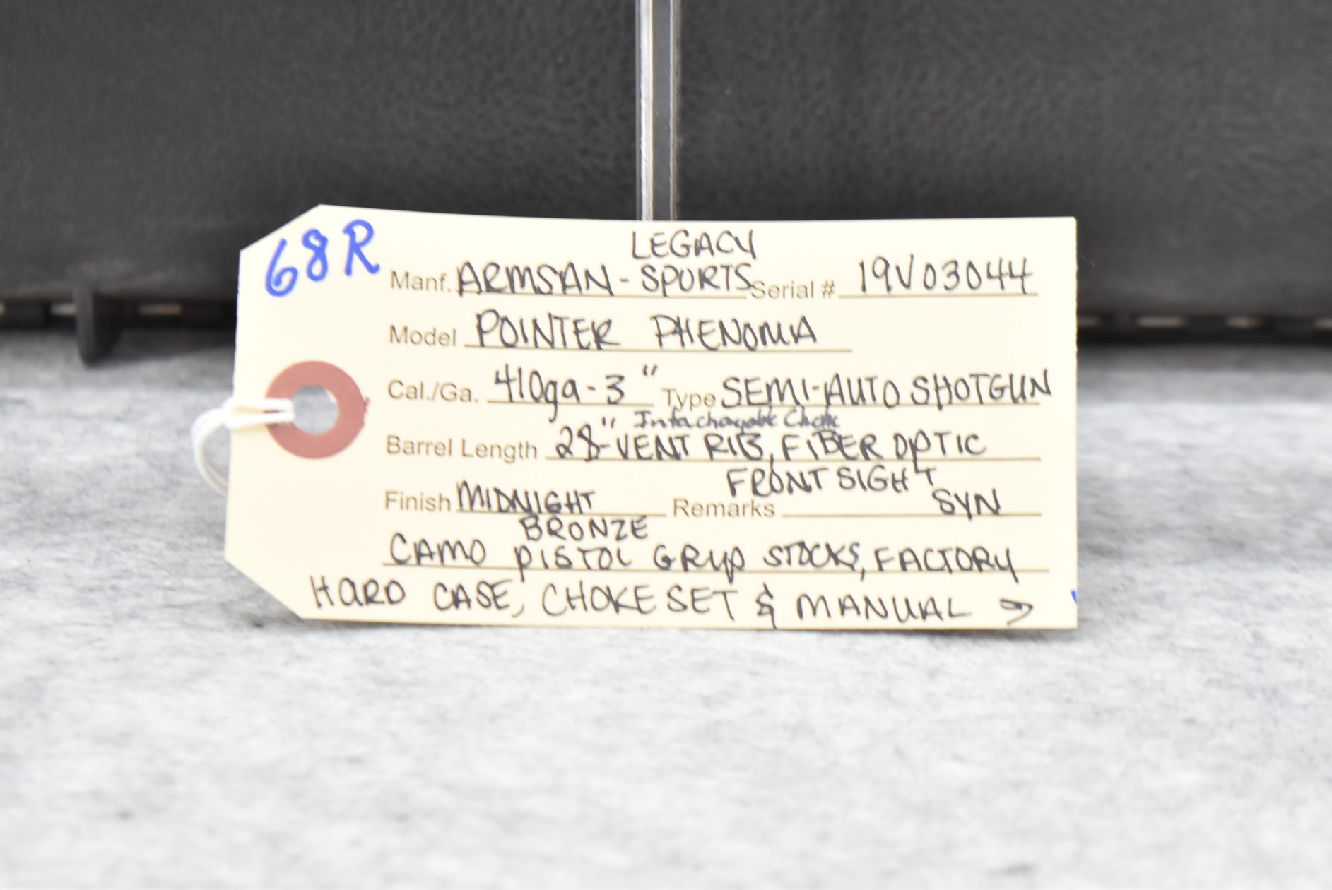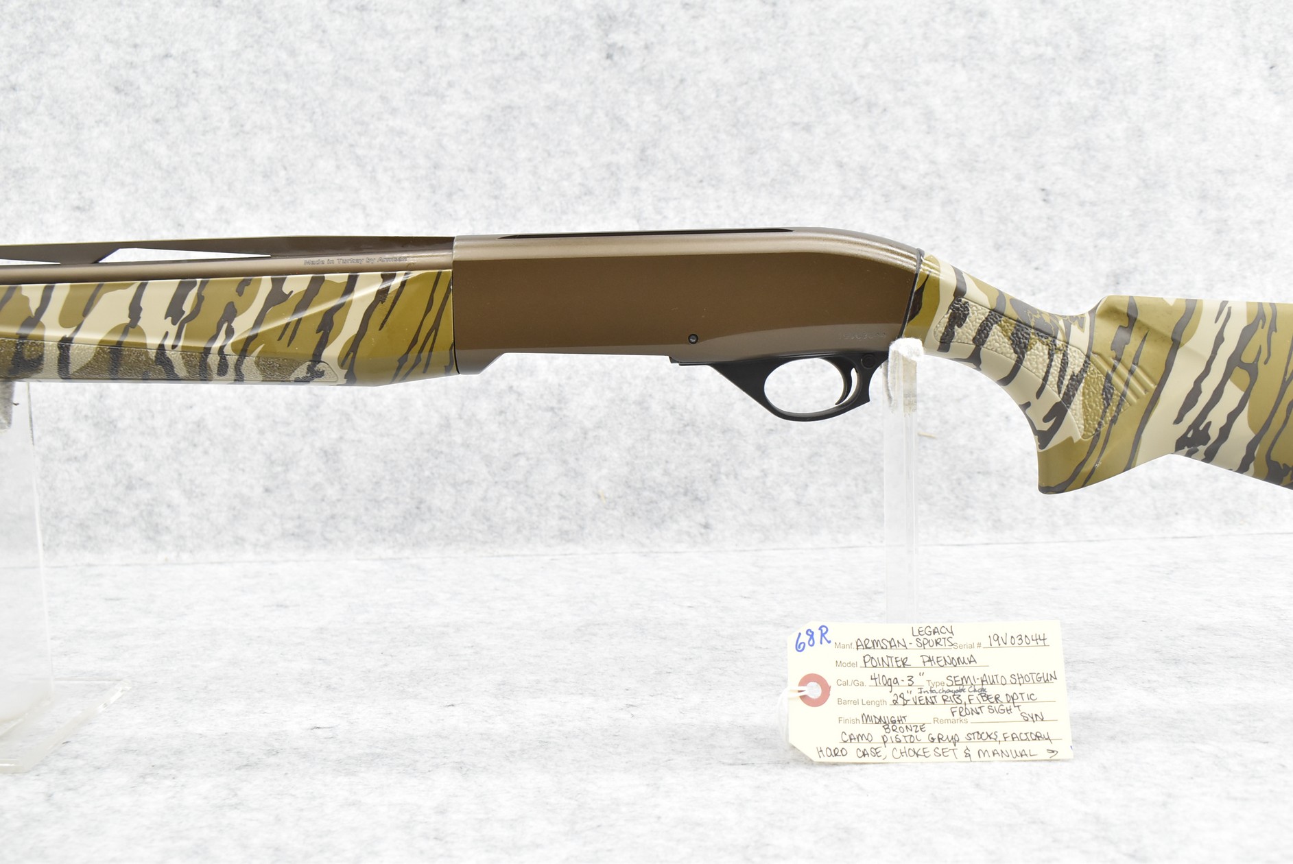 68R.       Armsan/Legacy Sports – Mod. Pointer Phenoma – 410ga. 3” Semi-Auto Shotgun – w/28” Interchangeable Choke, Vent-Rib Barrel w/Fiber Optic Front Sight – Midnight Bronze Finish – w/Synthetic Camo Pistol Grip Stocks – w/Factory Hard Case, Choke Set & Manual