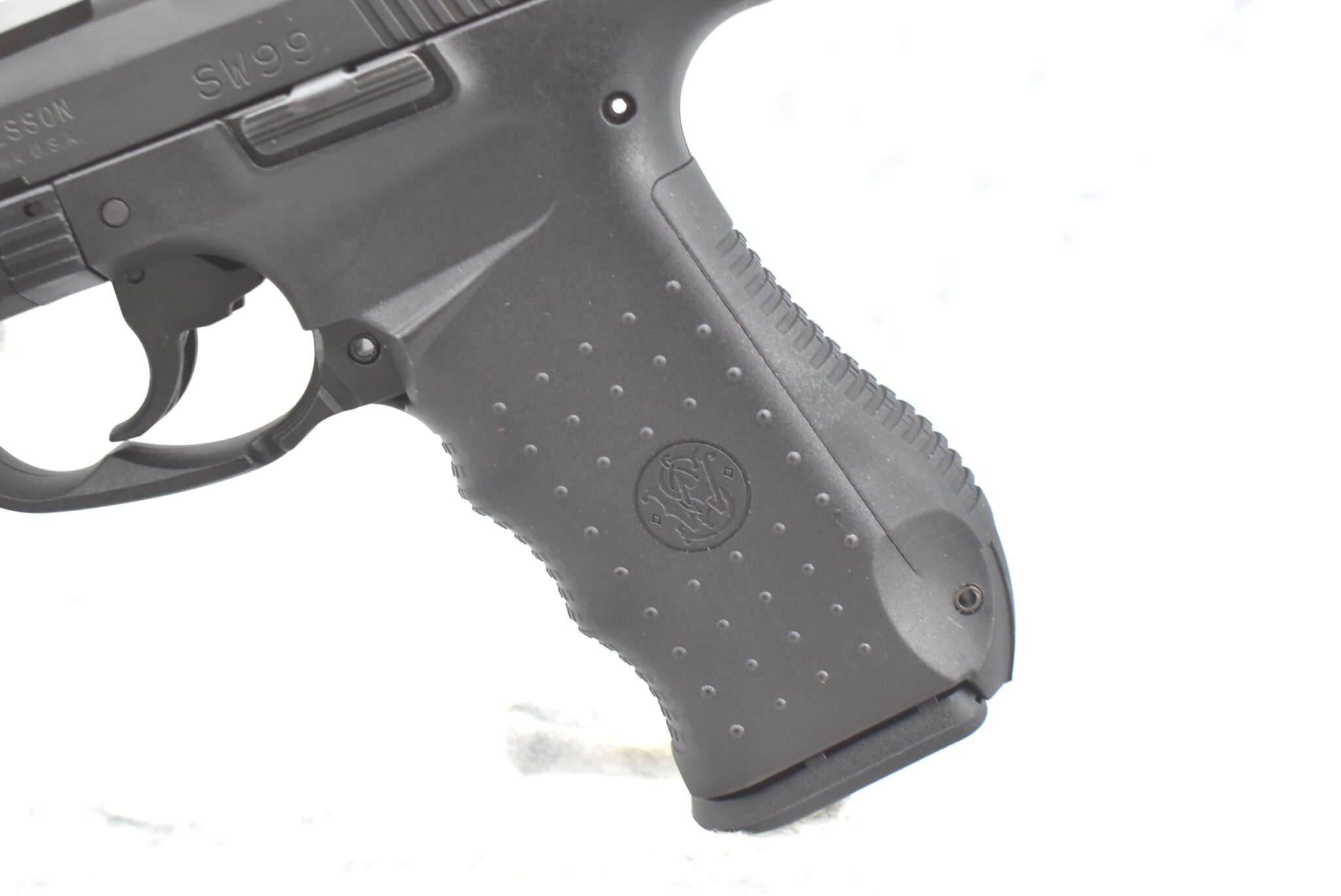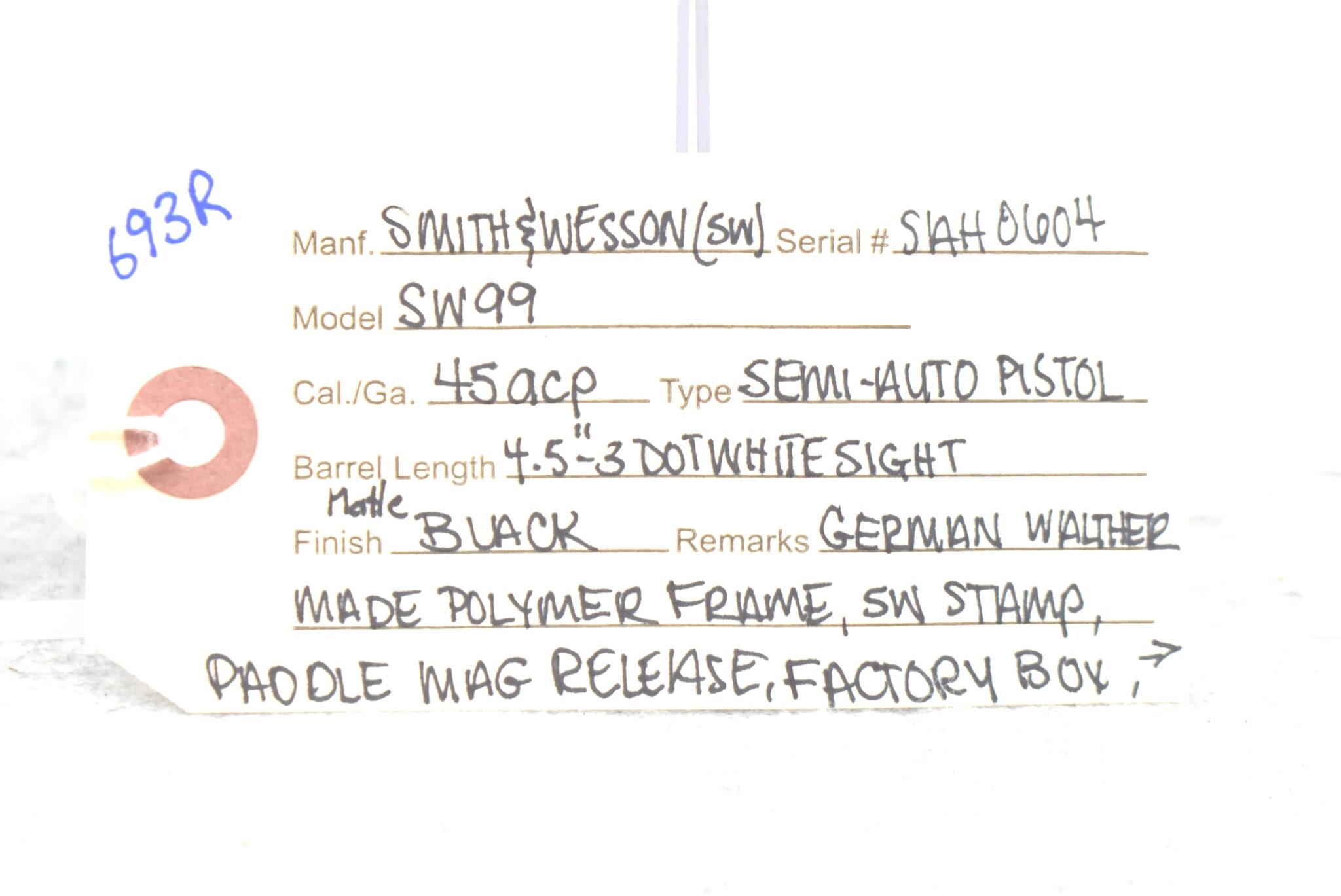 693R. Smith & Wesson – Mod. SW99 – 45 ACP Cal. Semi-Auto Pistol – w/4.5” Barrel w/3-Dot White Sight – Matte Black Finish – w/Paddle Mag Release – w/Factory Box, Manual, 2 Factory S&W Mags, Mag Loader & Back Strap