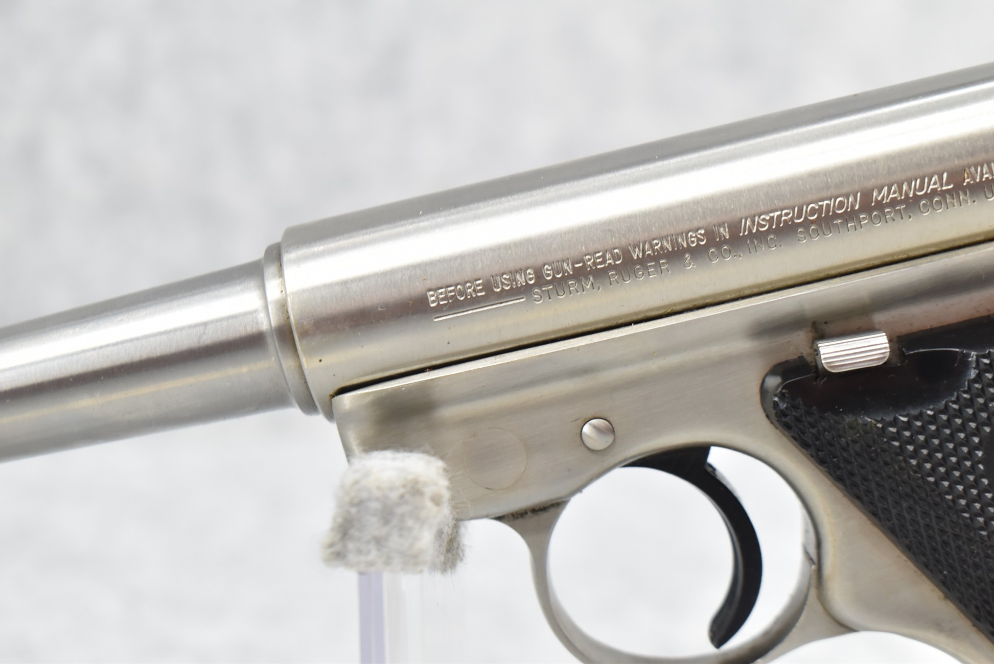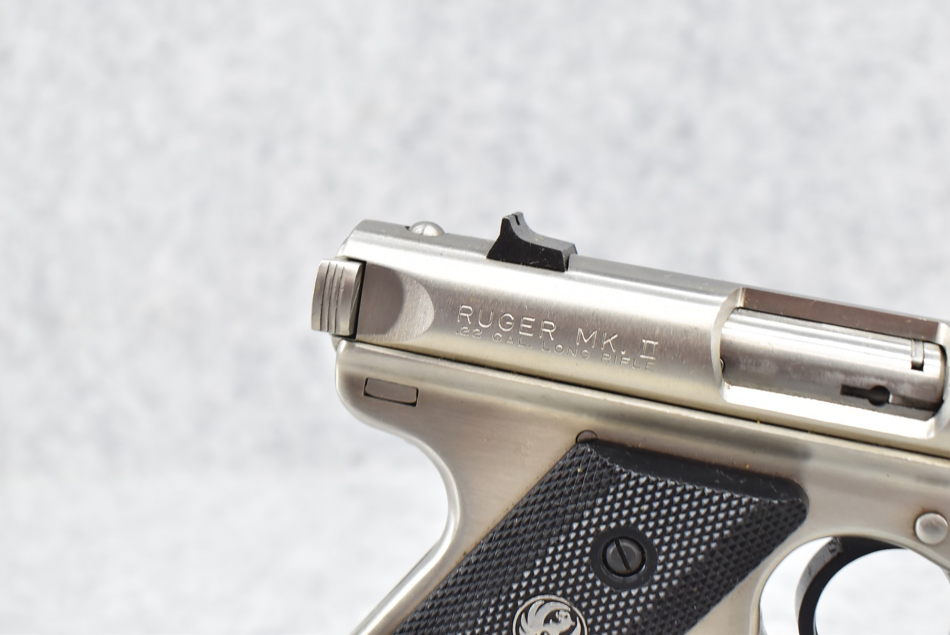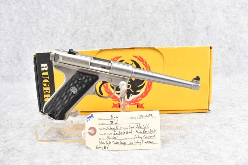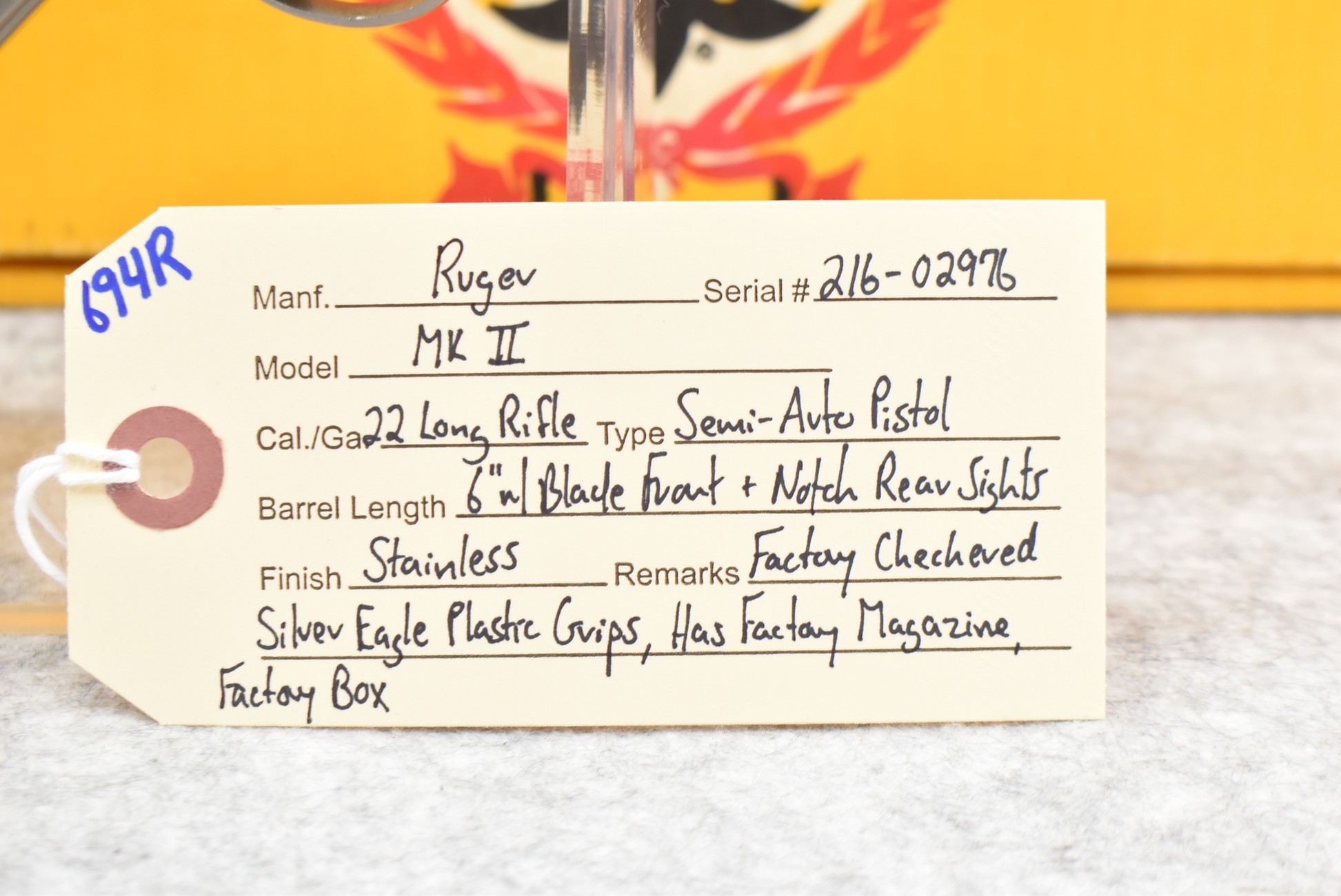 694R. Ruger – Mod. MK II – 22LR Cal. Semi-Auto Pistol – w/6” Barrel w/Blade Front and Rear Notch Sights – Stainless Finish – w/Factory Checkered Silver Eagle Plastic Grips – w/Factory Magazine – w/Factory Box