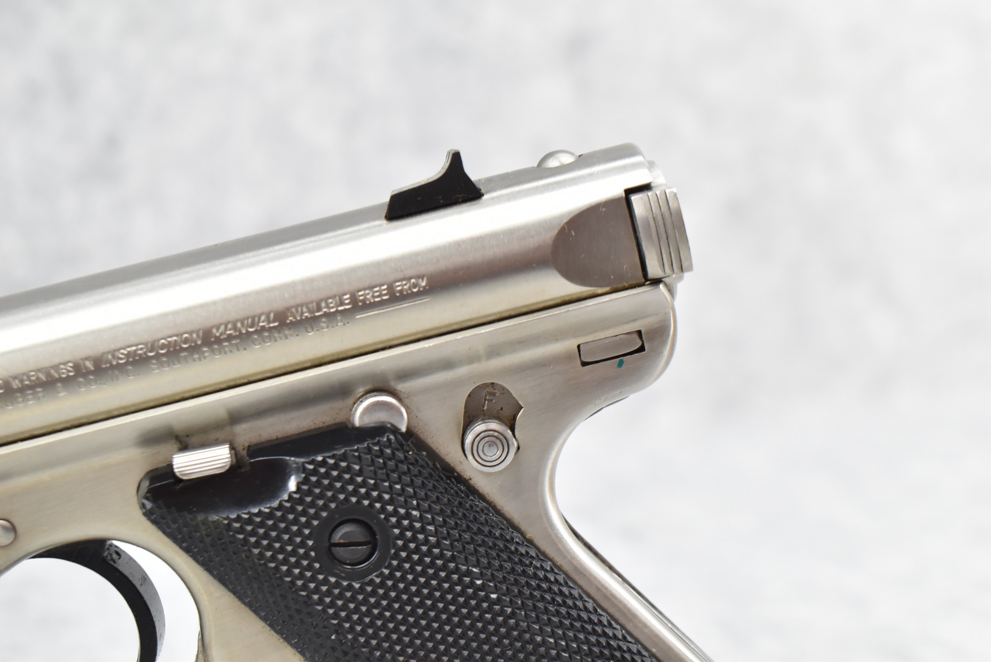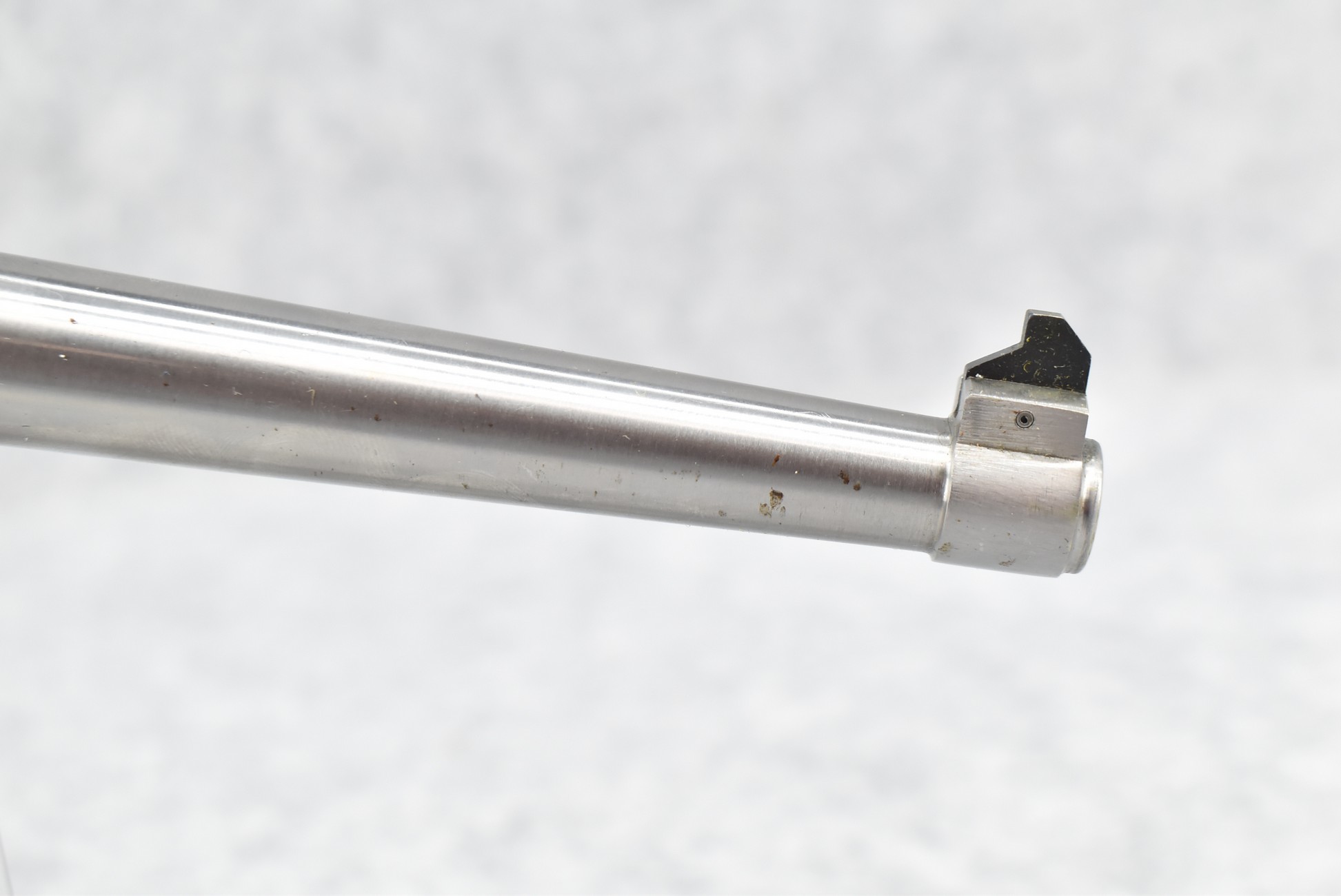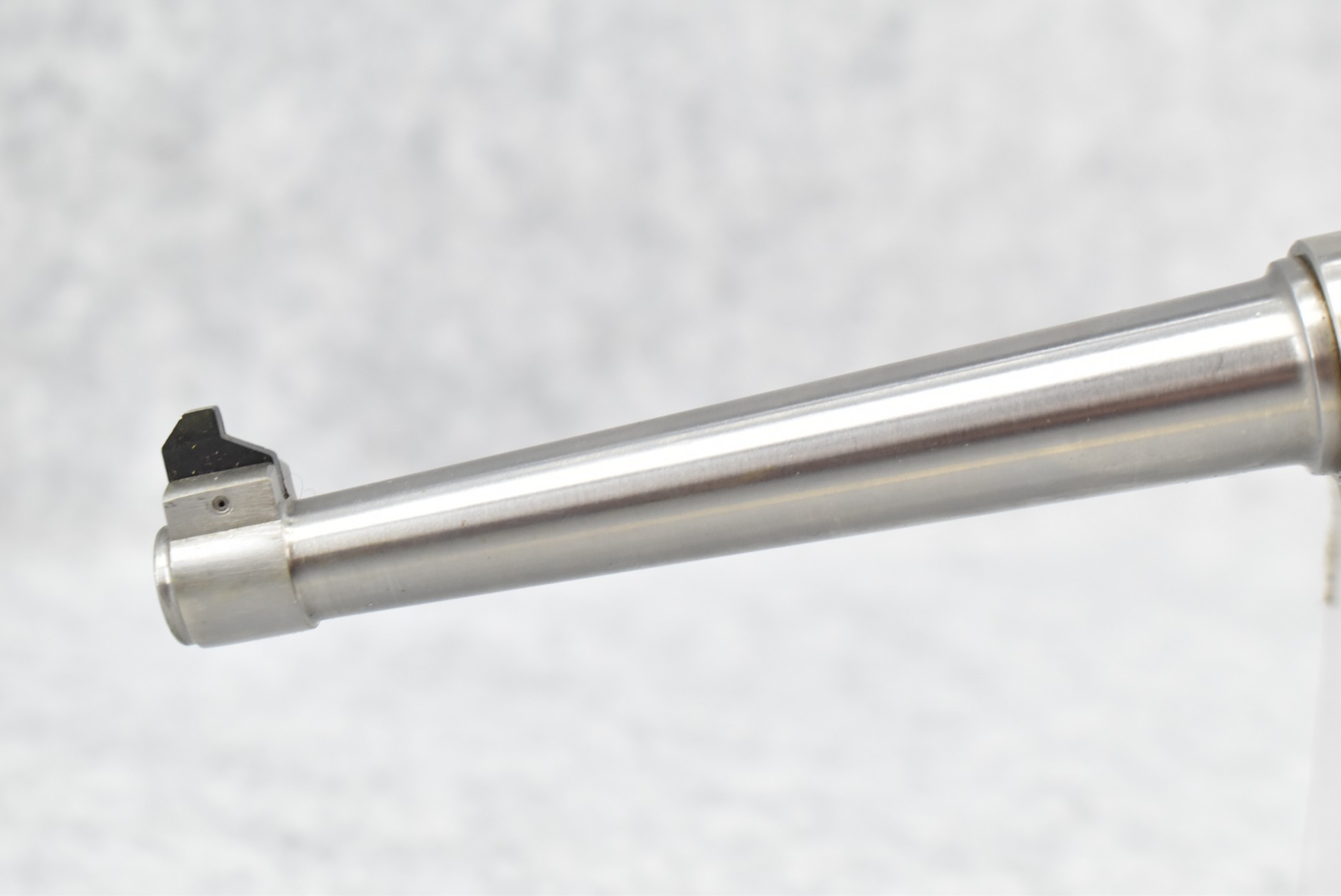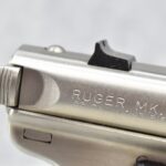 694R. Ruger – Mod. MK II – 22LR Cal. Semi-Auto Pistol – w/6” Barrel w/Blade Front and Rear Notch Sights – Stainless Finish – w/Factory Checkered Silver Eagle Plastic Grips – w/Factory Magazine – w/Factory Box