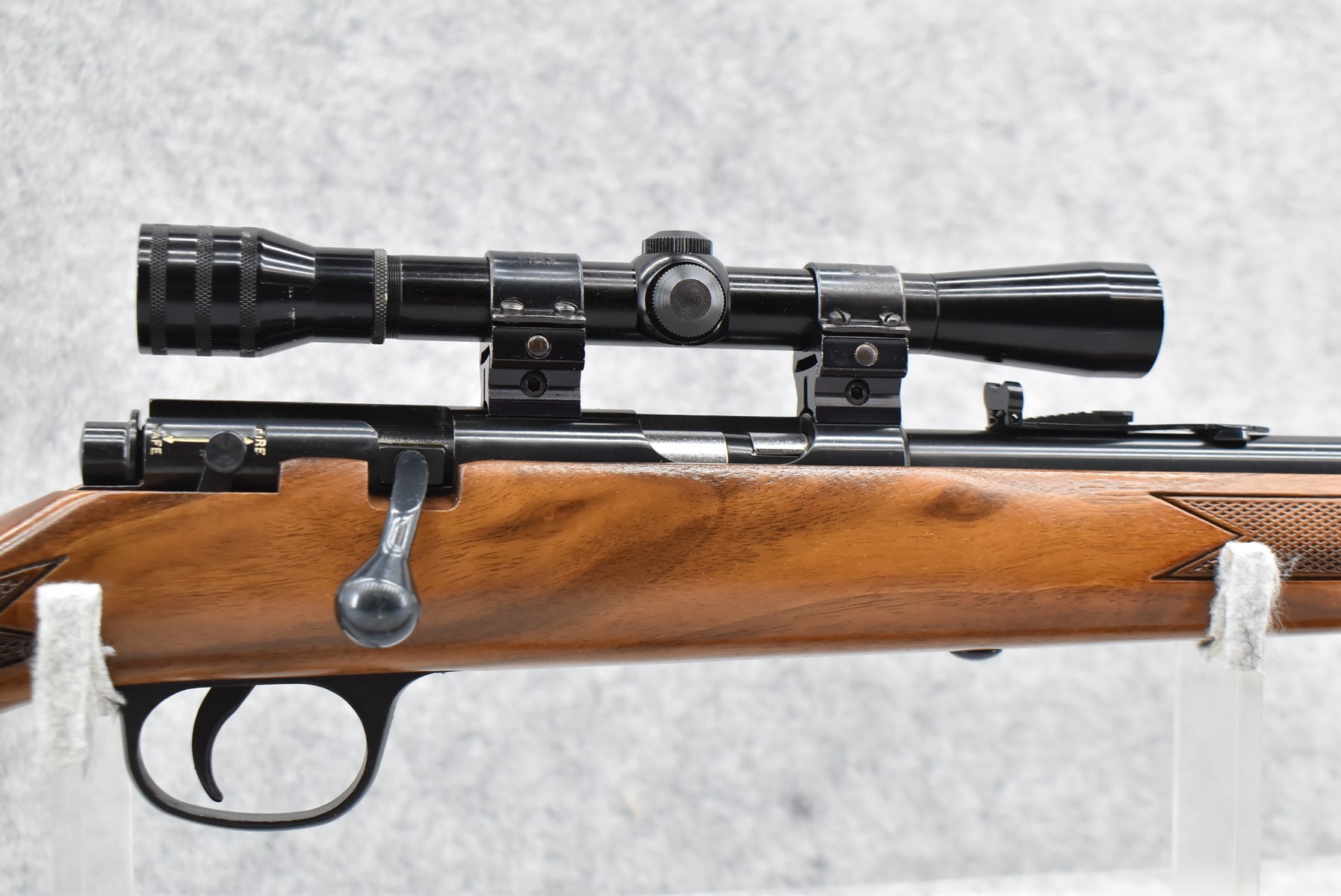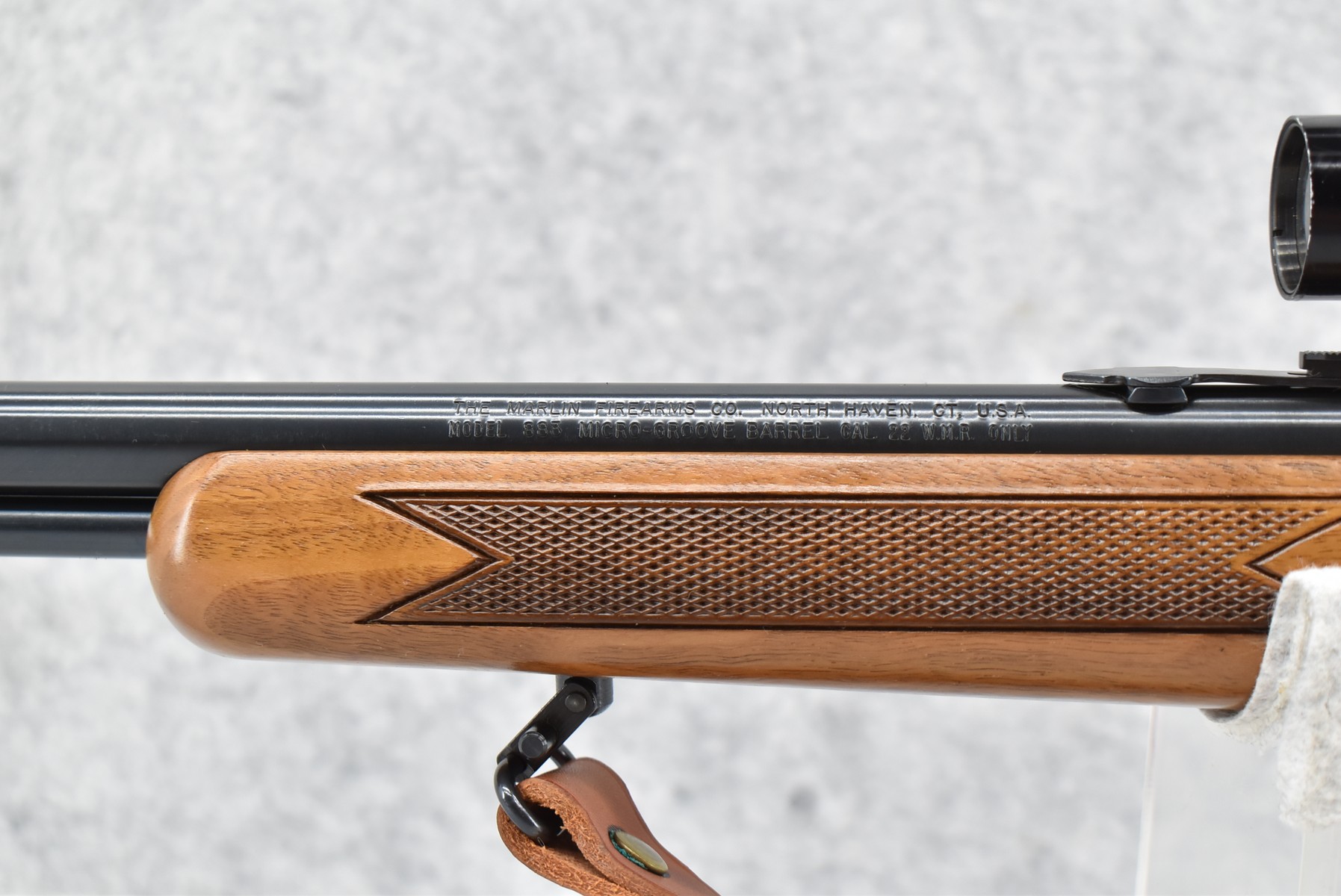 6R. Marlin – Mod. 883 – 22 Mag. Cal. Bolt Action Rifle – w/22” Barrel w/Hooded Front Blade & Rear Adj. Sights – w/Redfield 4x Scope & Mounts – Blued Finish – w/Checkered Pistol Grip Wood Stock w/Factory Butt Pad – w/Tubular Mag – w/Leather Sling