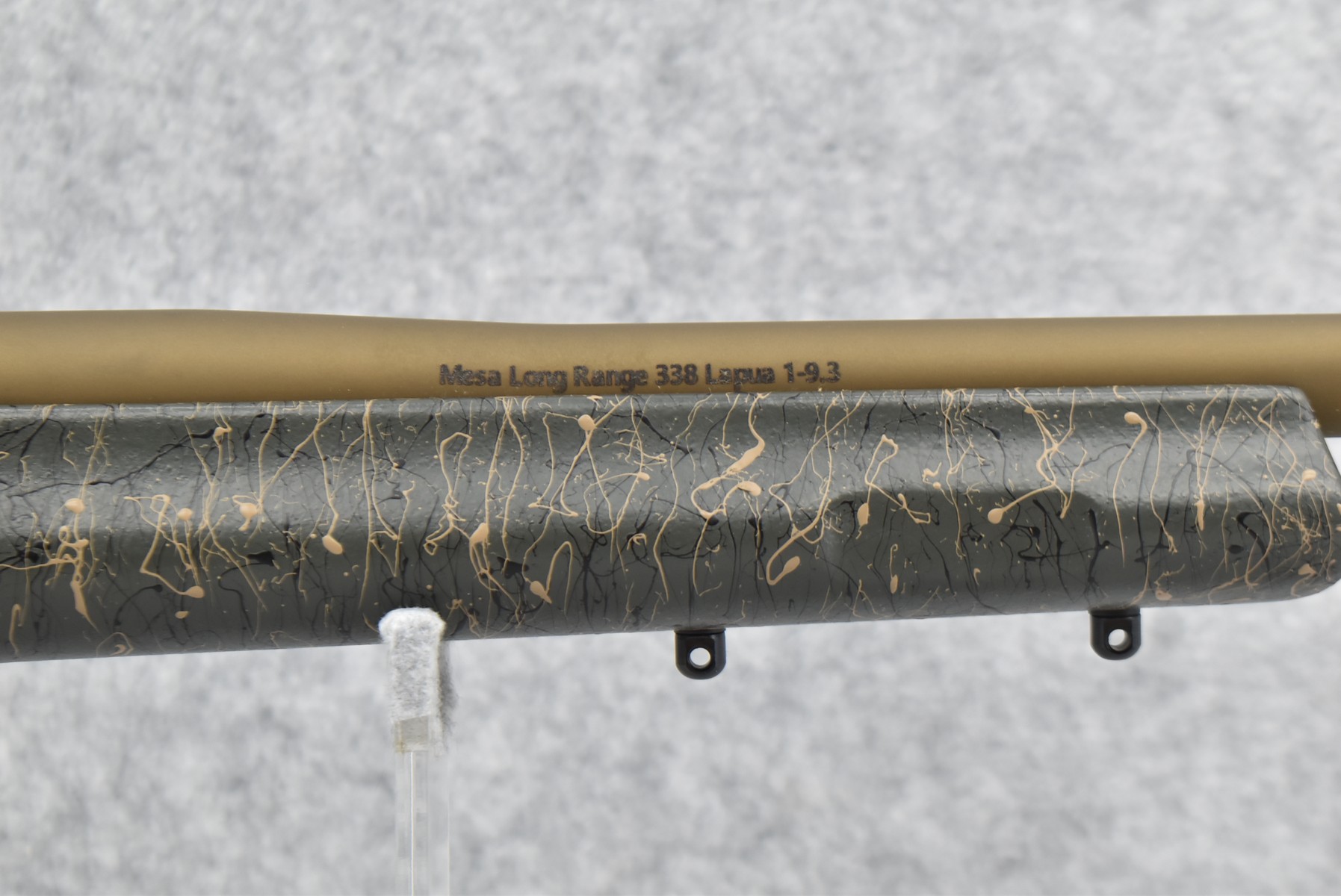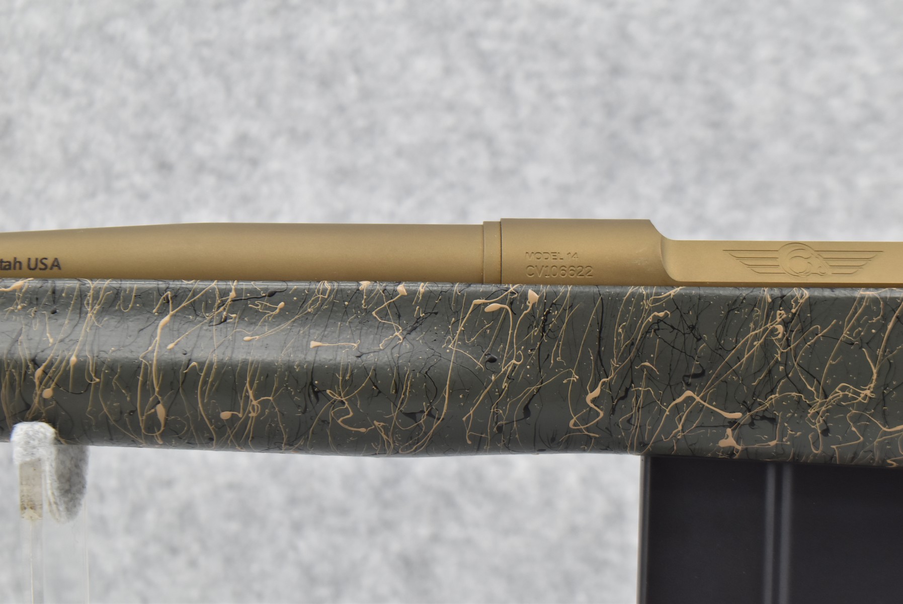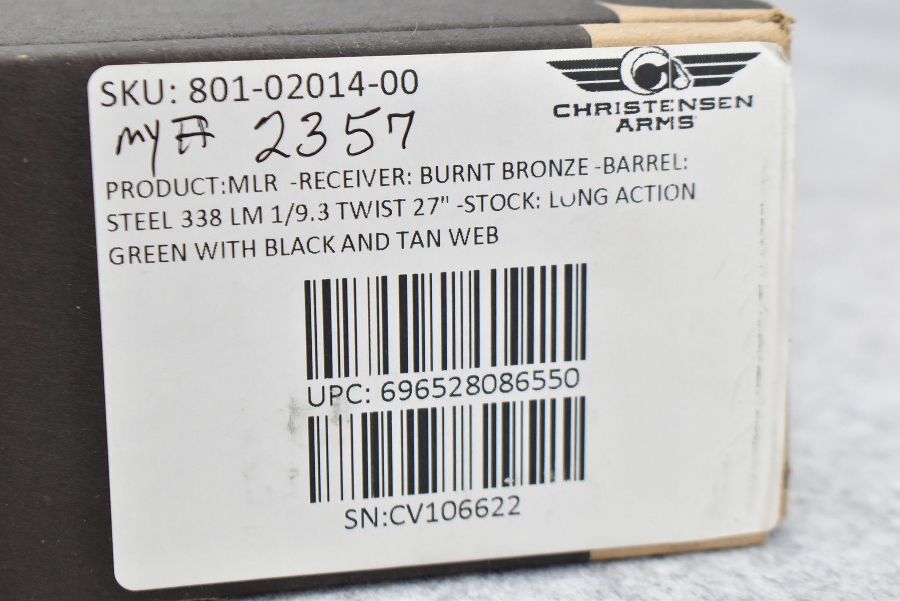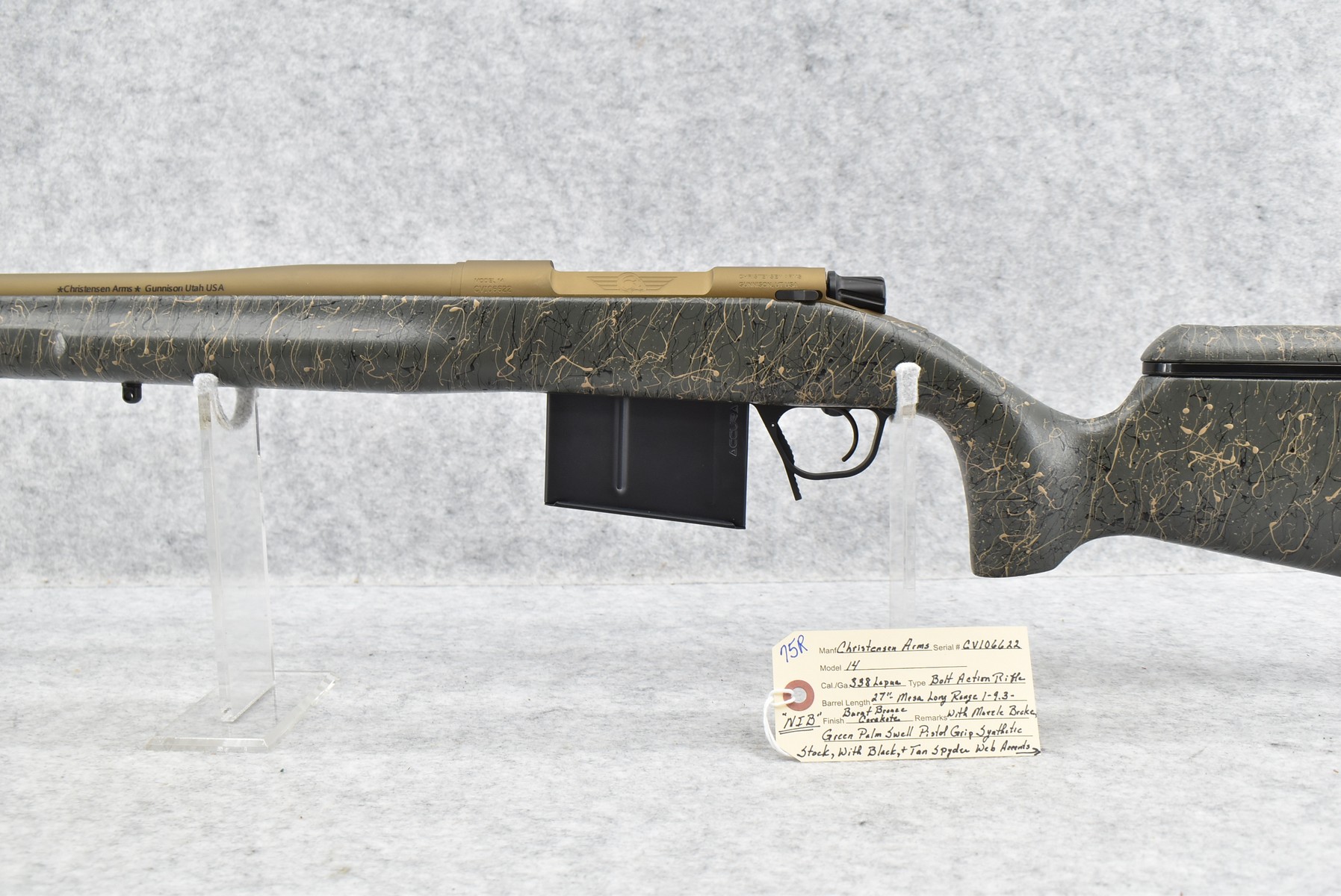 75R. Christensen Arms – Mod. 14 – 338 Lapua Cal. Bolt Action Rifle – w/27” Mesa Long Range 1-9.3 Barrel w/Muzzle Break – Burnt Bronze Cerakote Finish – w/Green Palm Swell Pistol Grip Synthetic Stock w/Black and Tan Spyder Web Accents, Adjustable Cheek Rest, and Black Rubber Butt Pad – w/1 Factory Detachable Magazine – Unfired w/Factory Box, Manual, and Accessories
