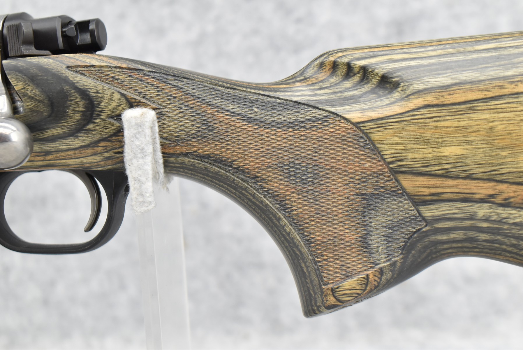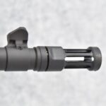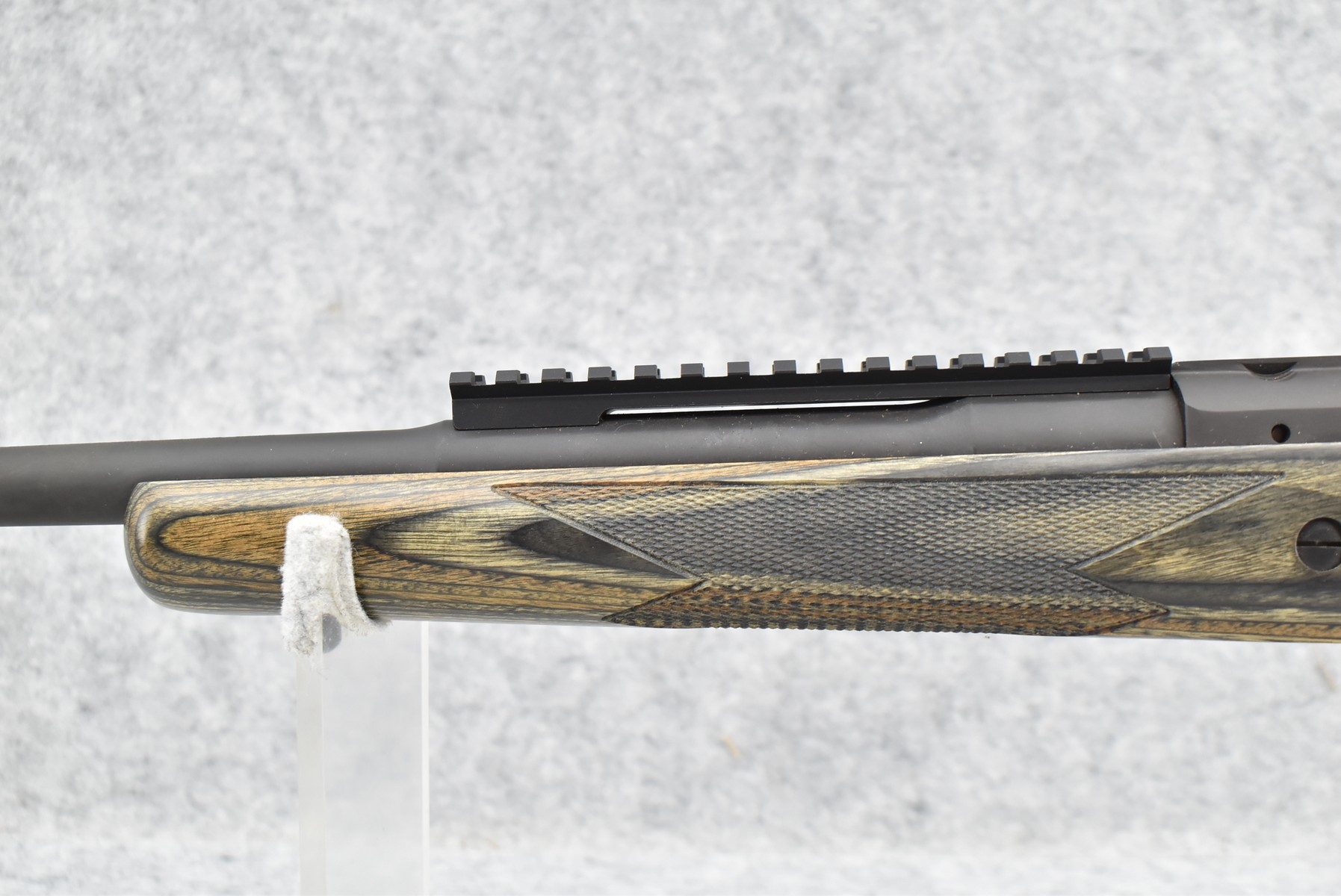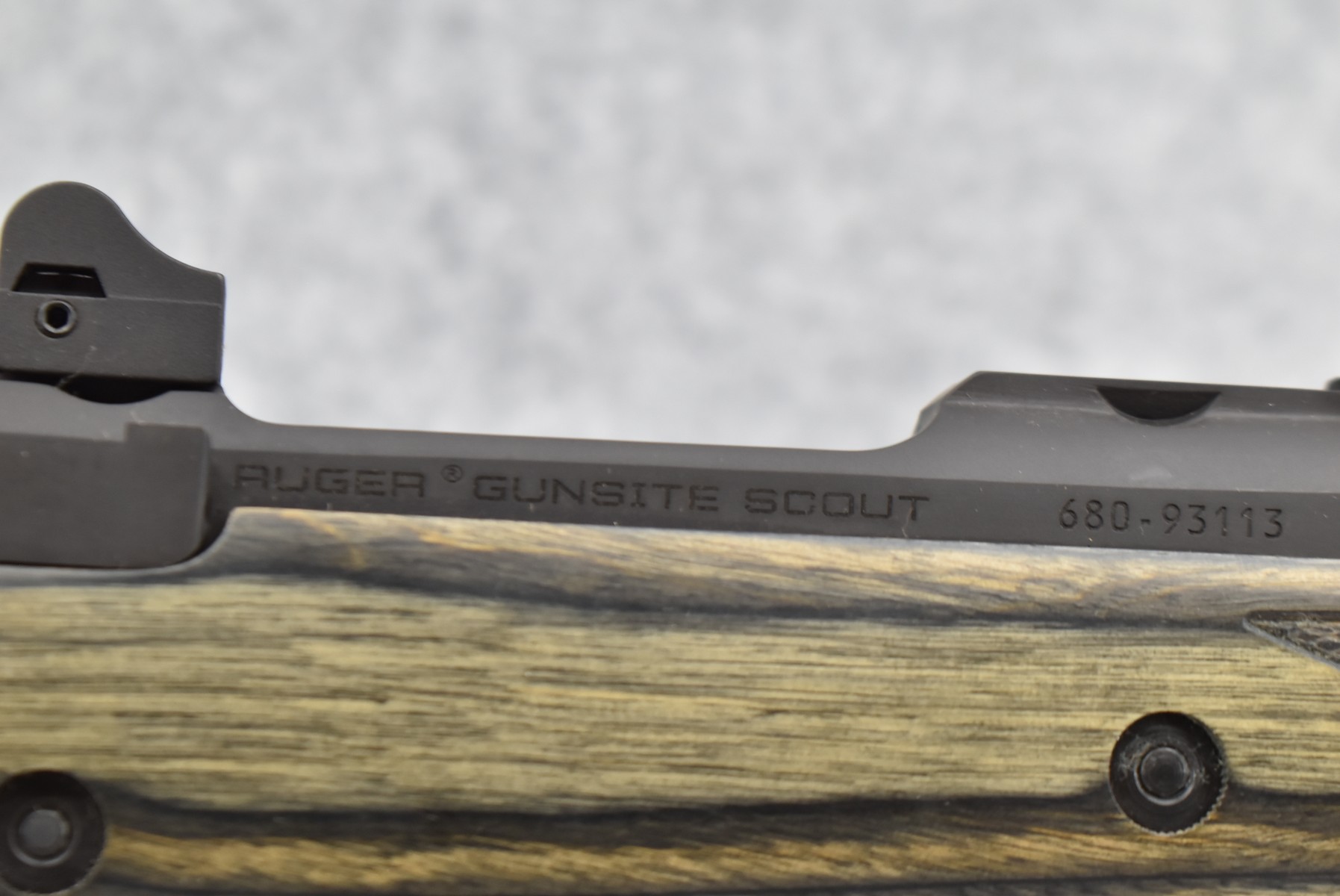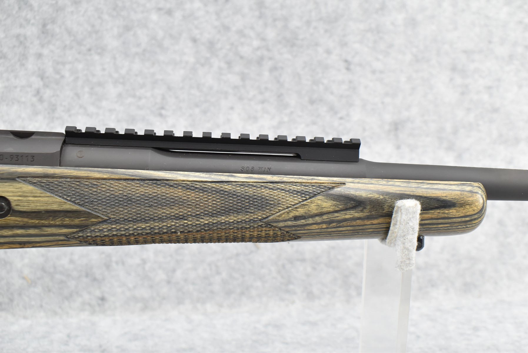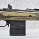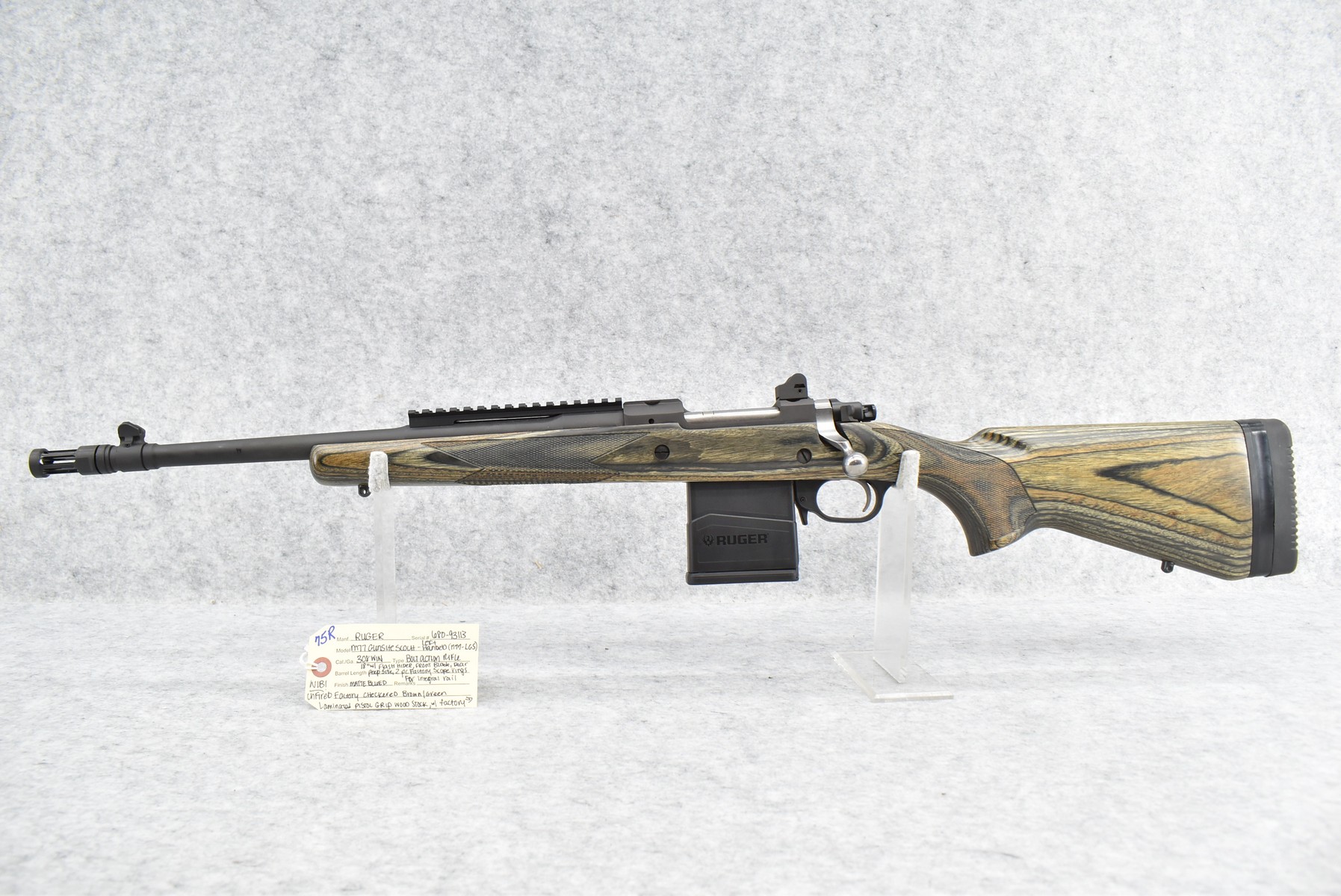 75R. Ruger – Mod. M77 Gunsite Scout Left-Handed (M77-LGS) – 308 Win Cal. Bolt Action Rifle – w/18” Barrel w/Flash Hider, Blade Front, and Rear Peep Sight, 2-Piece Factory Scope Rings, and Integral Rail Mounts – Matte Blued Finish w/Factory Checkered Green Laminated Pistol Grip Wood Stock w/Factory Recoil Pad – Unfired w/Factory Box, Manual, Lock, and 2 Factory Magazines
