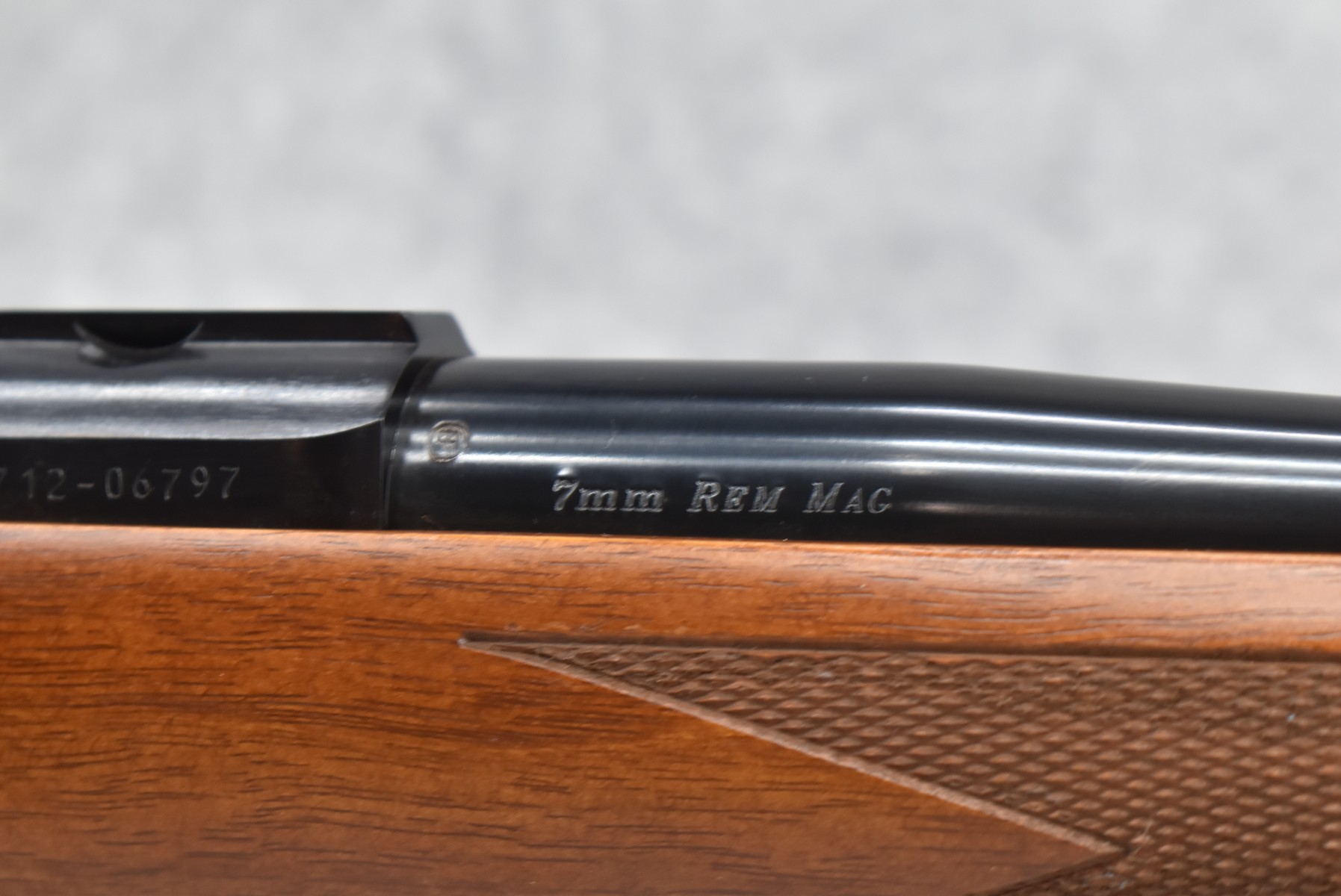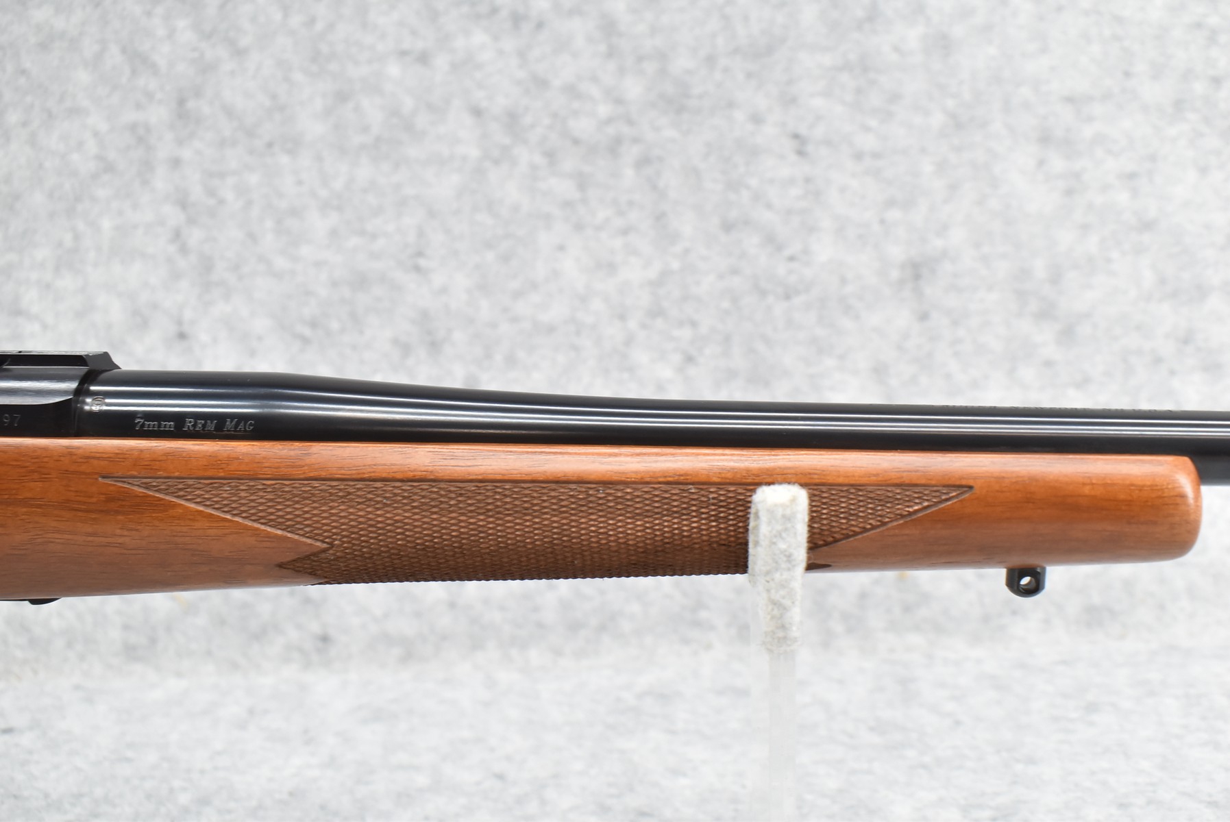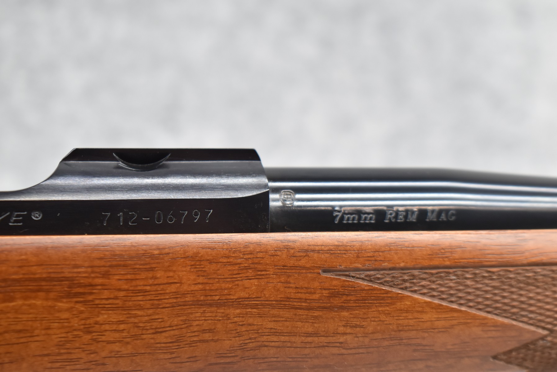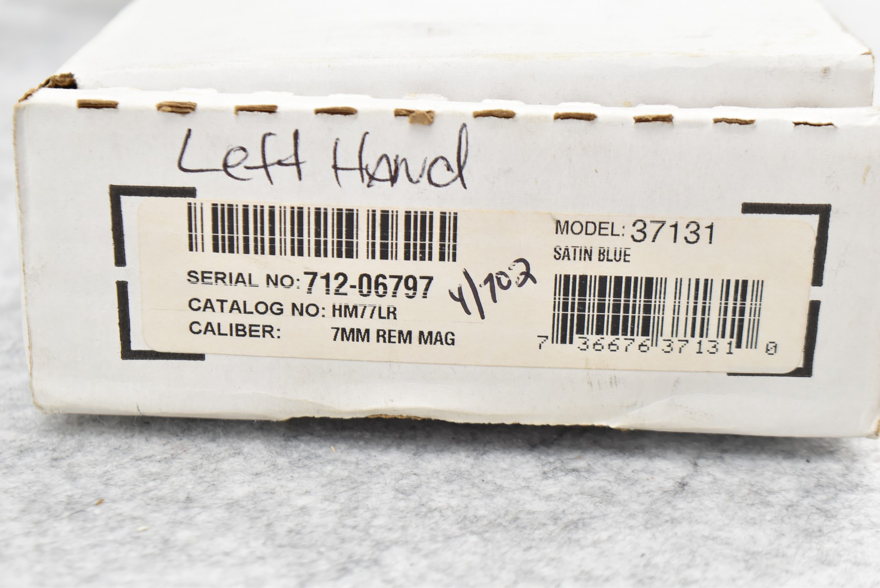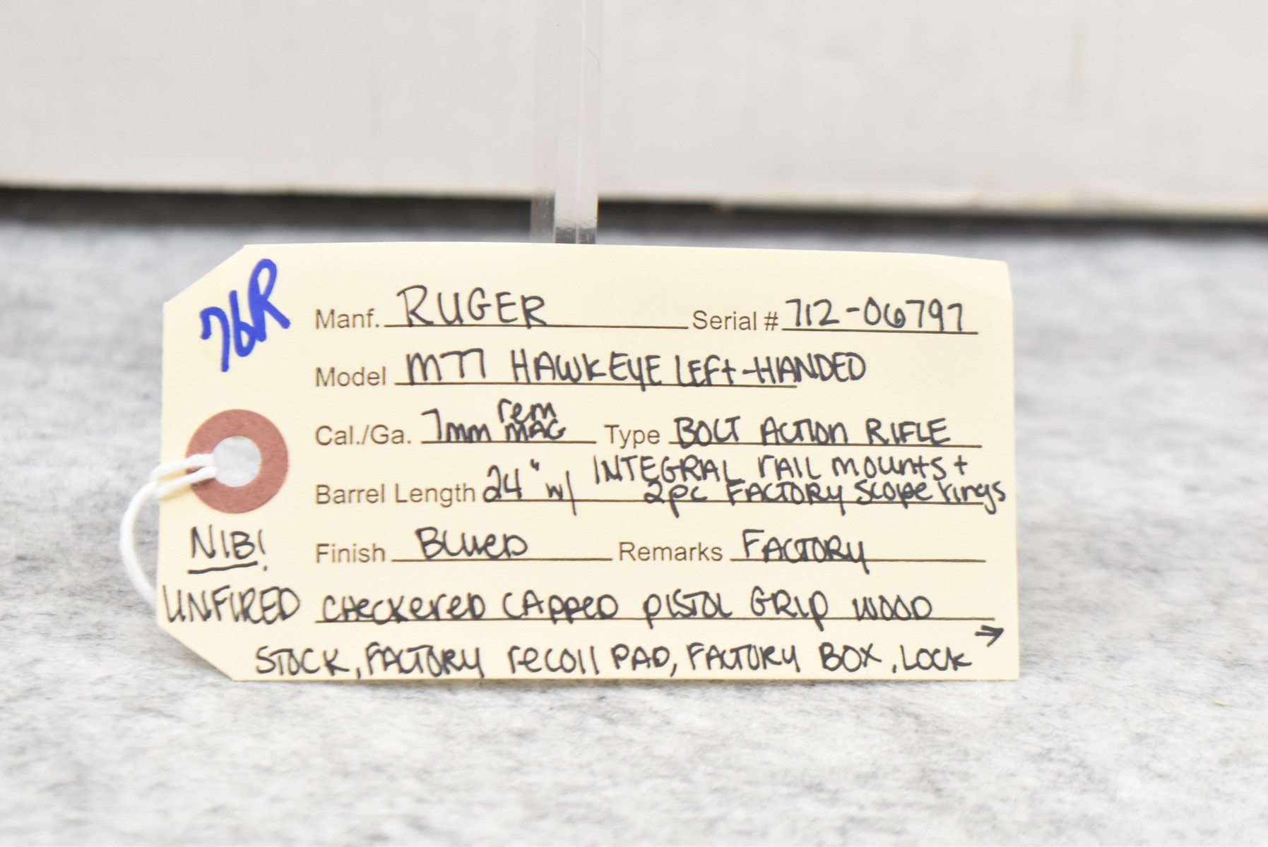 76R. Ruger – Mod. M77 Hawkeye Left-Handed – 7mm Rem. Mag. Cal. Bolt Action Rifle – w/24” Barrel w/2-Piece Factory Scope Rings and Integral Rail Mounts – Blued Finish – w/Factory Checkered Capped Pistol Grip Wood Stock w/Factory Recoil Pad – Unfired w/Factory Box, Manual, and Lock