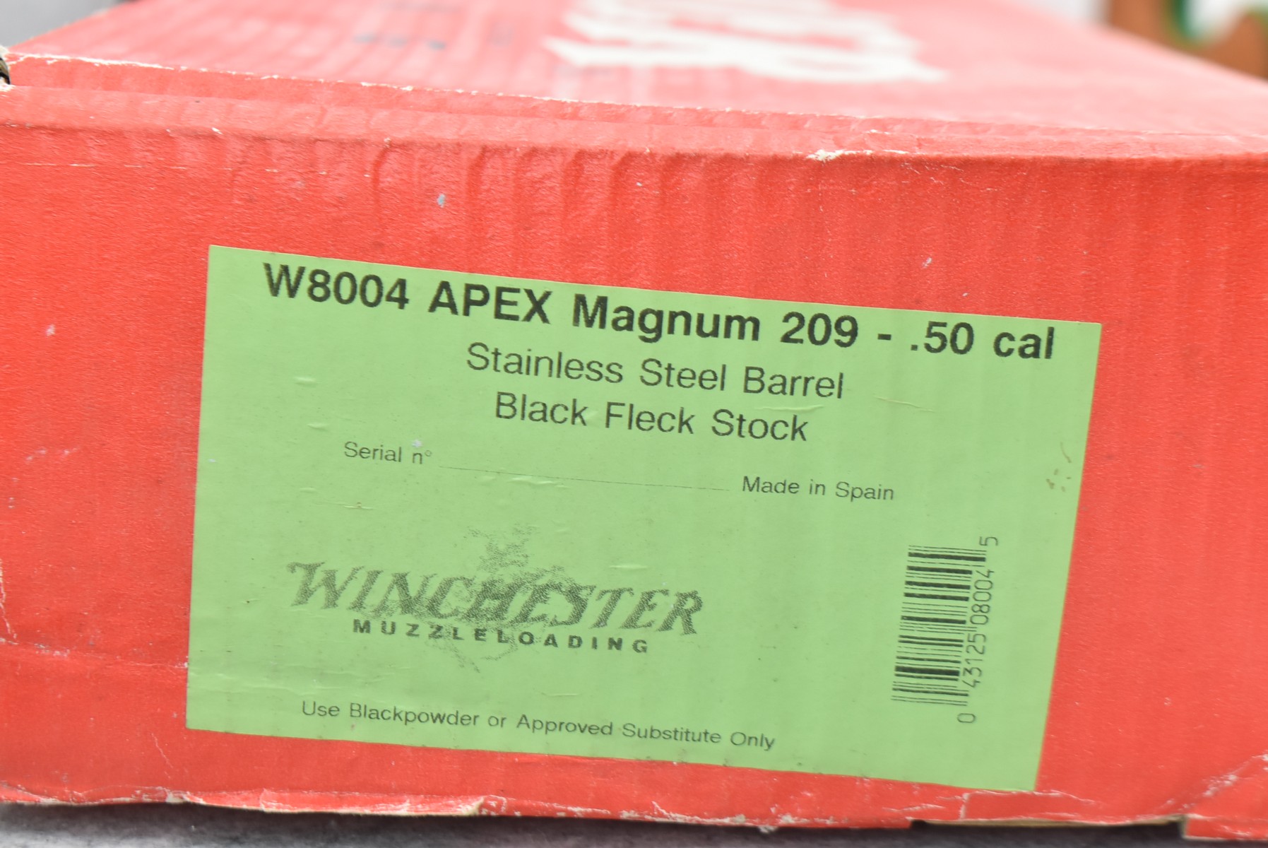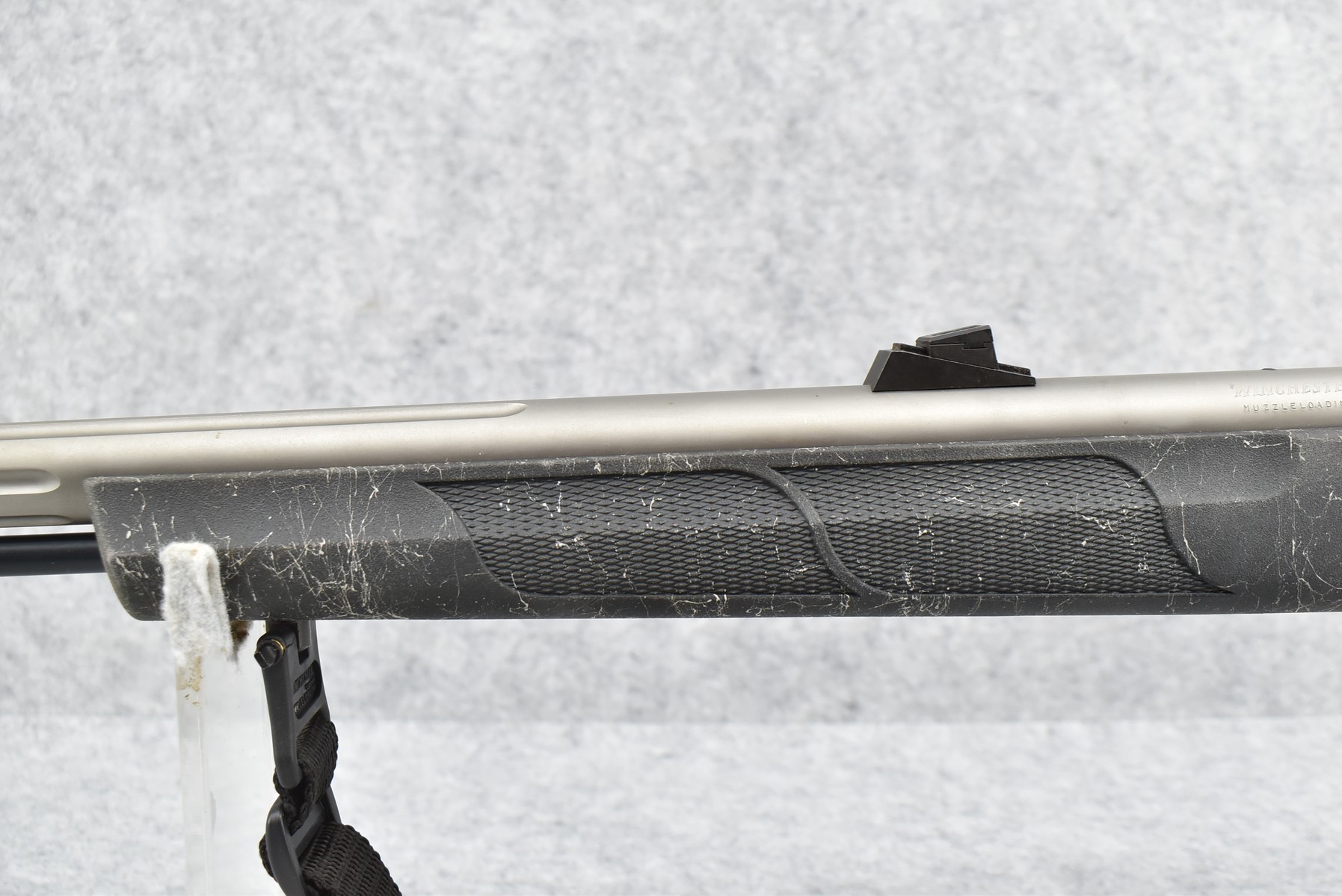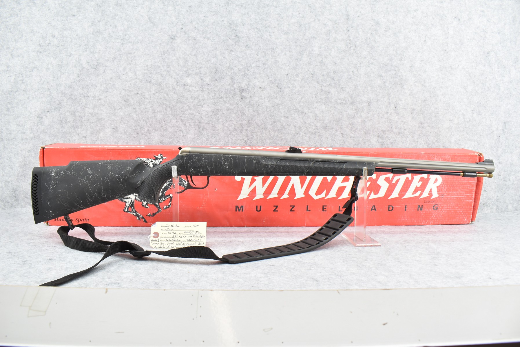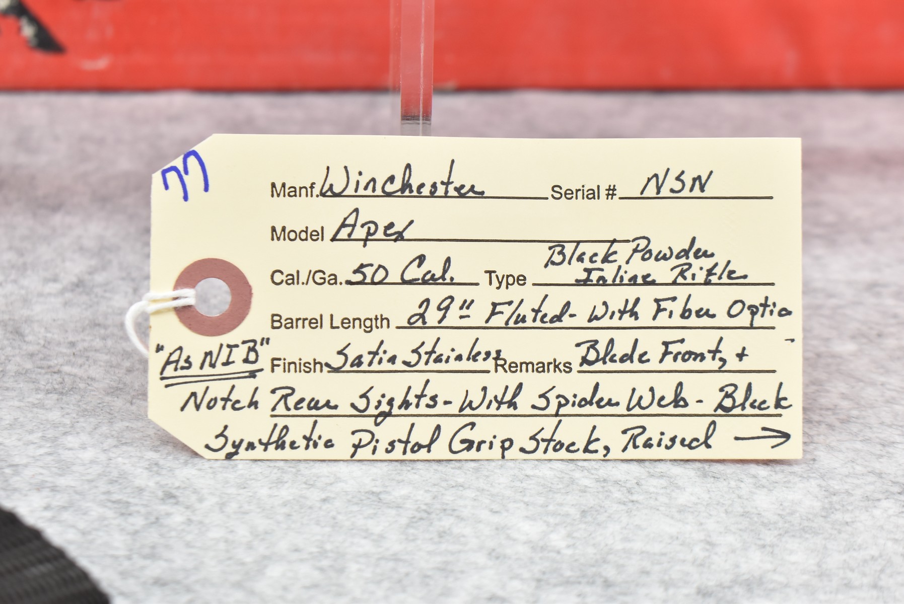 77. Winchester – Mod. Apex – 50 Cal. Black Powder Inline Rifle – w/29” Fluted Barrel w/Fiber Optic Blade Front & Notch Rear Sights – Satin Stainless Finish – w/Spider Web Black Synthetic Pistol Grip Stock w/Raised Cheek Piece w/Factory Butt Pad – As New w/Factory Box, Accessories & Rubber Sling
