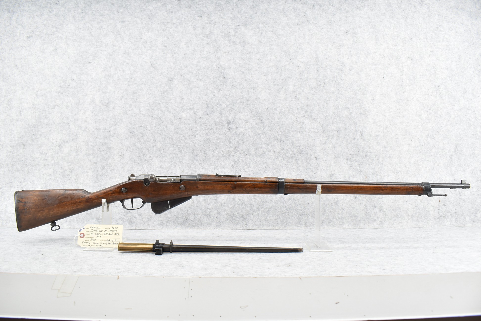 774KR. French (St. Etienne Arsenal) – Berthier Mod. 1907/15 – 8mm Lebel Cal. Bolt Action Rifle – w/31.5” Barrel – Blued Finish – w/Straight Grip Full Wood Military Stock w/Metal Butt Plate – w/Original Bayonet