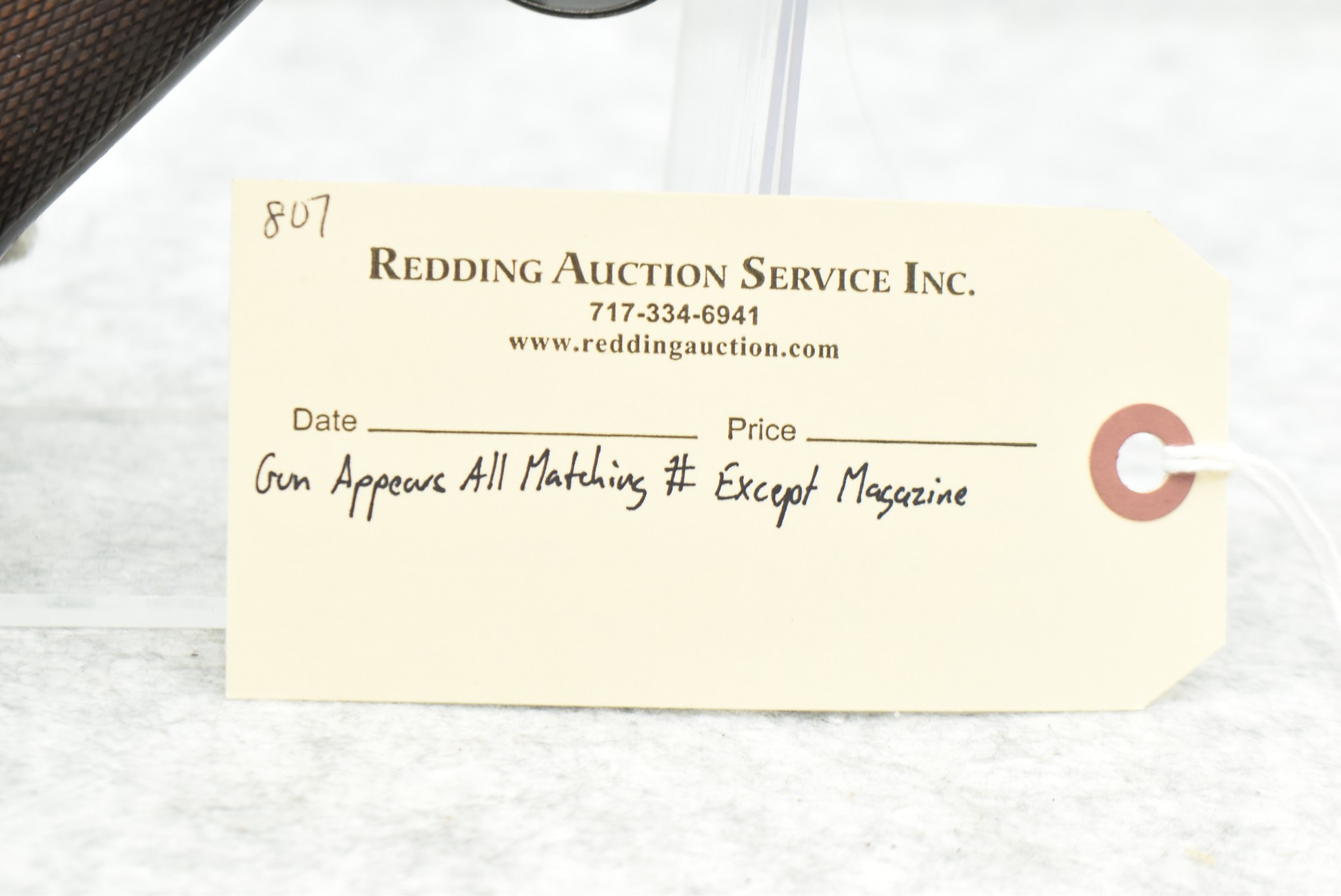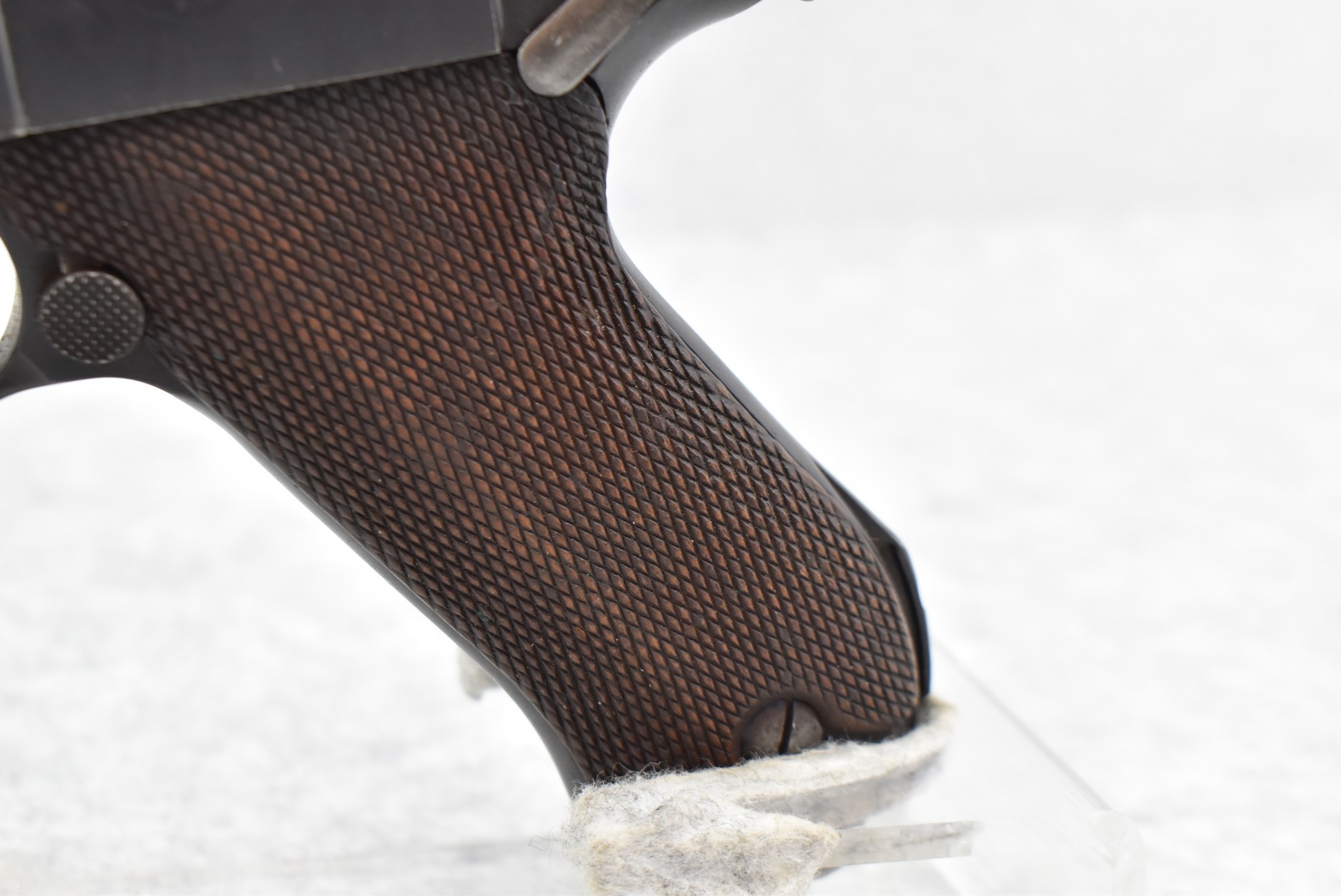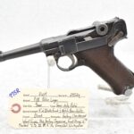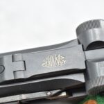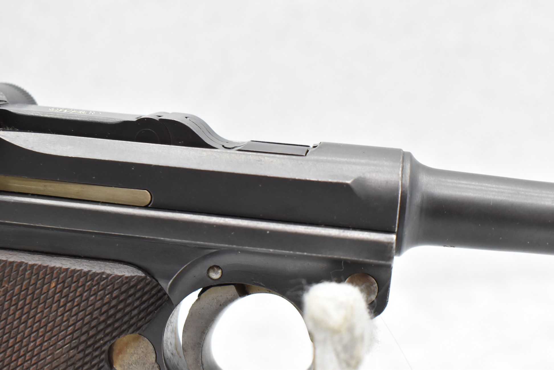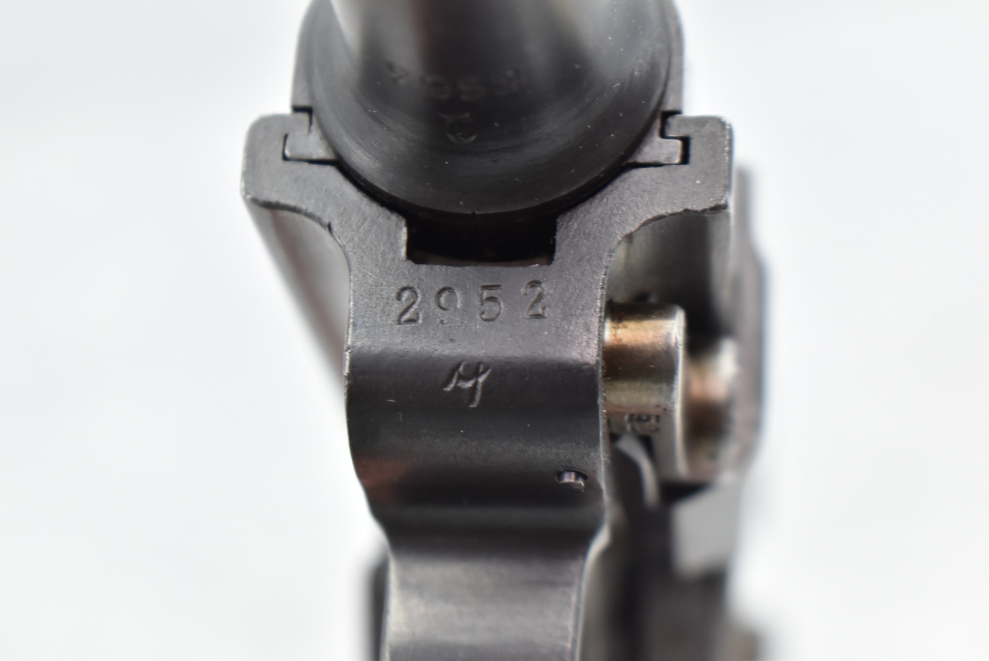 775R. DWM – Mod. P-08 Police Luger – 9mm Semi-Auto Pistol – w/4” Barrel w/Blade Front & Notch Rear Sights – Blued Finish – w/Factory Checkered Wood Grips – w/Factory Magazine – Front Strap is Marked “S.D. III 5.” For Deuseldorf Schutzpolizei – Gun Appears All Matching Numbers Except Magazine