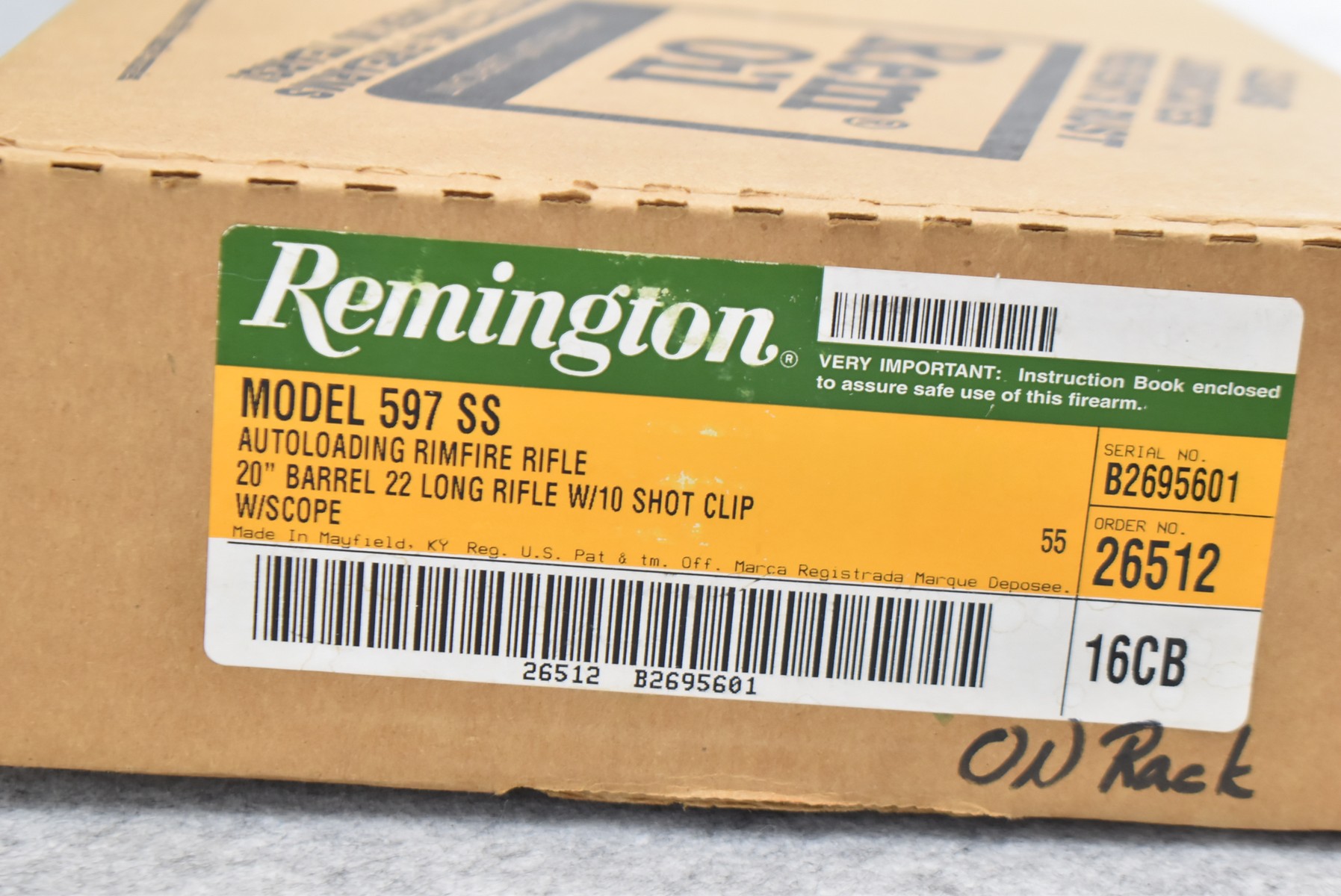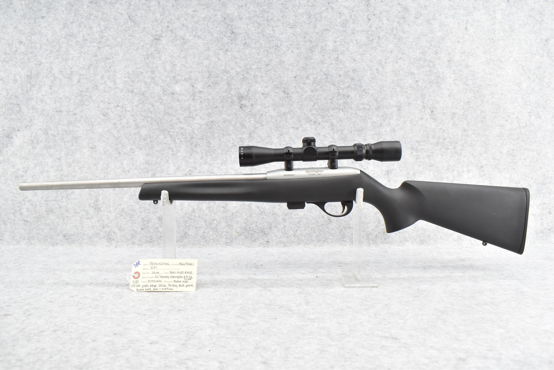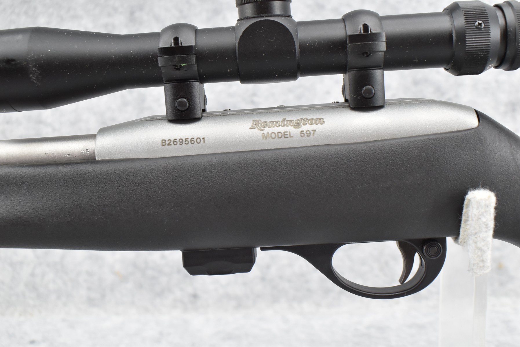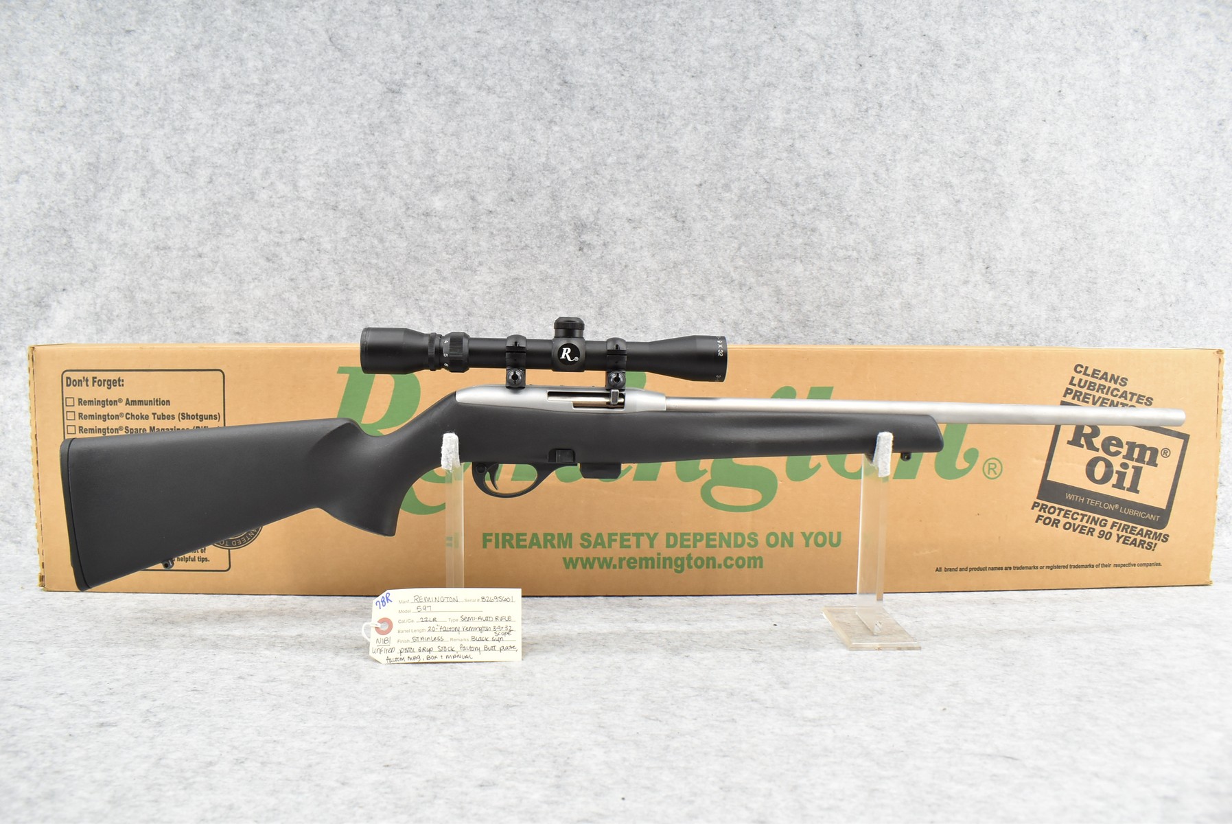 78R. Remington – Mod. 597 – 22LR Cal. Semi-Auto Rifle – w/20” Barrel – Stainless Finish – w/Black Synthetic Pistol Grip Stock w/Factory Butt Plate – w/Factory Remington 3-9×32 Scope – Unfired w/Factory Box, Manual, and Factory Magazine