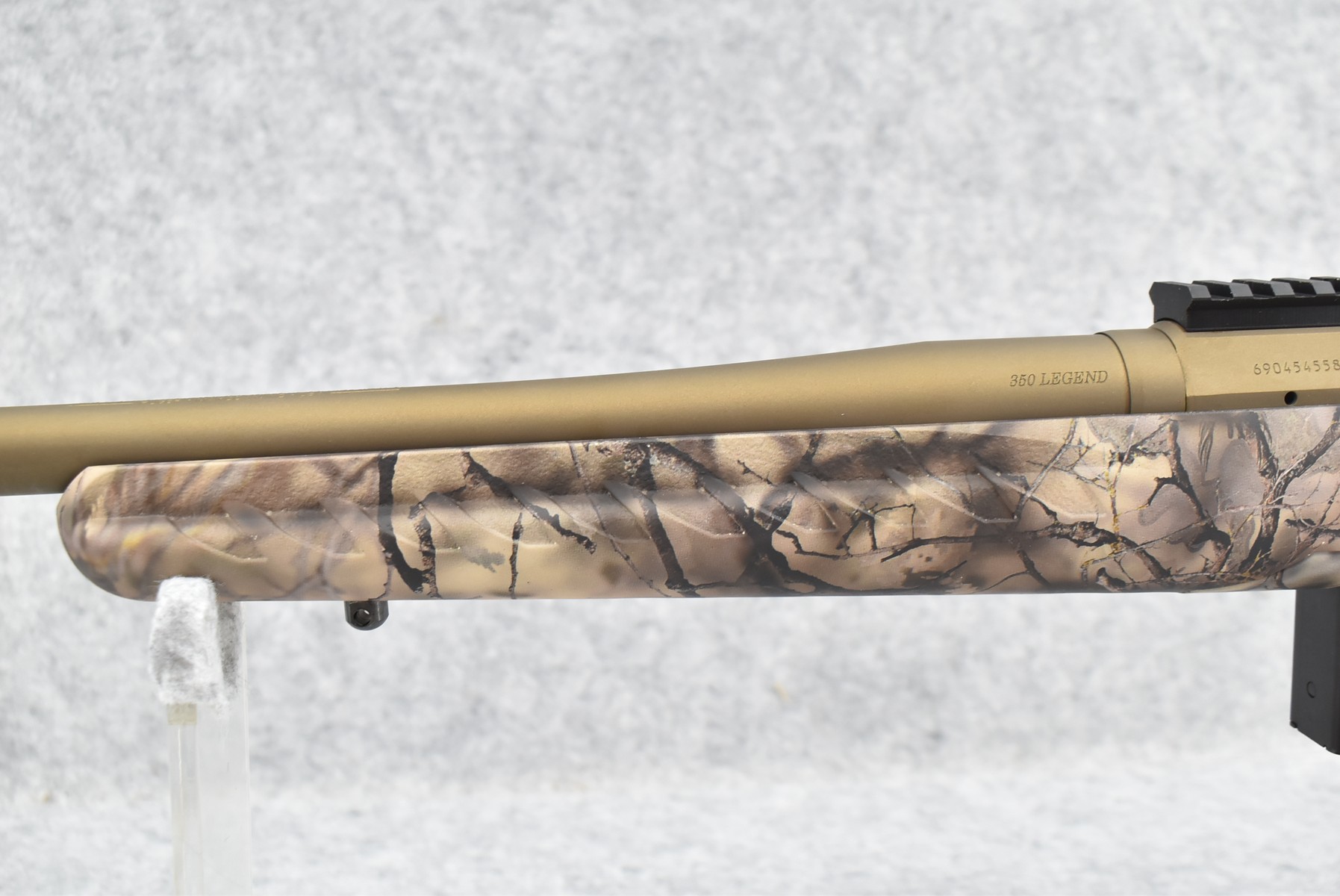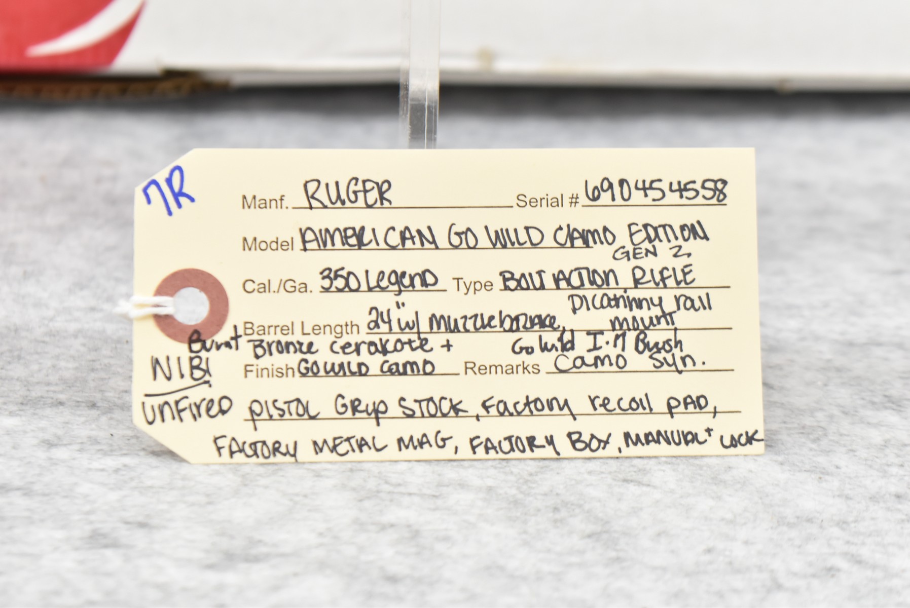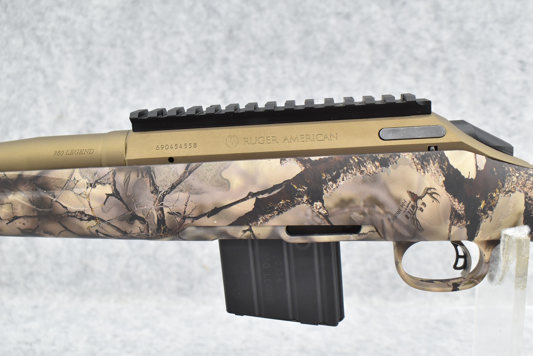 7R. Ruger – Mod. American – 350 Legend Cal. Bolt Action Rifle – w/24” Barrel w/Muzzle Break and Picatinny Scope Rail – Burnt Bronze Cerakote Camoed Finish – w/Capped Synthetic Pistol Grip Go Wild 1-M Brush Stock w/Factory Recoil Pad – Unfired w/Factory Box, Manual, Lock, and Factory Magazine