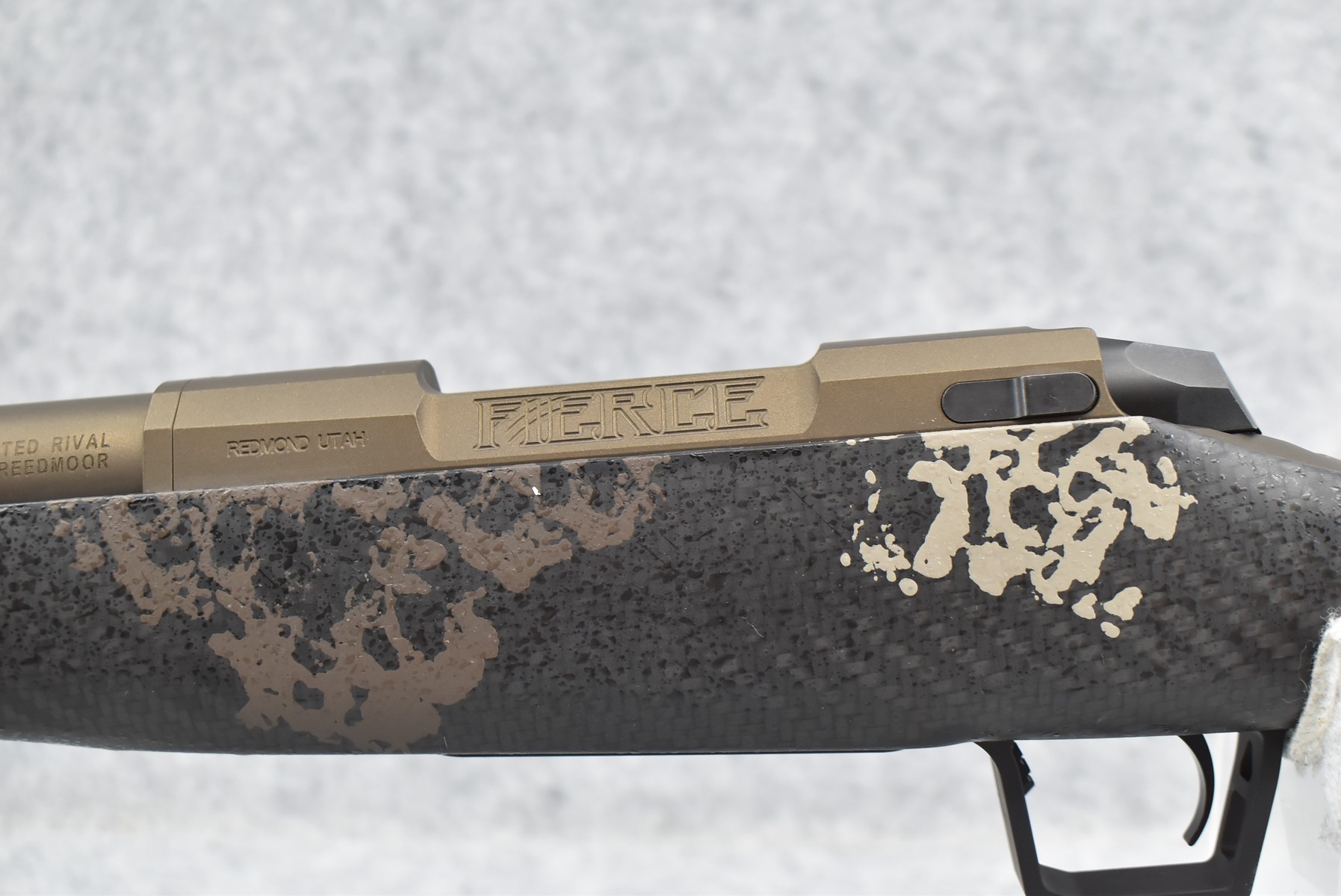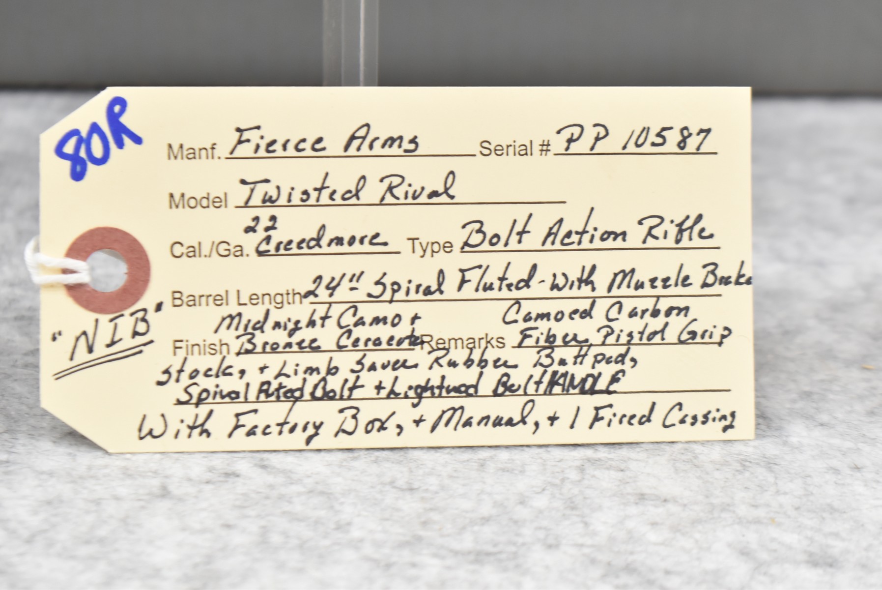 80R. Fierce Arms – Mod. Twisted Rival – 22 Creedmoor Cal. Bolt Action Rifle – w/24” Spiral Fluted Barrel w/Muzzle Break – Midnight Camo and Bronze Cerakote Finish – w/Camoed Carbon Fiber Pistol Grip Stock w/Limb Saver Rubber Butt Pad – w/Spiral Fluted Bolt and Lightened Bolt Handle – Unfired w/Factory Box, Manual, and 1 Fired Casing