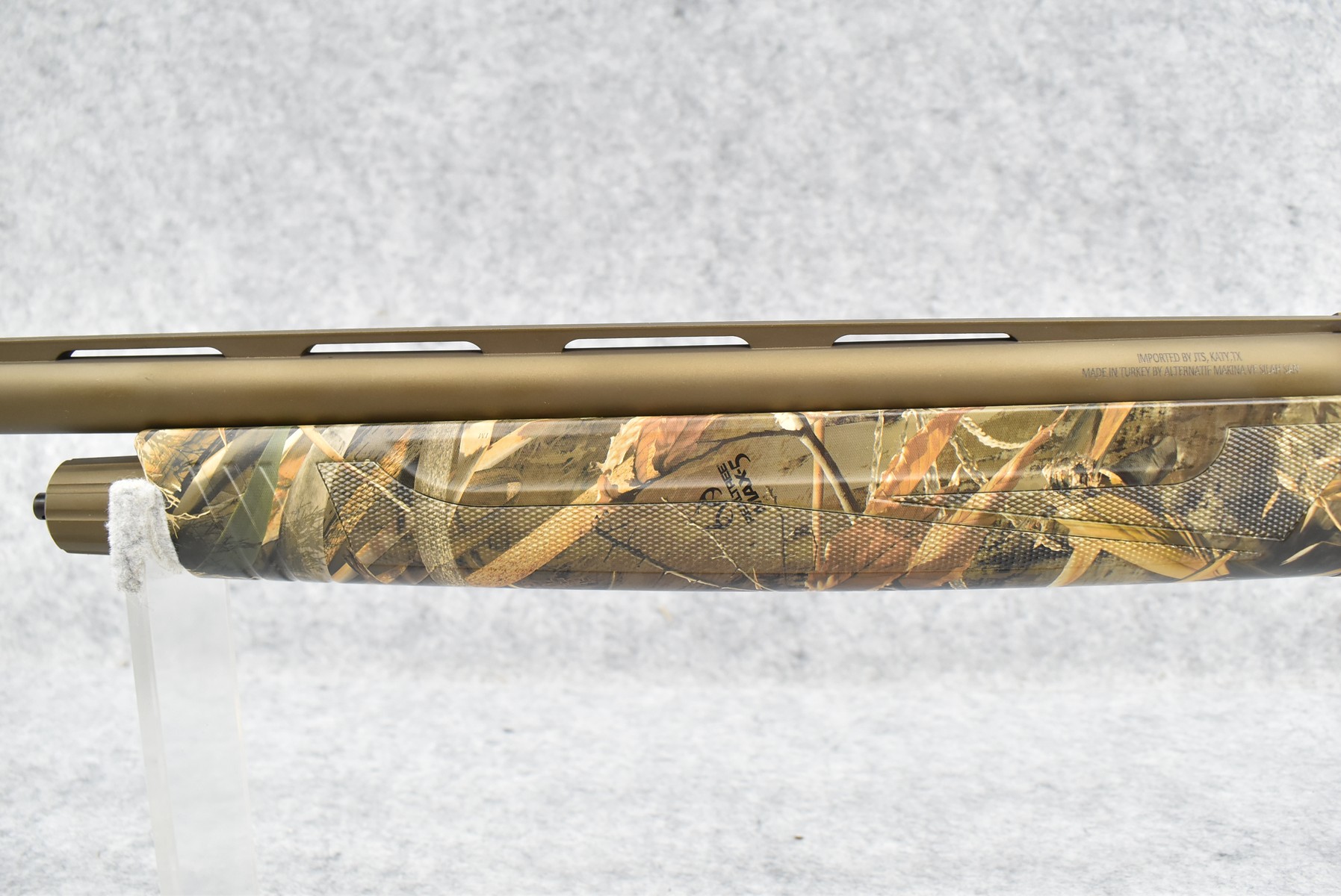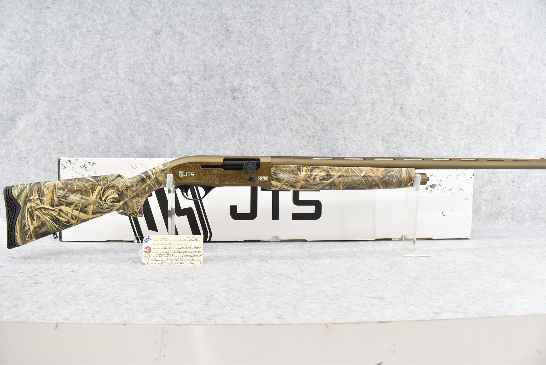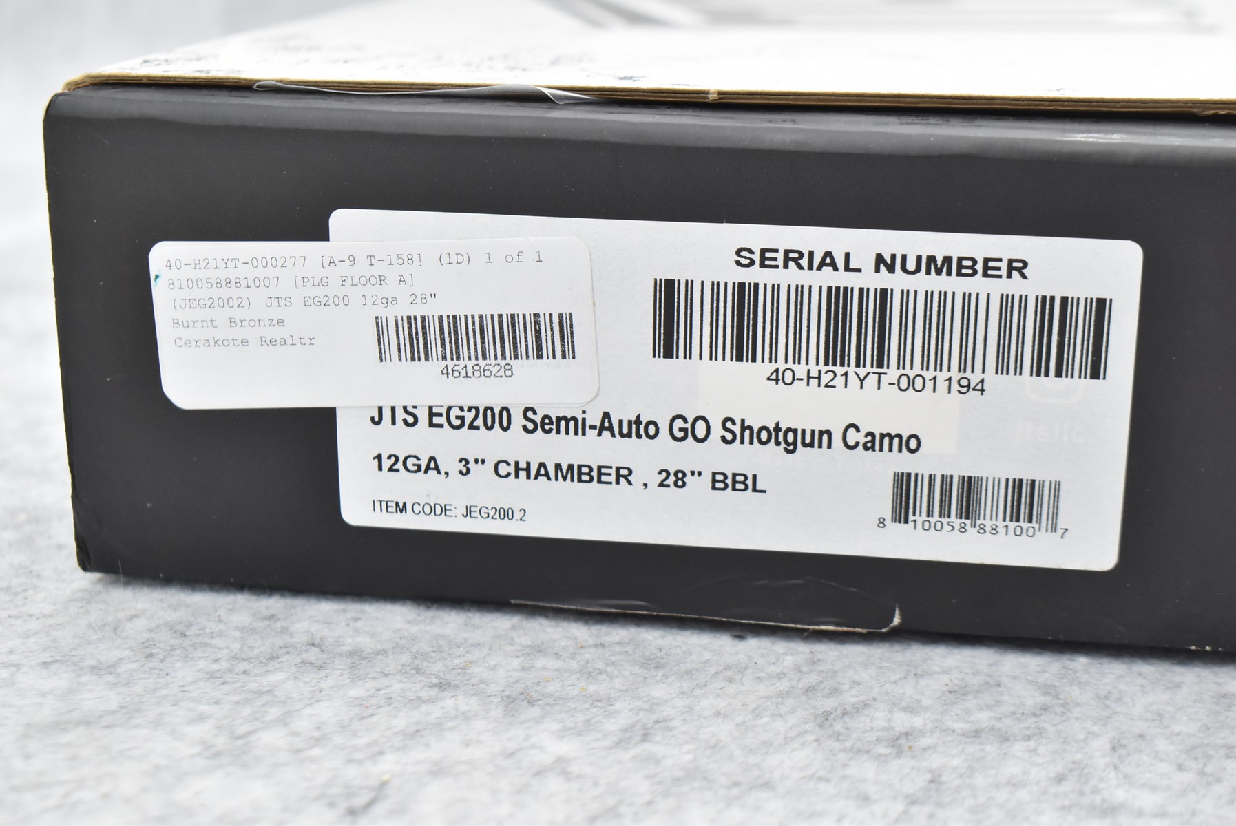 82R. J.T.S. – Mod. EG200 – 12ga. 3” Semi-Auto Shotgun – w/28” Vent Rib Barrel w/Fiber Optic Bead Sight – Cerakote Bronze Realtree Max 5 Finish – w/Camoed Synthetic Checkered Pistol Grip Stock and Forearm w/Factory Black Rubber Butt Pad – Unfired w/Factory Box, Manuals, and Chokes
