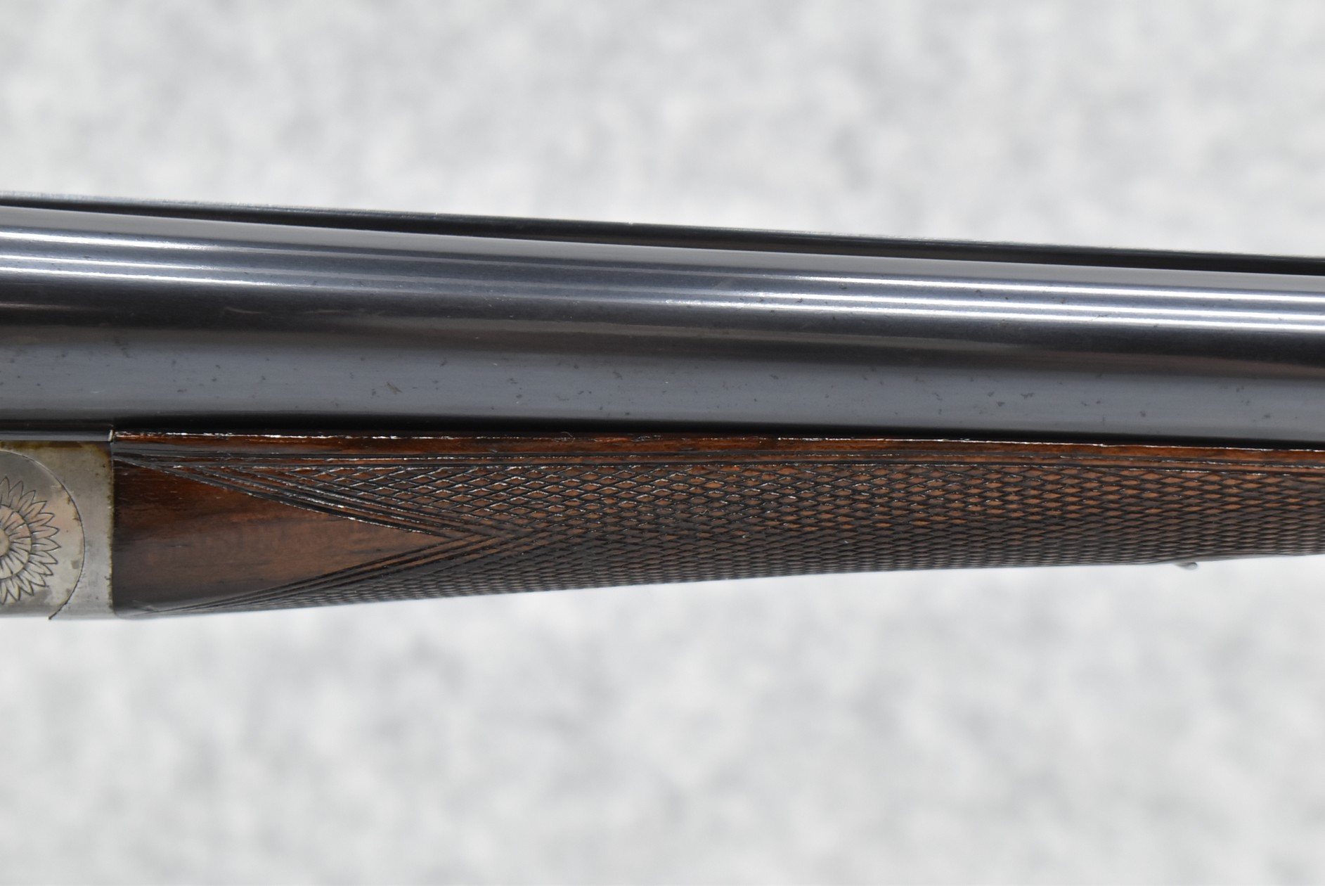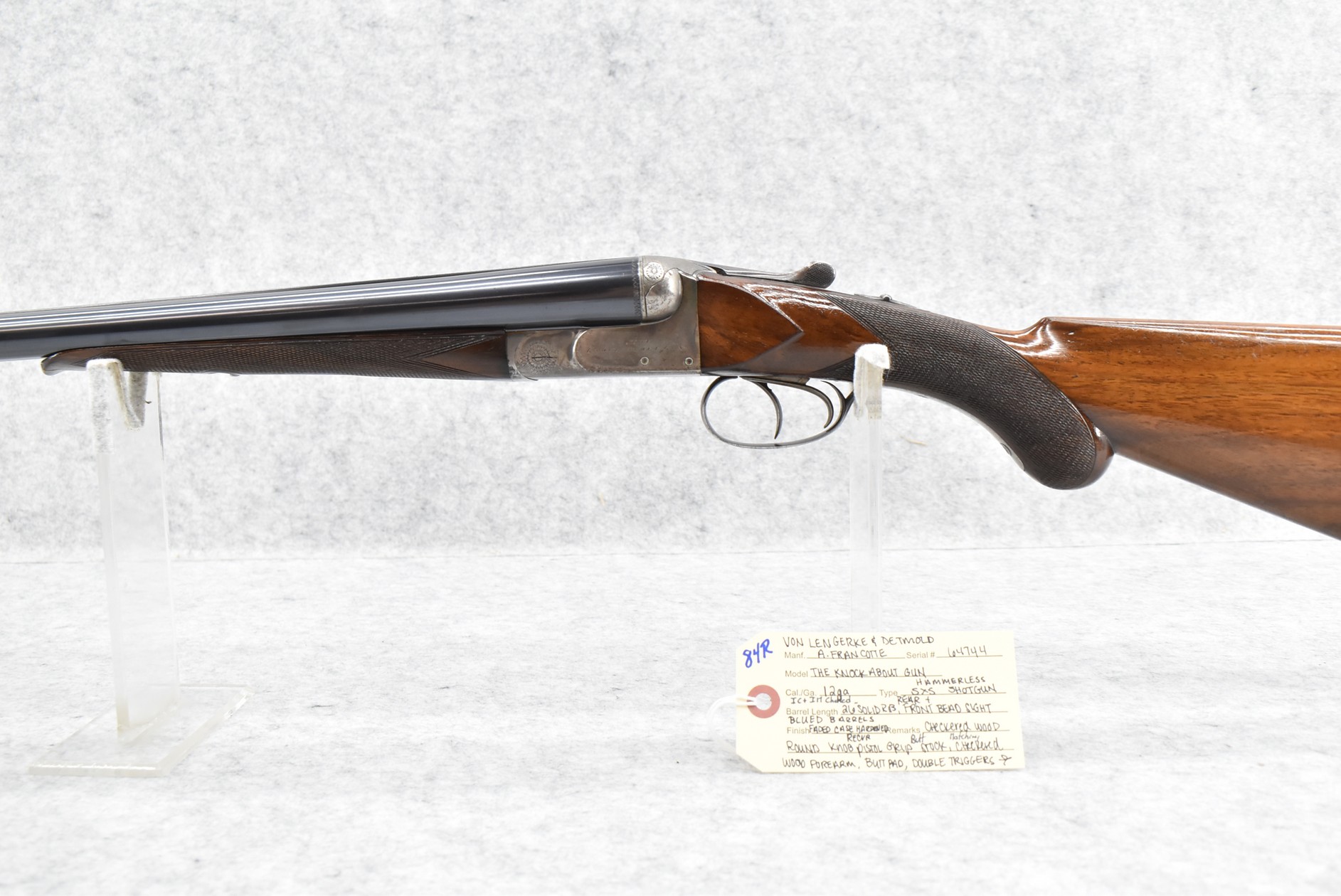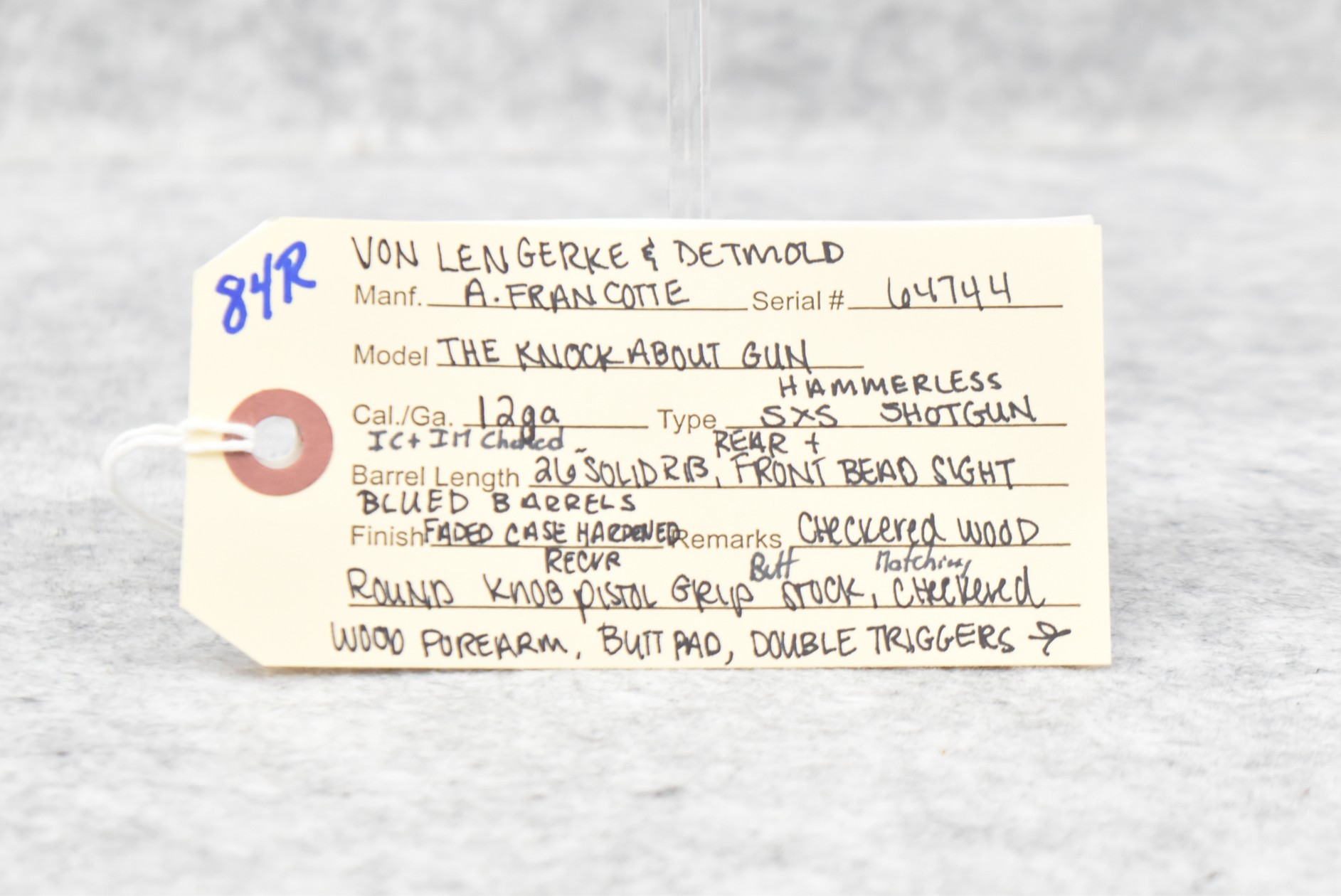84R. Von Lengerke & Detmold/A. Francotte – Mod. The Knock About Gun – 12ga. Hammerless Double Barrel Shotgun – w/26” IC & IM Choked, Solid Rib Blued Finish Barrels Marked “Francotte Chokebore” w/Rear & Front Bead Sights – w/Case Hardened Receiver – w/Checkered Wood Round Knob Pistol Grip Butt Stock & Matching Checkered Wood Forearm w/Silvers Butt Pad – w/Double Triggers – w/Various Proof Marks