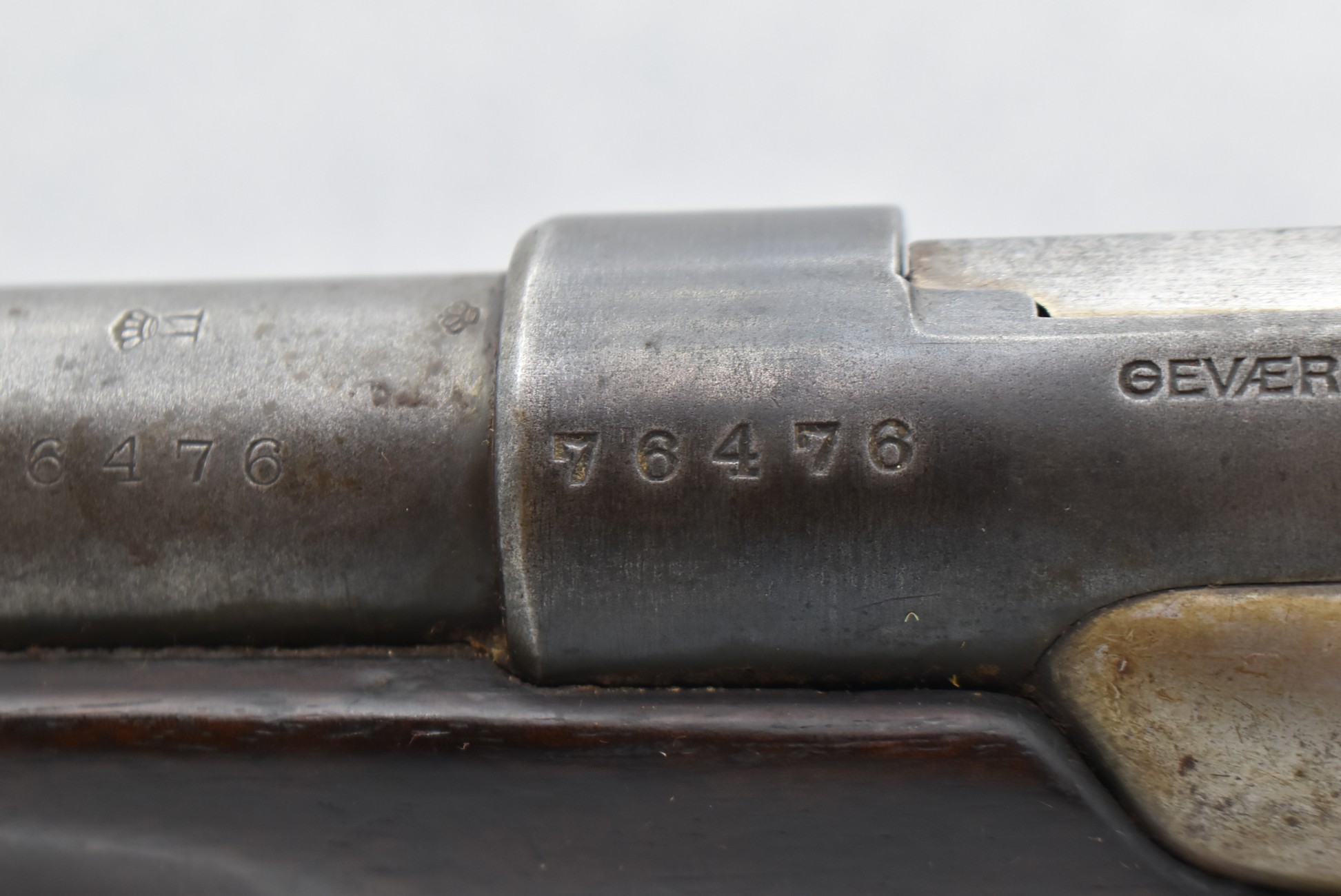 887R. Danish – Mod. M89 Krag – 8x58mm Cal. Bolt Action Military Rifle – w/33” Barrel w/Blade Front & Adj. Rear Ladder Sights – Gray Finish – w/Straight Grip Full Wood Military Stock w/Metal Butt Plate – Dated 1911