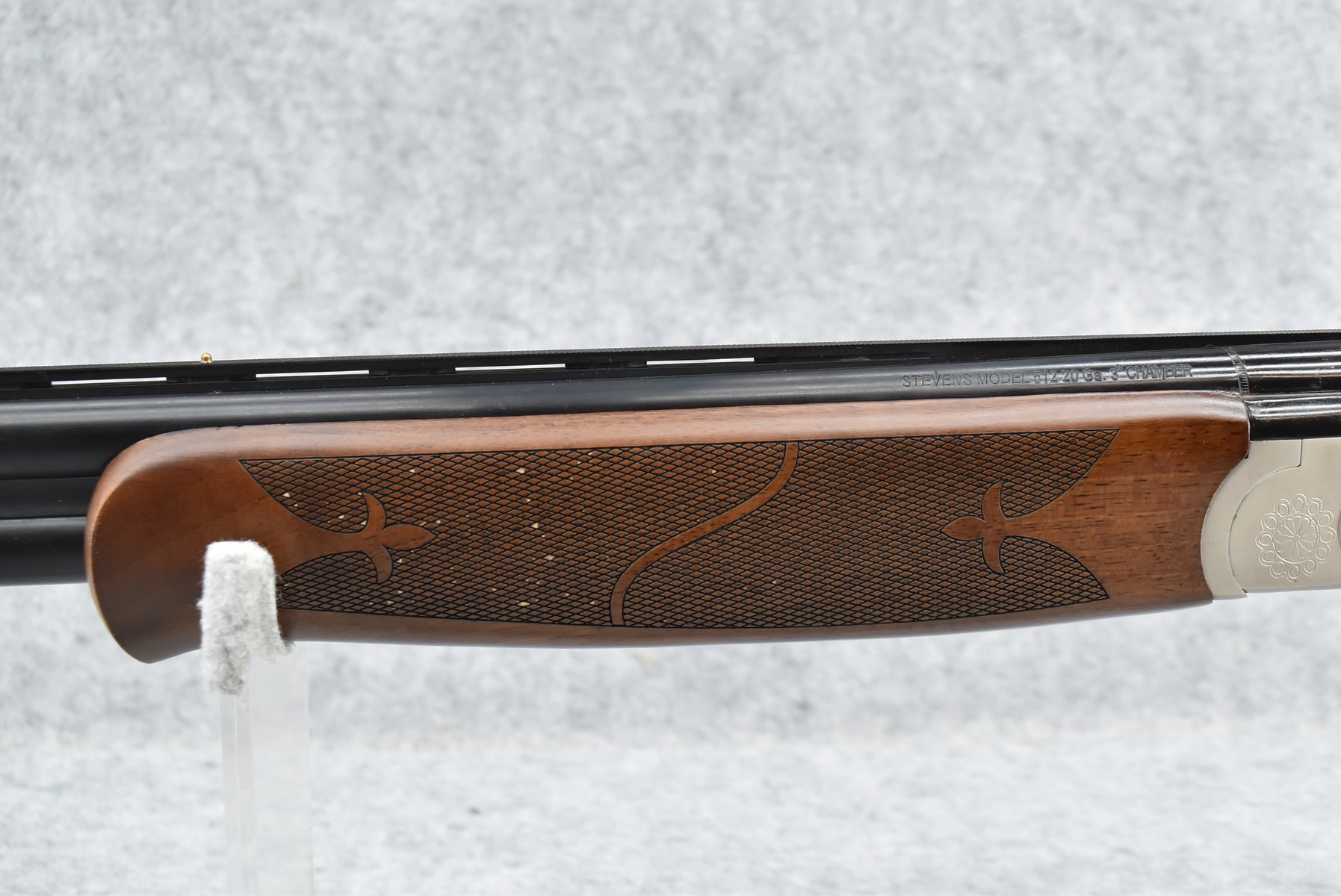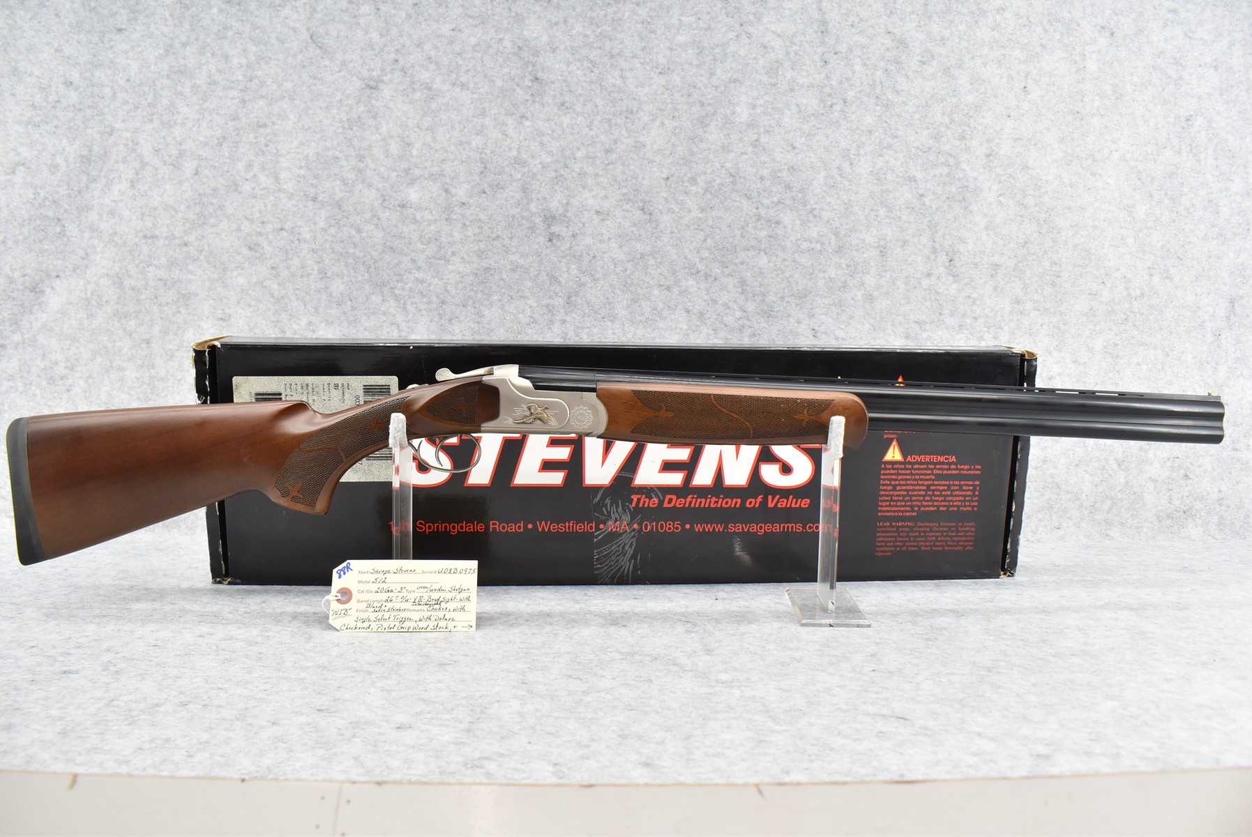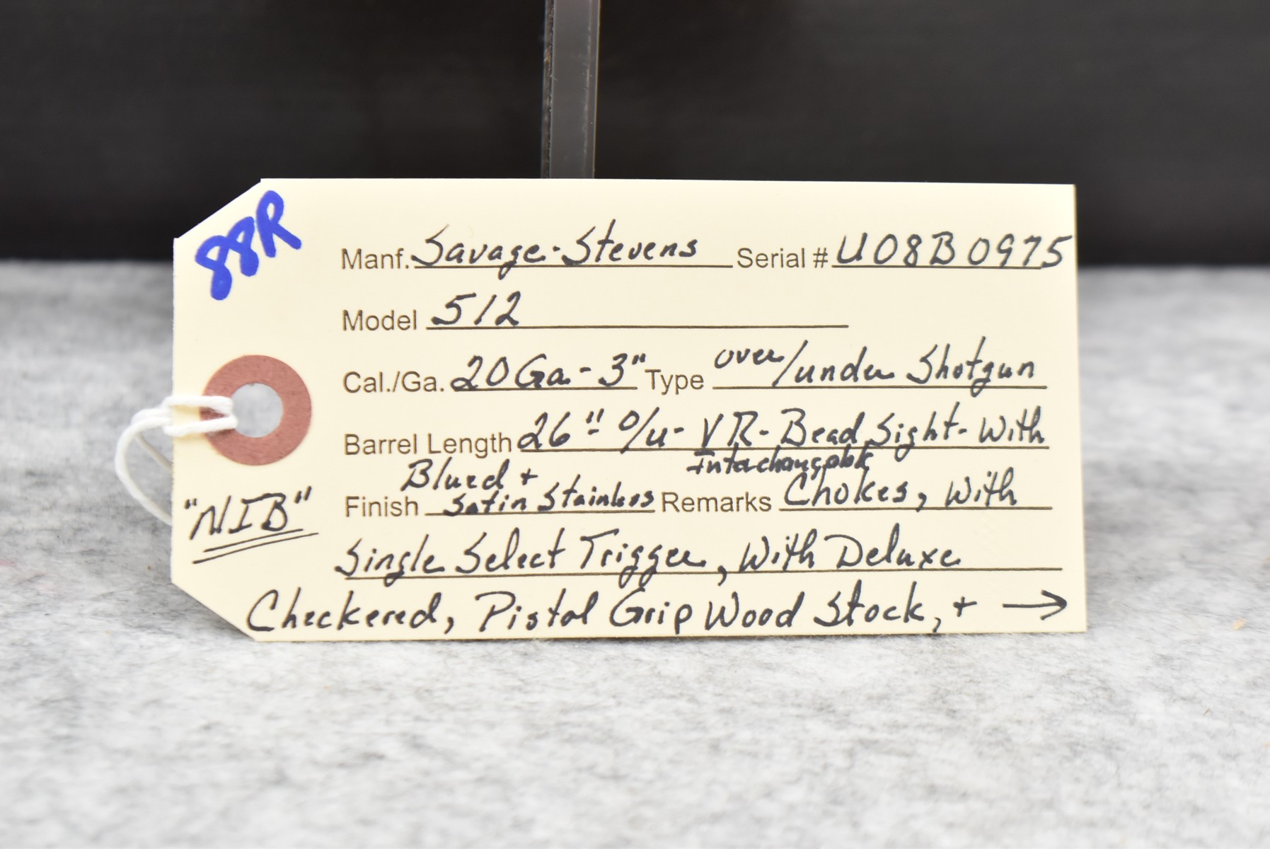 88R.       Savage-Stevens – Mod. 512 – 20ga. 3” Over/Under Shotgun – w/26” Over/Under Interchangeable Choke Vent Rib Barrels w/Bead Sight – Blued/Satin Stainless Finish – w/Deluxe Checkered Pistol Grip Wood Stock and Forearm w/Factory Black Rubber Butt Pad – w/Single Select Trigger – w/As New w/Box, Manual, and Chokes