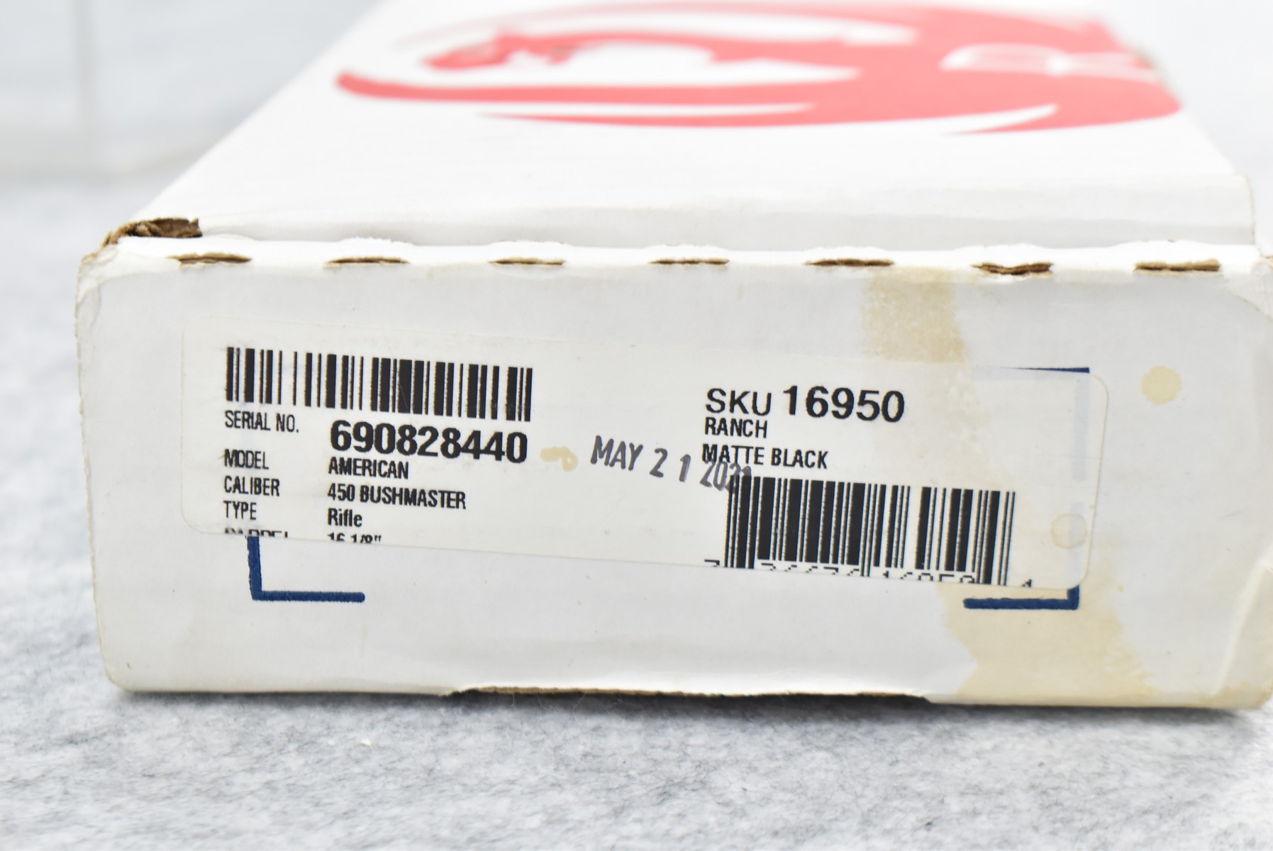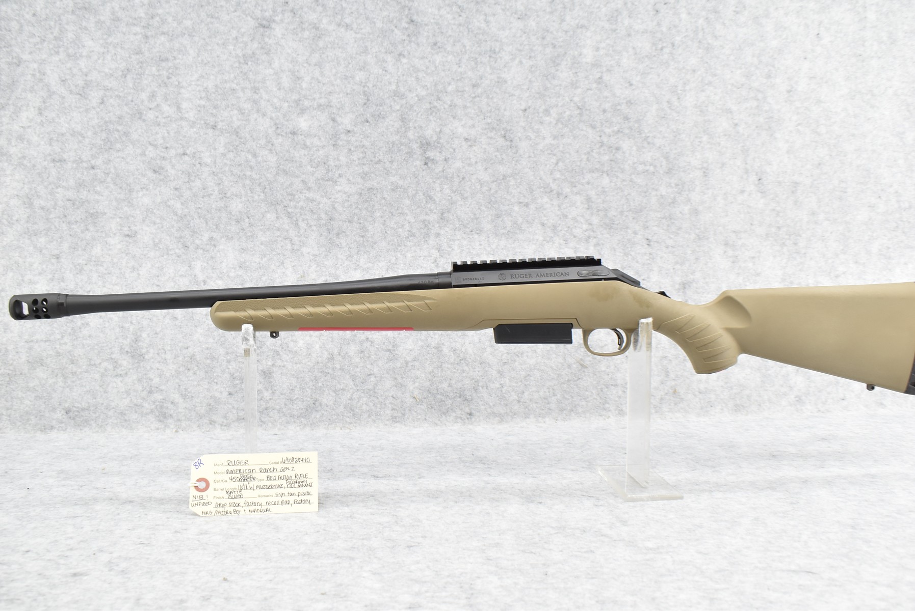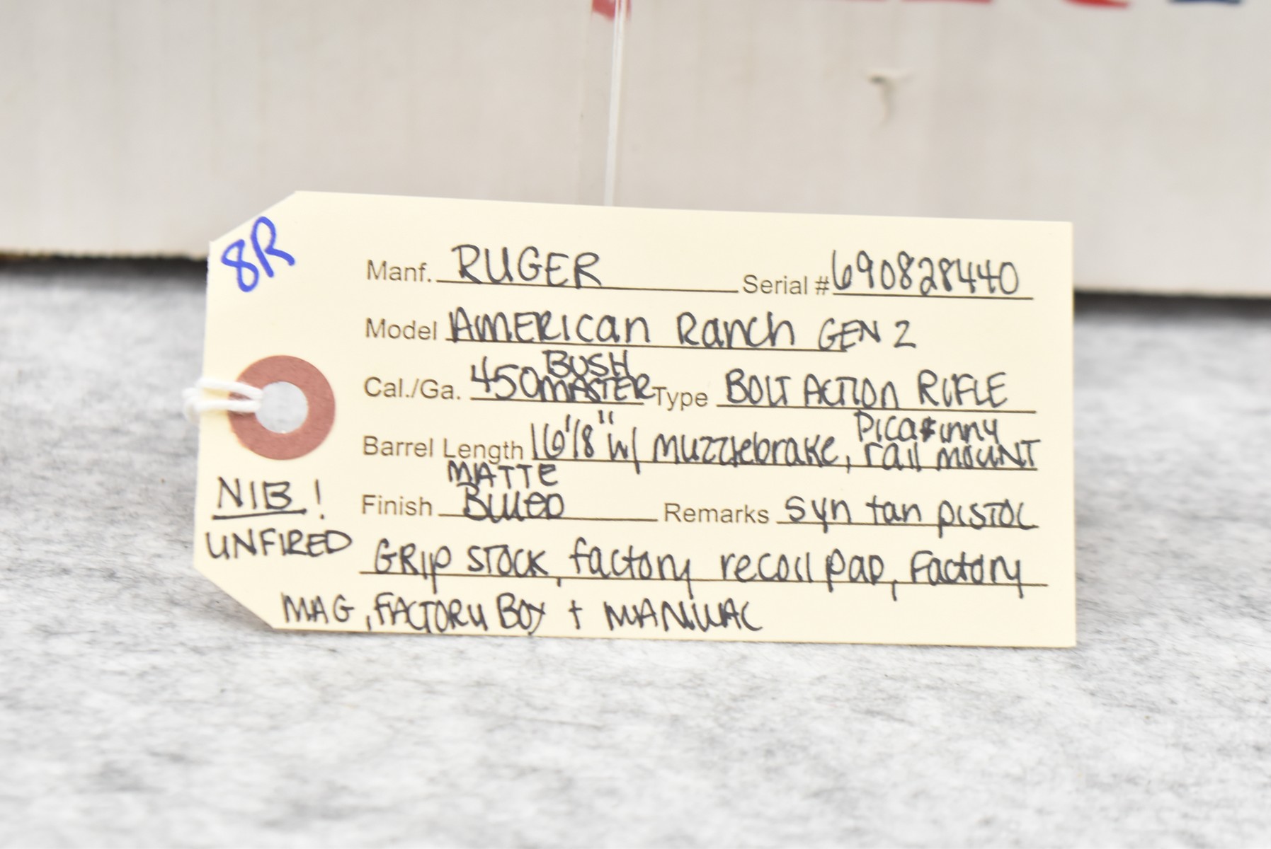 8R.          Ruger – Mod. American Ranch Gen II – 450 Bushmaster Cal. Bolt Action Rifle – w/16 1/8” Barrel w/Muzzle Break and Picatinny Scope Rail – Matte Blued Finish – w/Synthetic Tan Pistol Grip Stock w/Factory Recoil Pad – Unfired w/Factory Box, Manual, and Factory Magazine