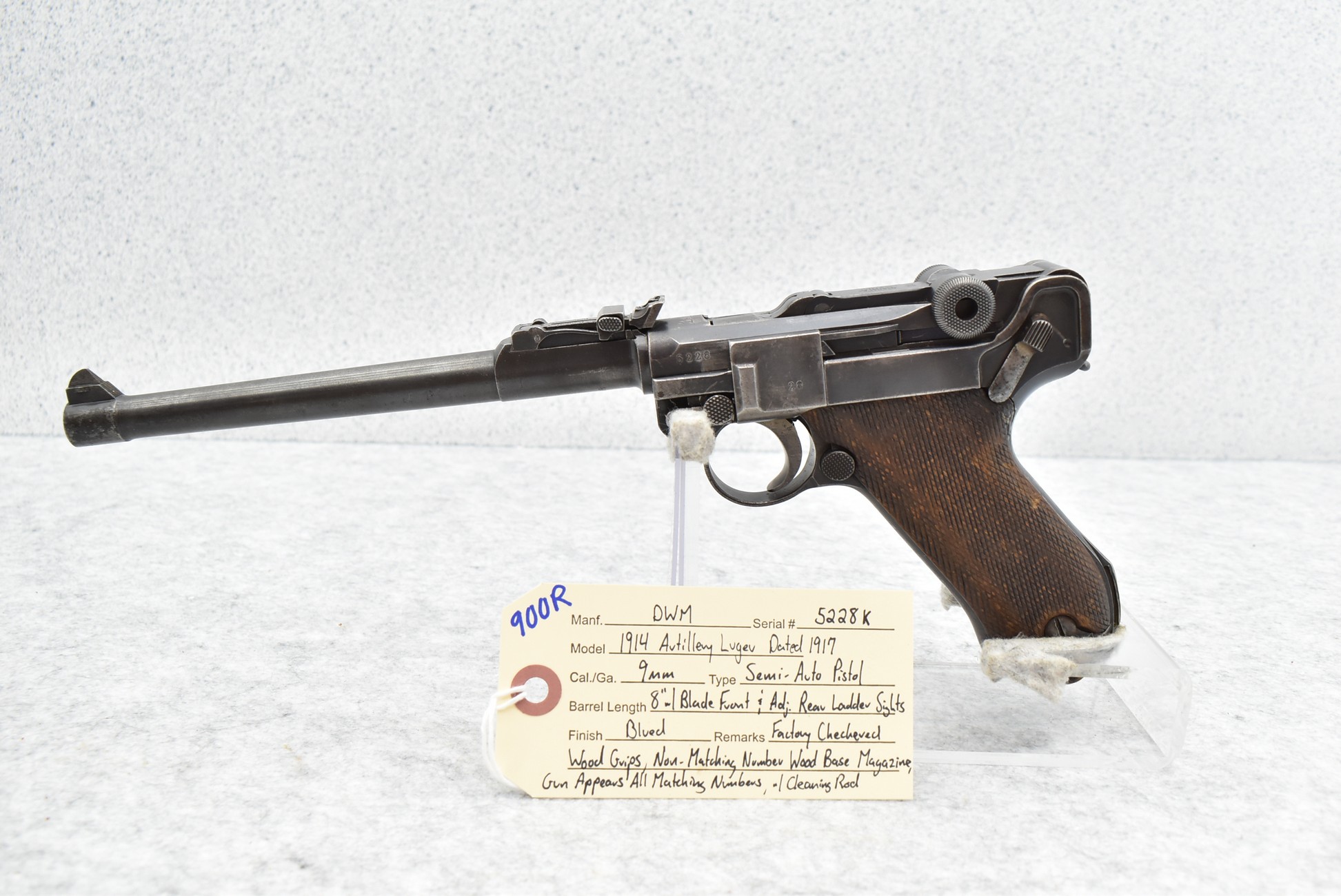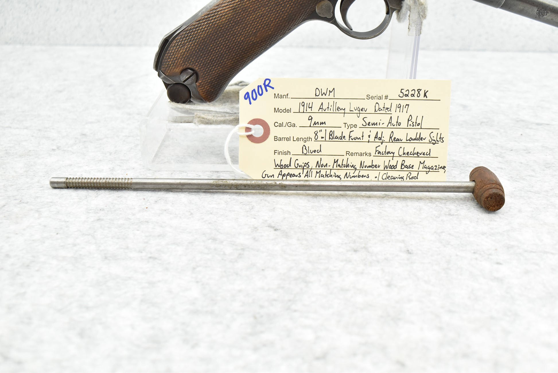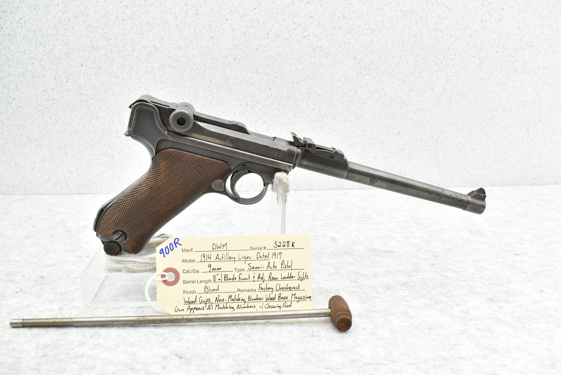 900R. DWM – Mod. 1914 Artillery Luger – 9mm Cal. Semi-Auto Pistol – w/8” Barrel w/Blade Front & Adj. Rear Ladder Sights – Blued Finish – w/Factory Checkered Wood Grips – w/Non-Matching Number Wood Base Magazine – Gun Appears All Matching Numbers – w/Cleaning Rod – Dated 1917