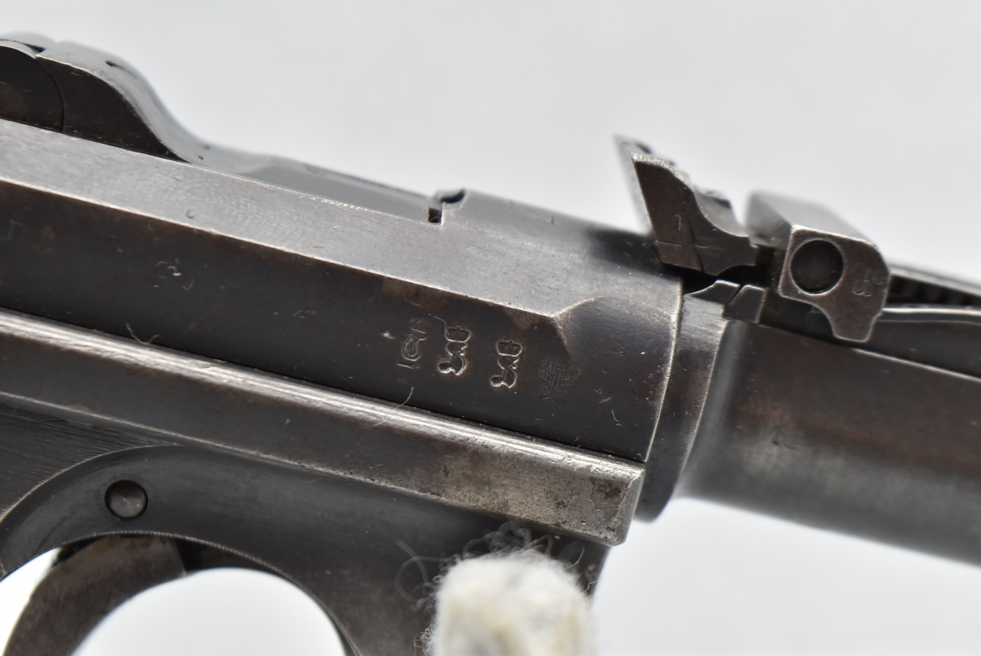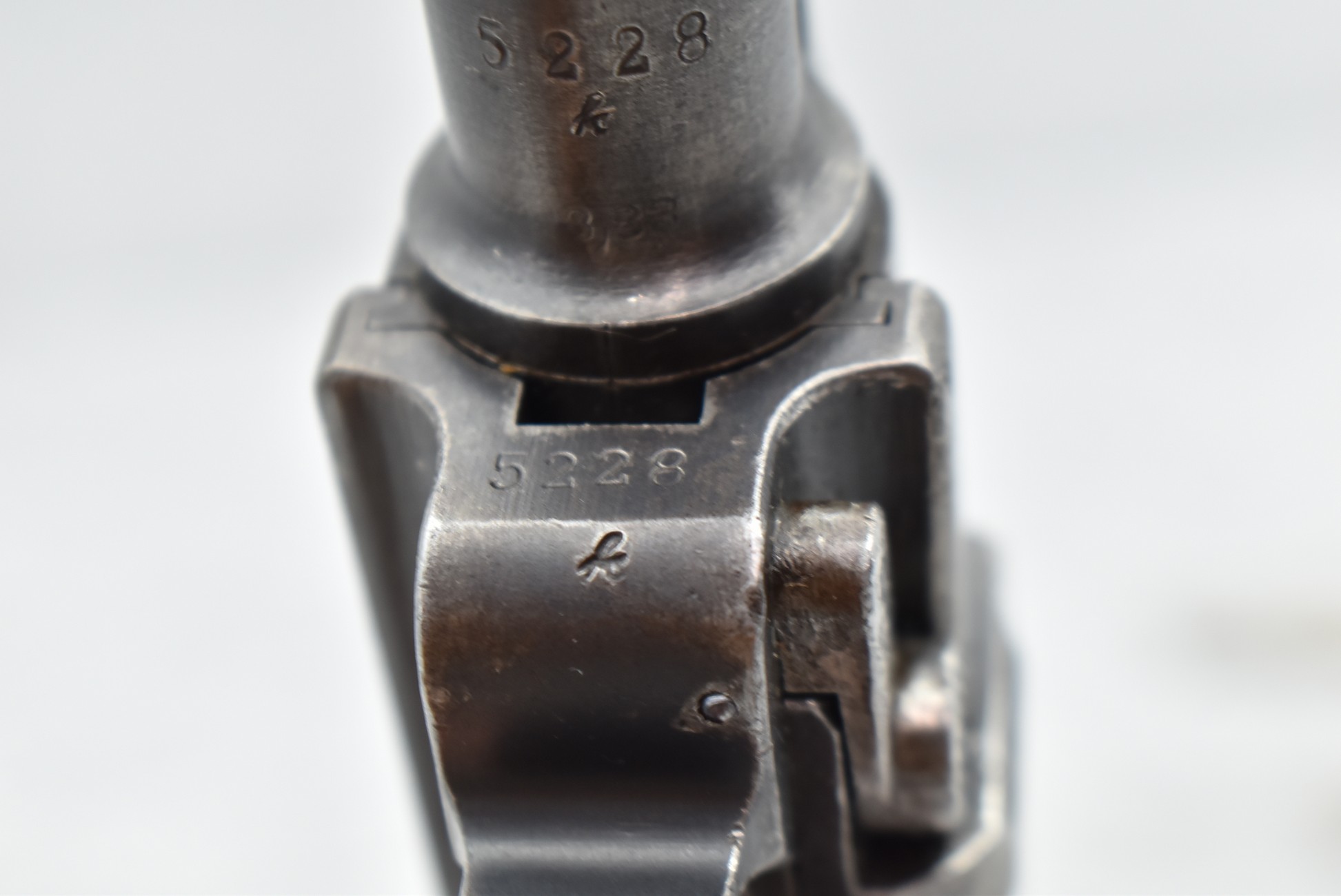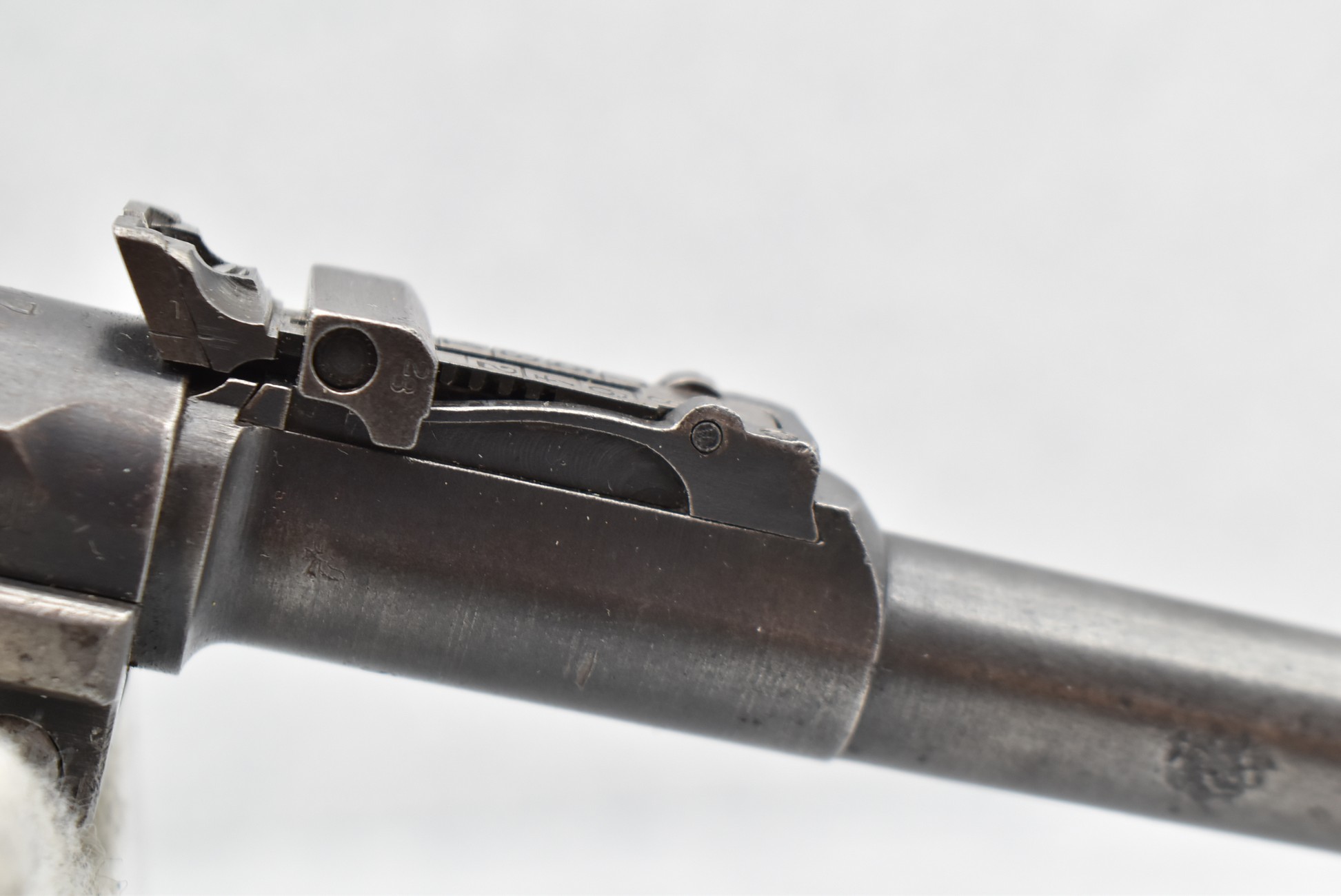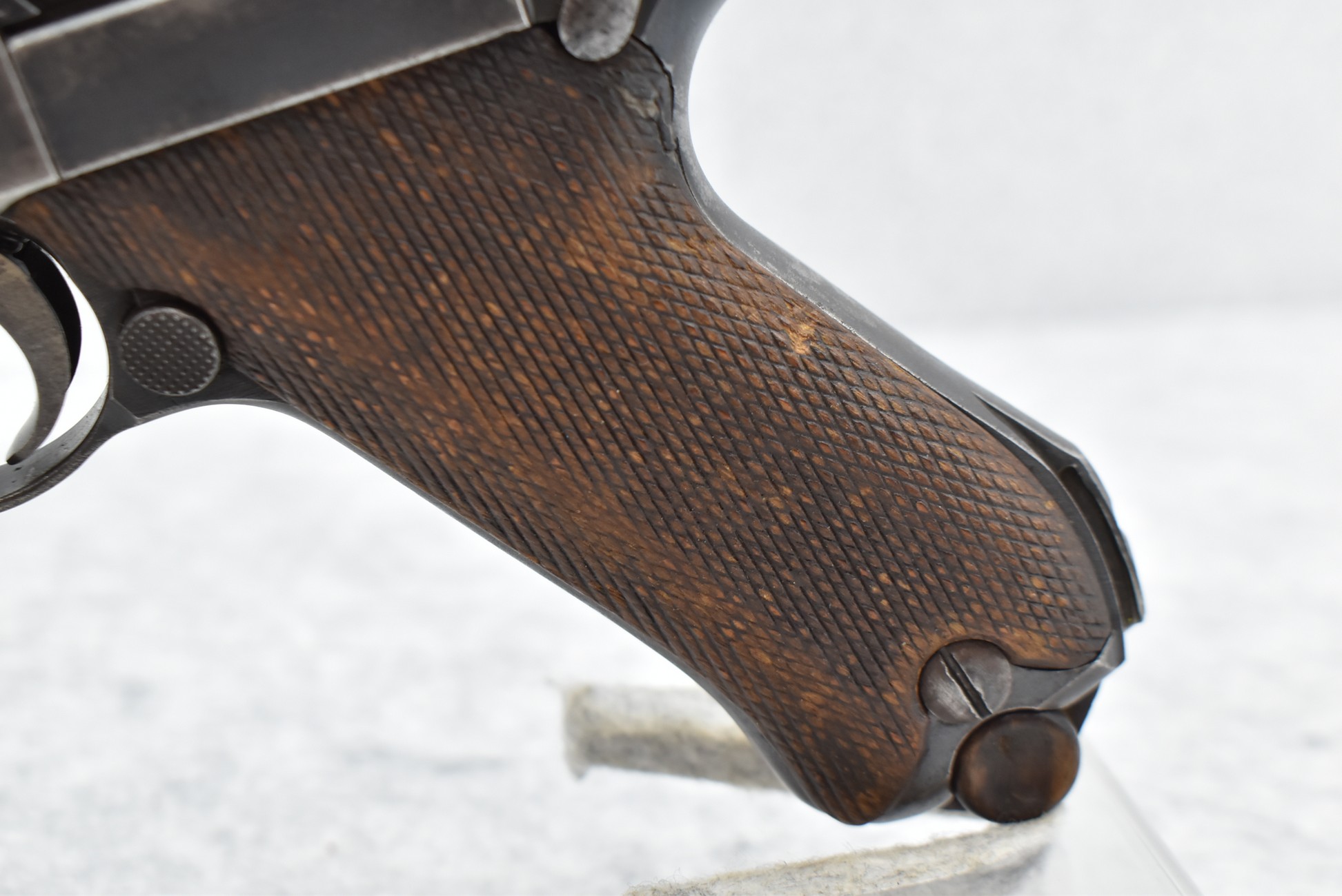 900R. DWM – Mod. 1914 Artillery Luger – 9mm Cal. Semi-Auto Pistol – w/8” Barrel w/Blade Front & Adj. Rear Ladder Sights – Blued Finish – w/Factory Checkered Wood Grips – w/Non-Matching Number Wood Base Magazine – Gun Appears All Matching Numbers – w/Cleaning Rod – Dated 1917