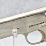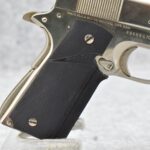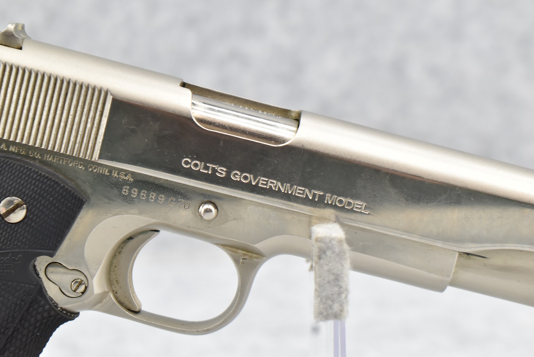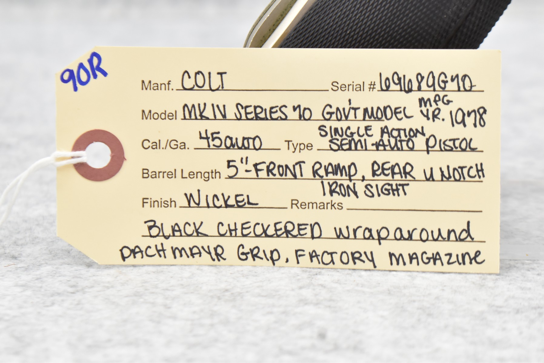 90R. Colt – Mod. MKIV Series 70 Gov’t Model – 45 Auto Cal. Semi-Auto Pistol – w/5” Barrel w/Front Ramp & Rear U-Notch Iron Sights – Nickel Finish – w/Black Checkered Wraparound Pachmayr Grip – w/Factory Magazine – Mfg. 1978