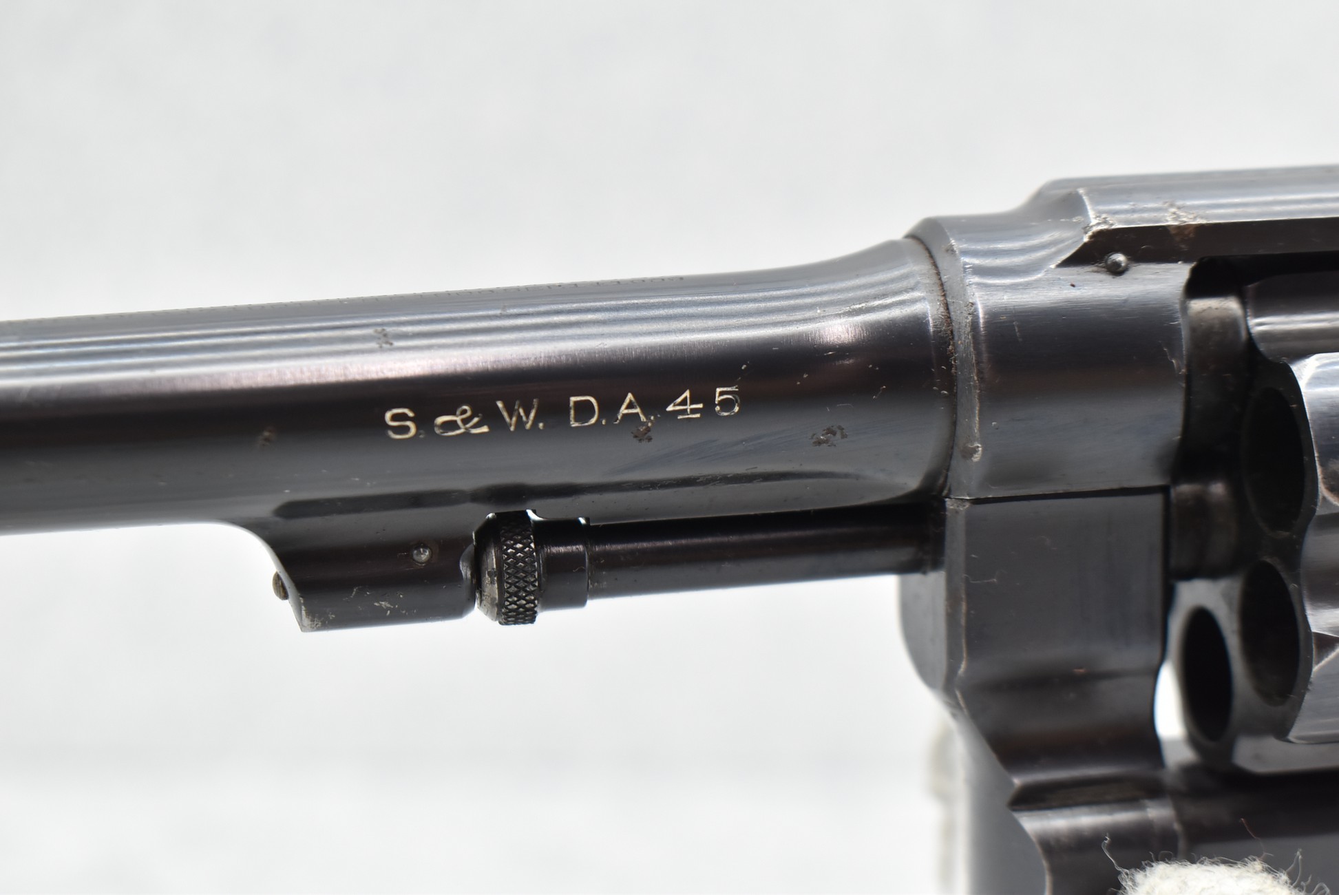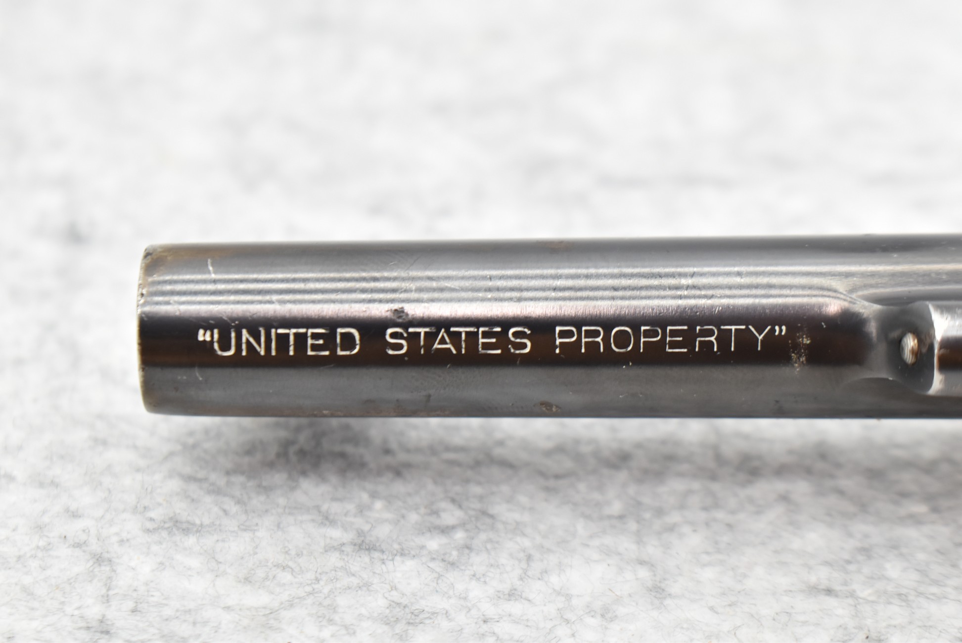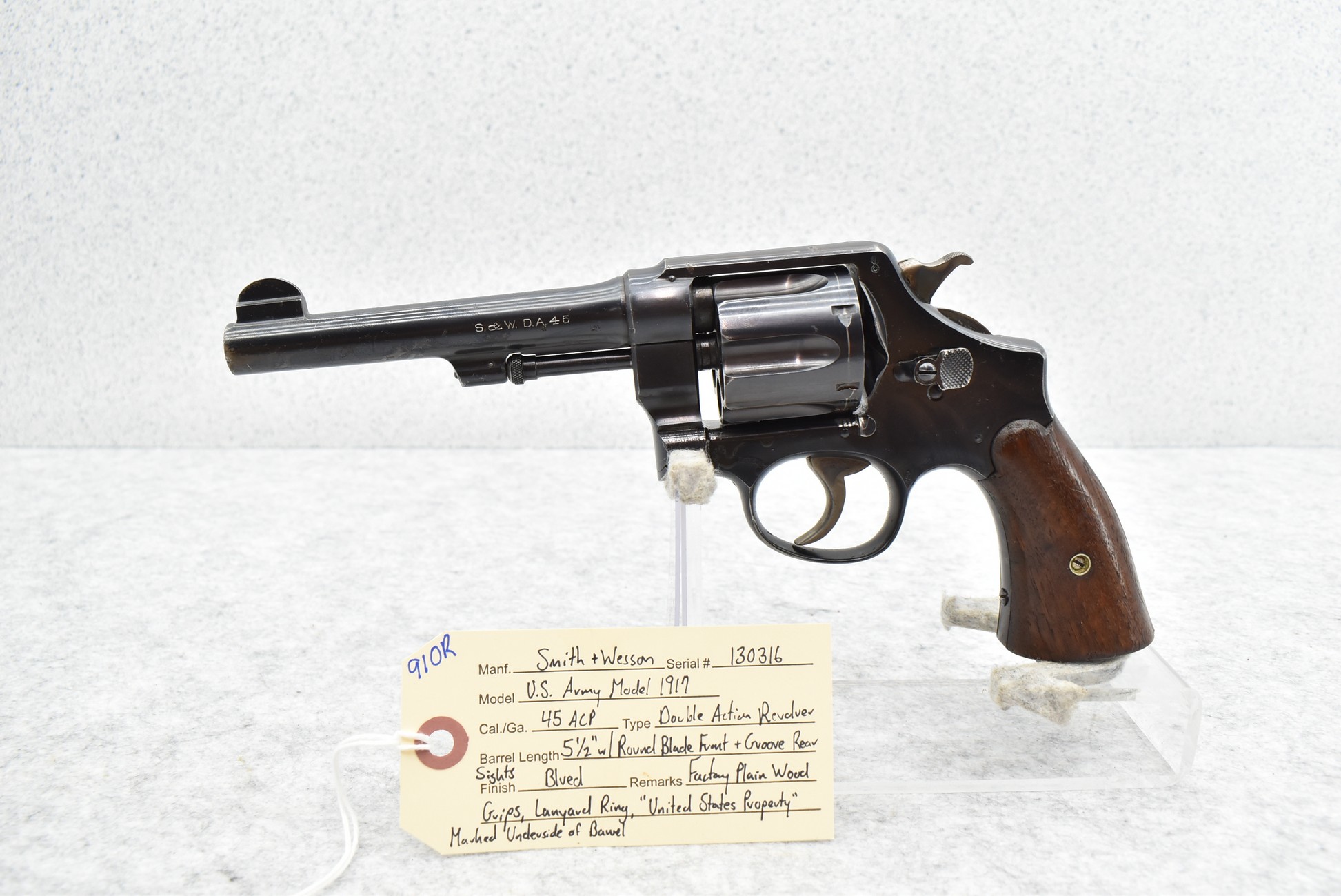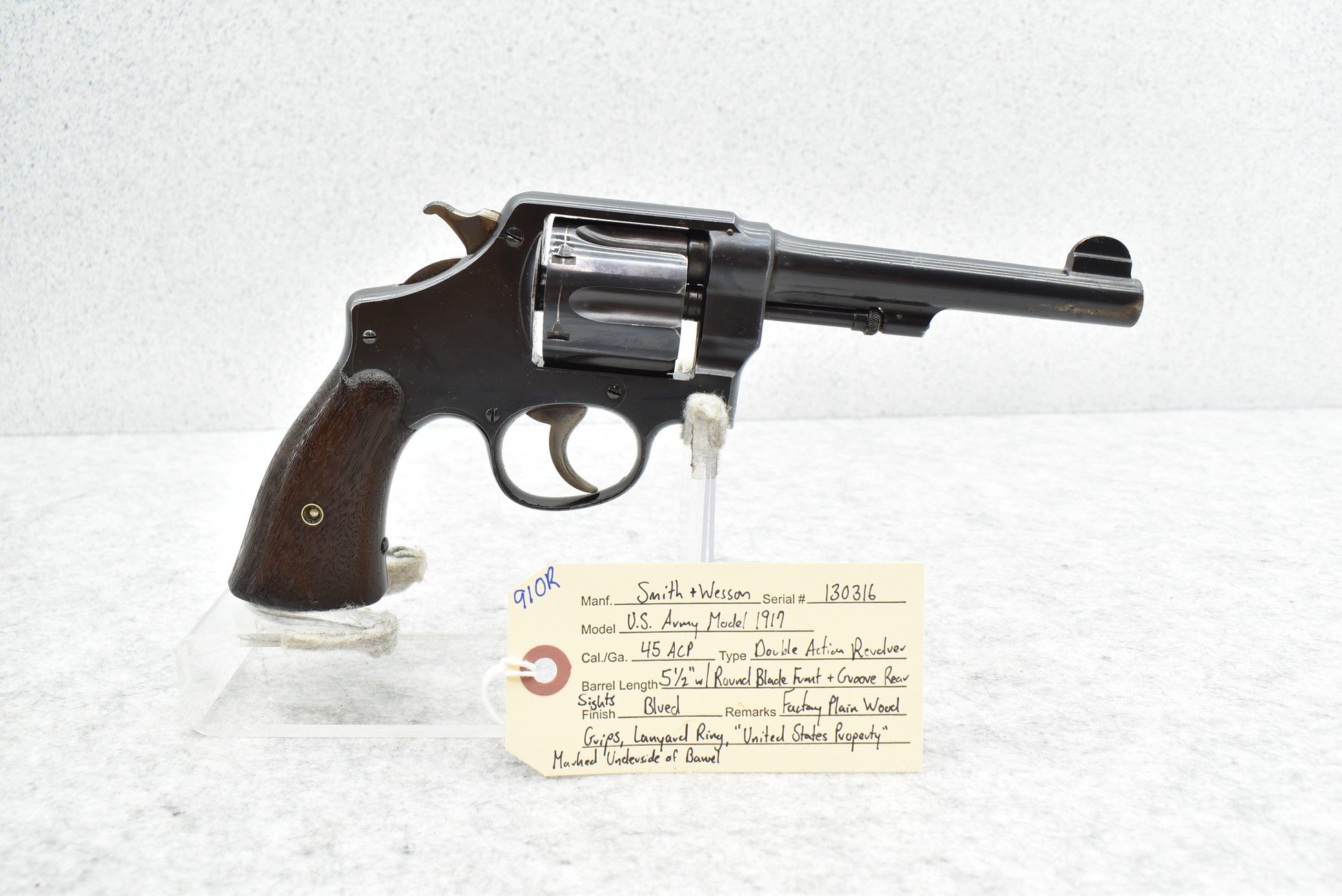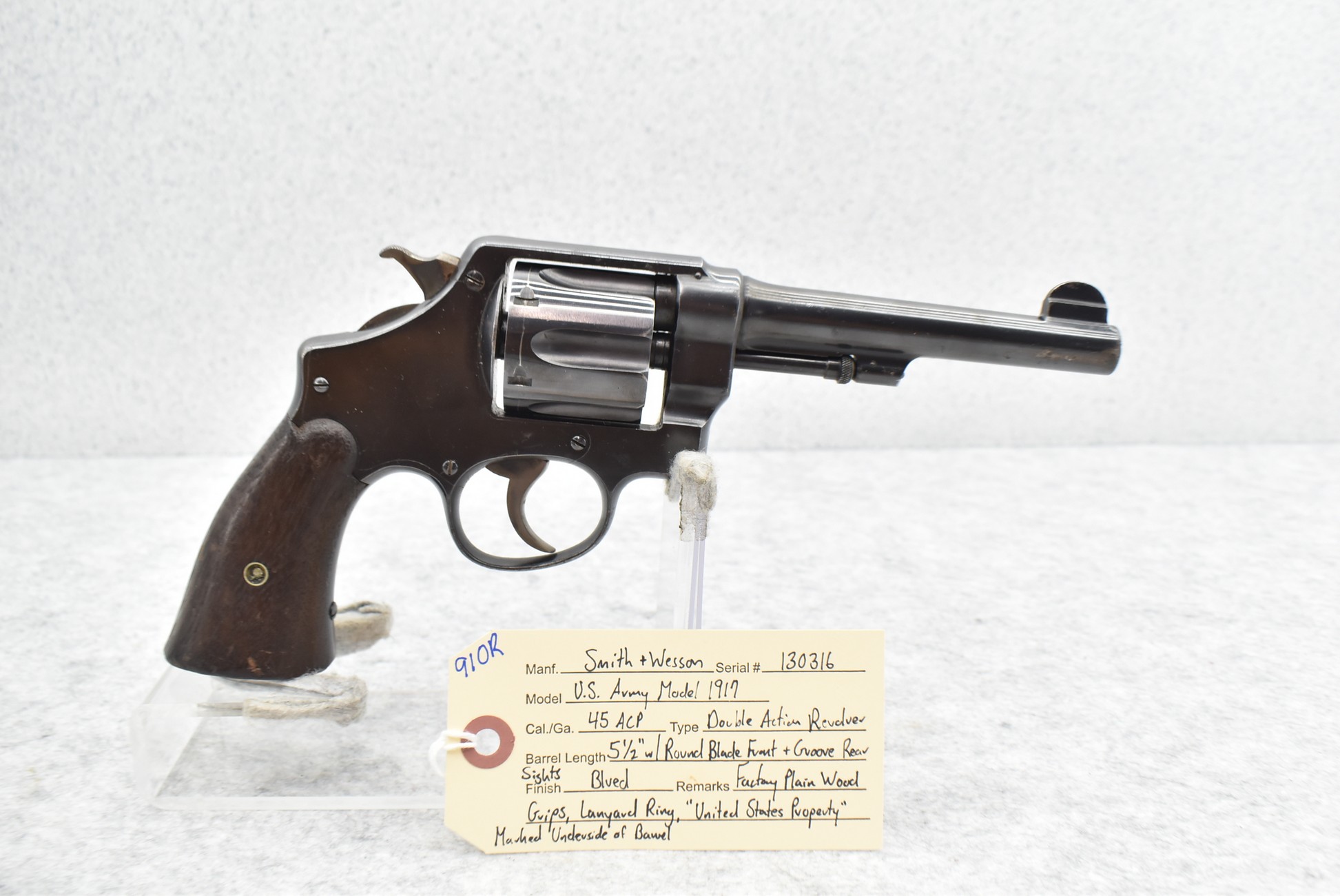 910R. Smith & Wesson – U.S. Army Model 1917 – 45 ACP Cal. Double Action Revolver – w/5 ½” Barrel w/Round Blade Front & Groove Rear Sights – Blued Finish – w/Factory Plain Wood Grips – w/Lanyard Ring – “United States Property” Marked Underside of Barrel
