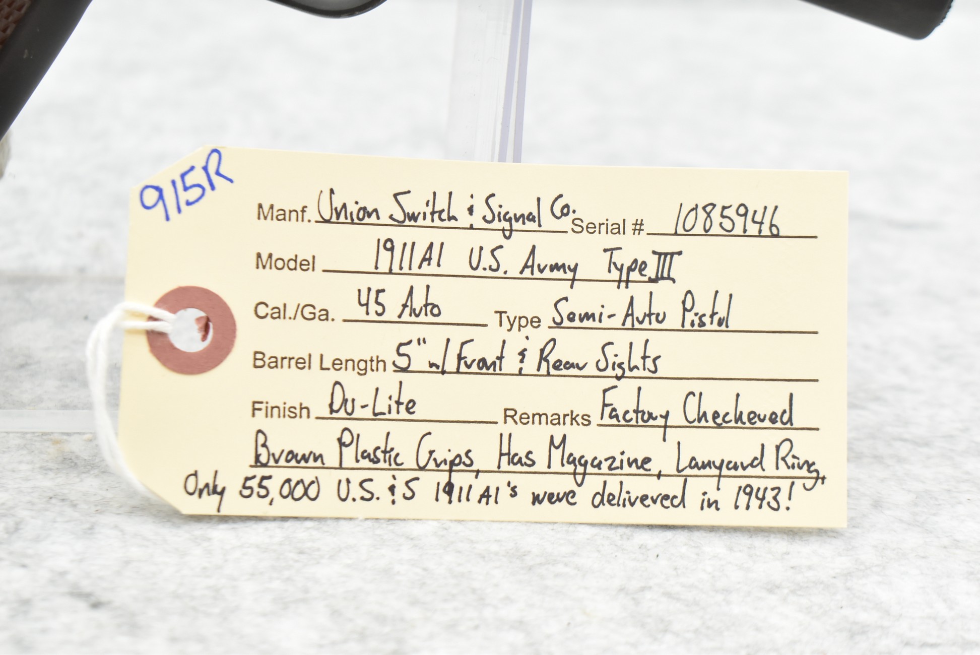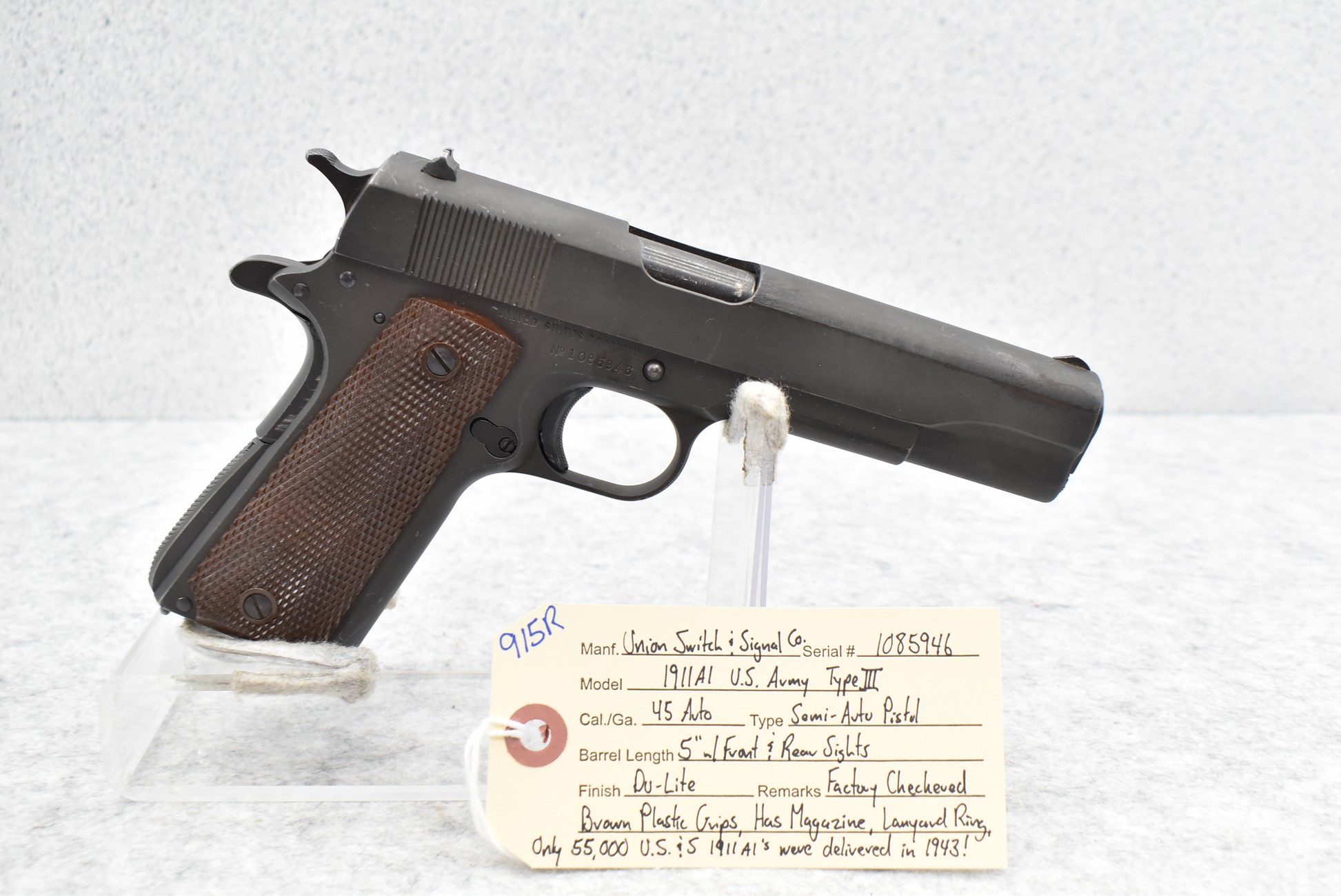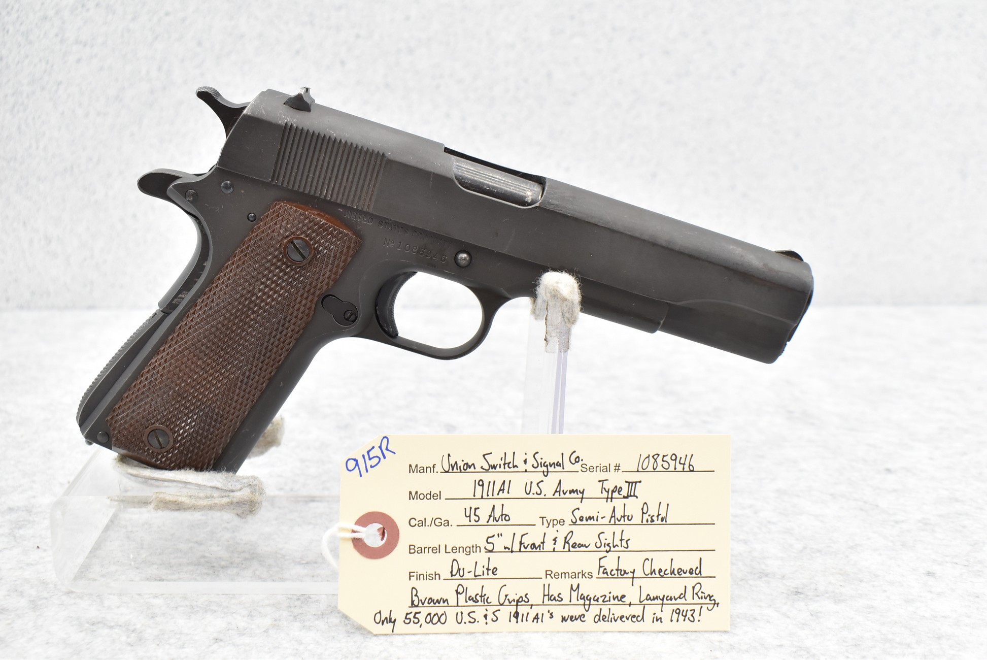 915R. Union Switch & Signal Co. – Mod. 1911 A1 U.S. Army Type III – 45 Auto Cal. Semi-Auto Pistol – w/5” Barrel w/Front & Rear Sights – Du-Lite Finish – w/Factory Checkered Brown Plastic Grips – w/Magazine – w/Lanyard Ring – Only 55,000 U.S. & S 1911 A1’s Were Delivered in 1943!