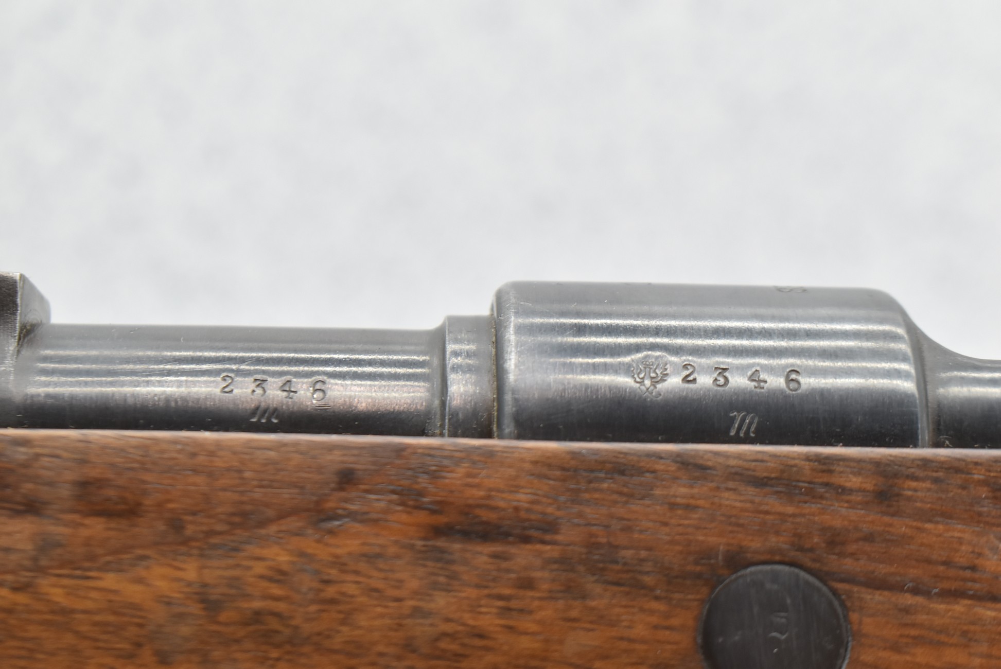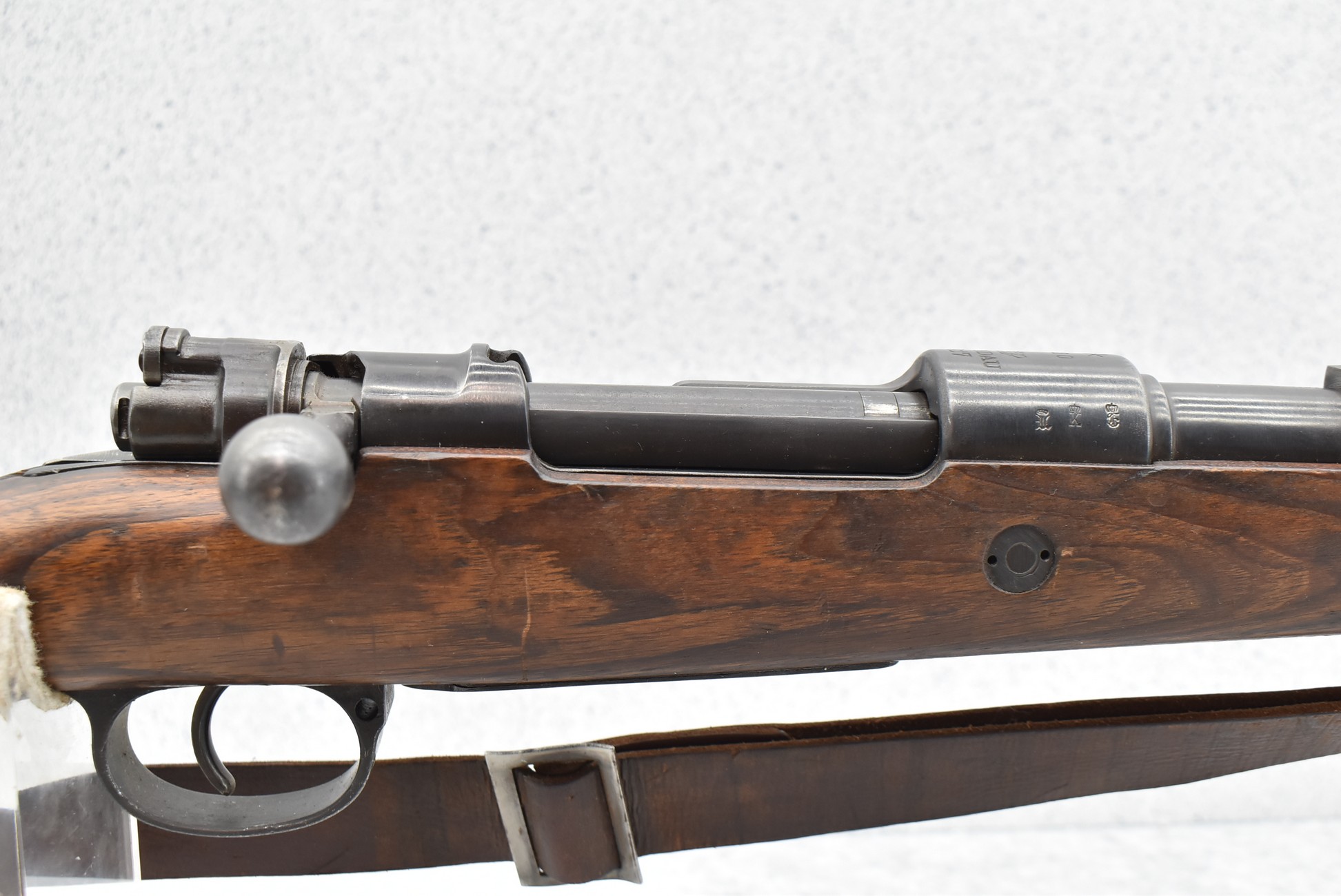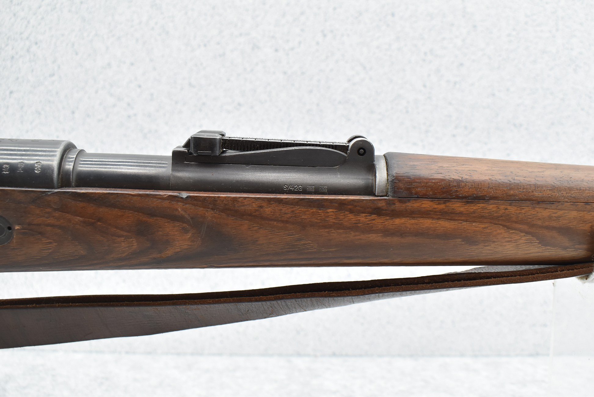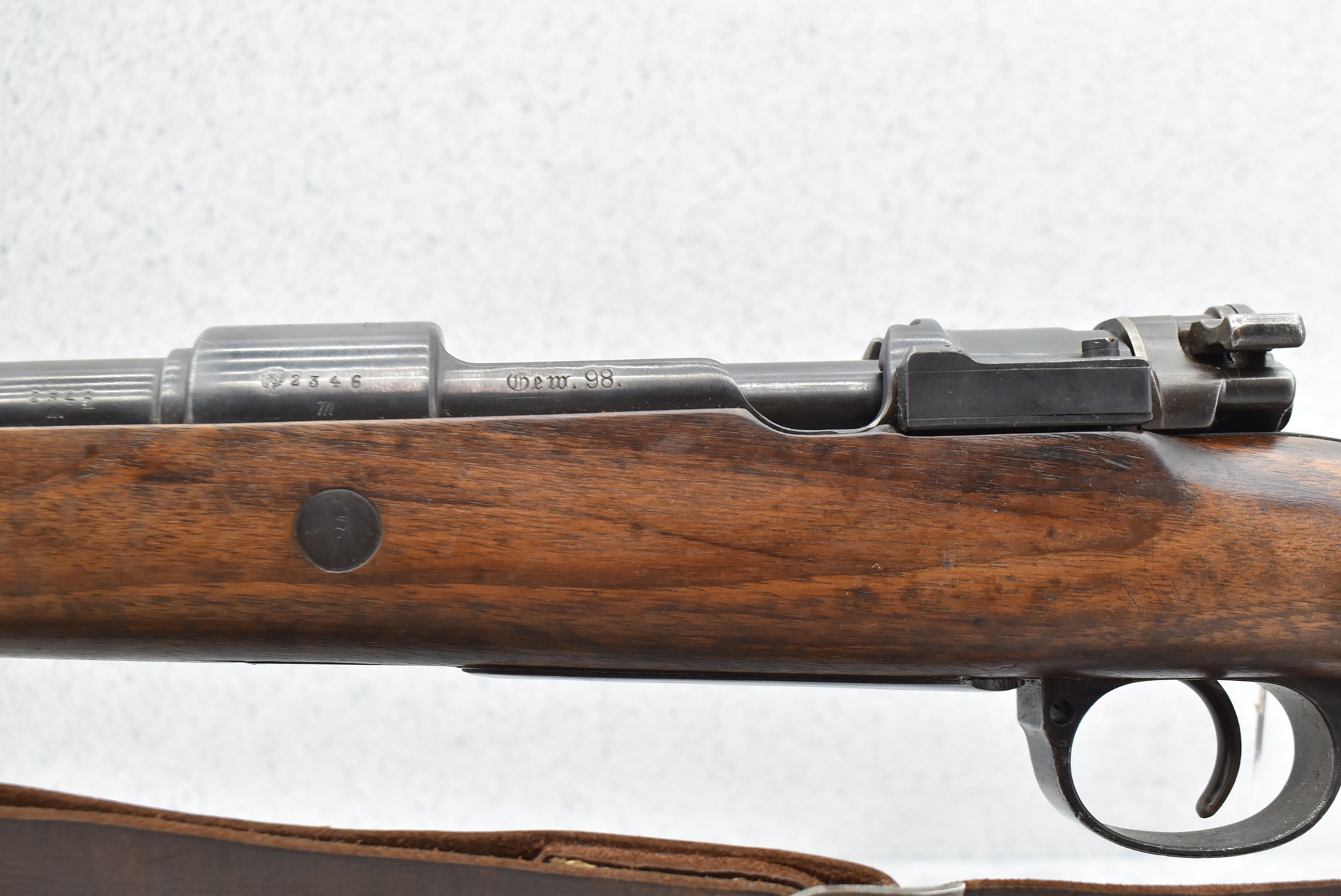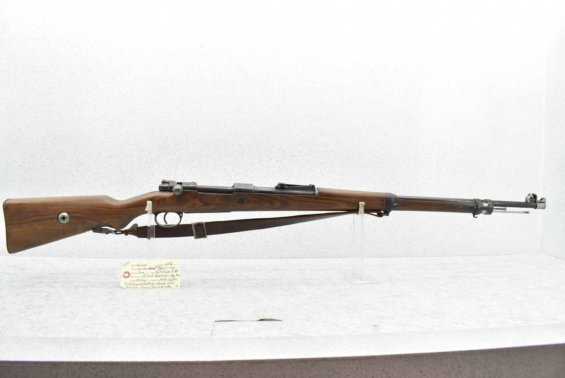 933R. Spandau (German) – Mod. GEW 98 – 8mm Cal. Bolt Action Rifle – w/29” Barrel w/Blade Front & Adj. Rear Notch Sights w/Muzzle Cap – Military Finish – w/Pistol Grip Wood Stocks w/Metal Butt Plate – w/Cleaning Rod – w/Leather Sling – All Matching Numbers Except Barrel Bands & Butt Plate – Double Dated 1917/1920