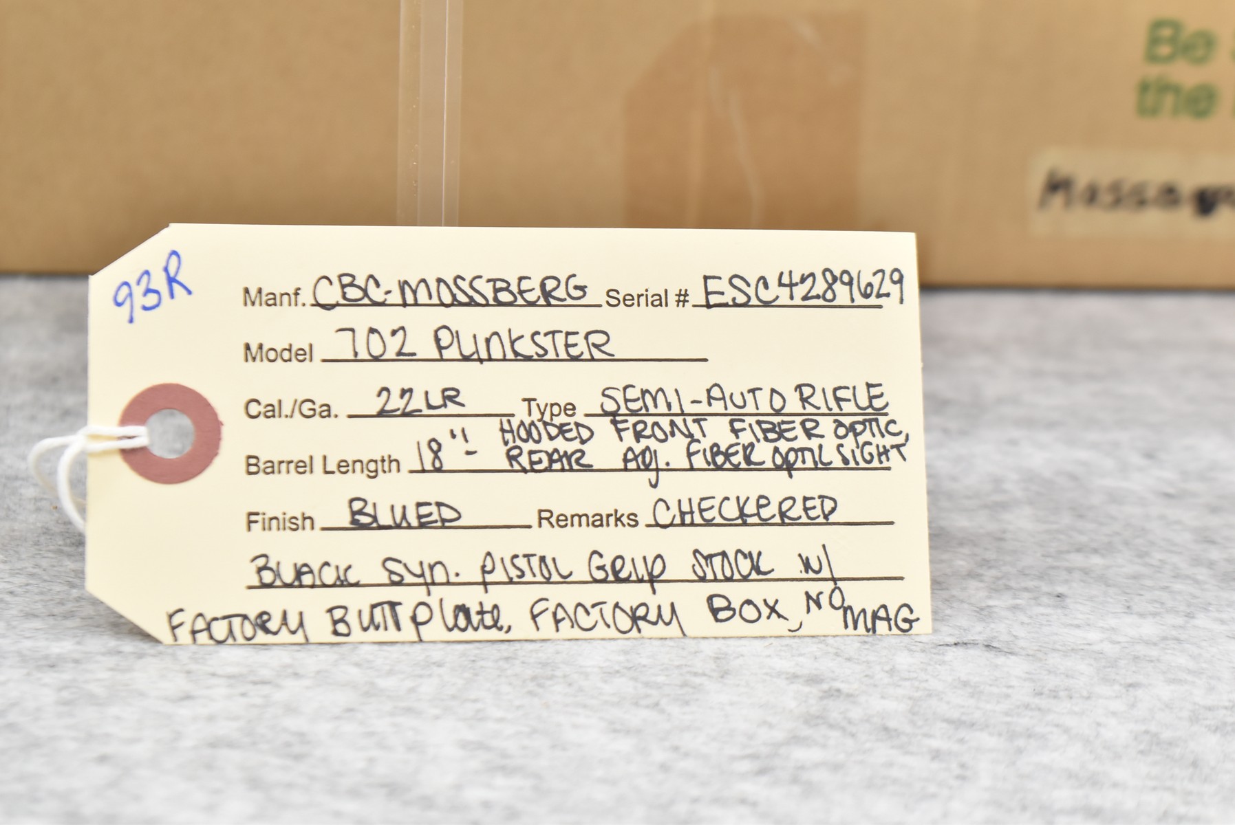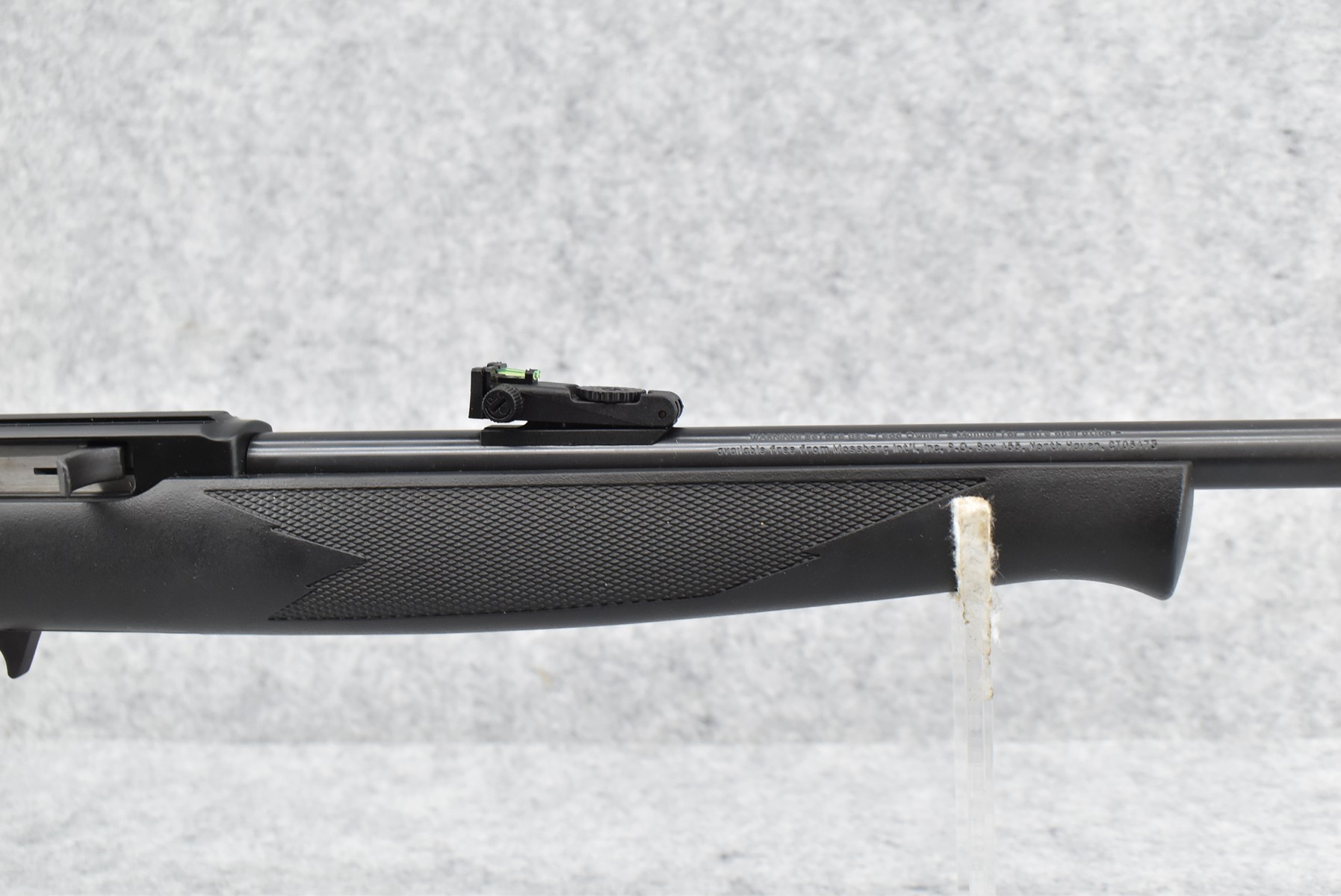 93R. Mossberg – Mod. Plinkster – 22LR Cal. Semi-Auto Rifle – w/18” Barrel w/Hooded Front Fiber Optic & Rear Adj. Fiber Optic Sights – Blued Finish – w/Checkered Black Synthetic Pistol Grip Stock w/Factory Butt Plate – No Mag – w/Factory Box