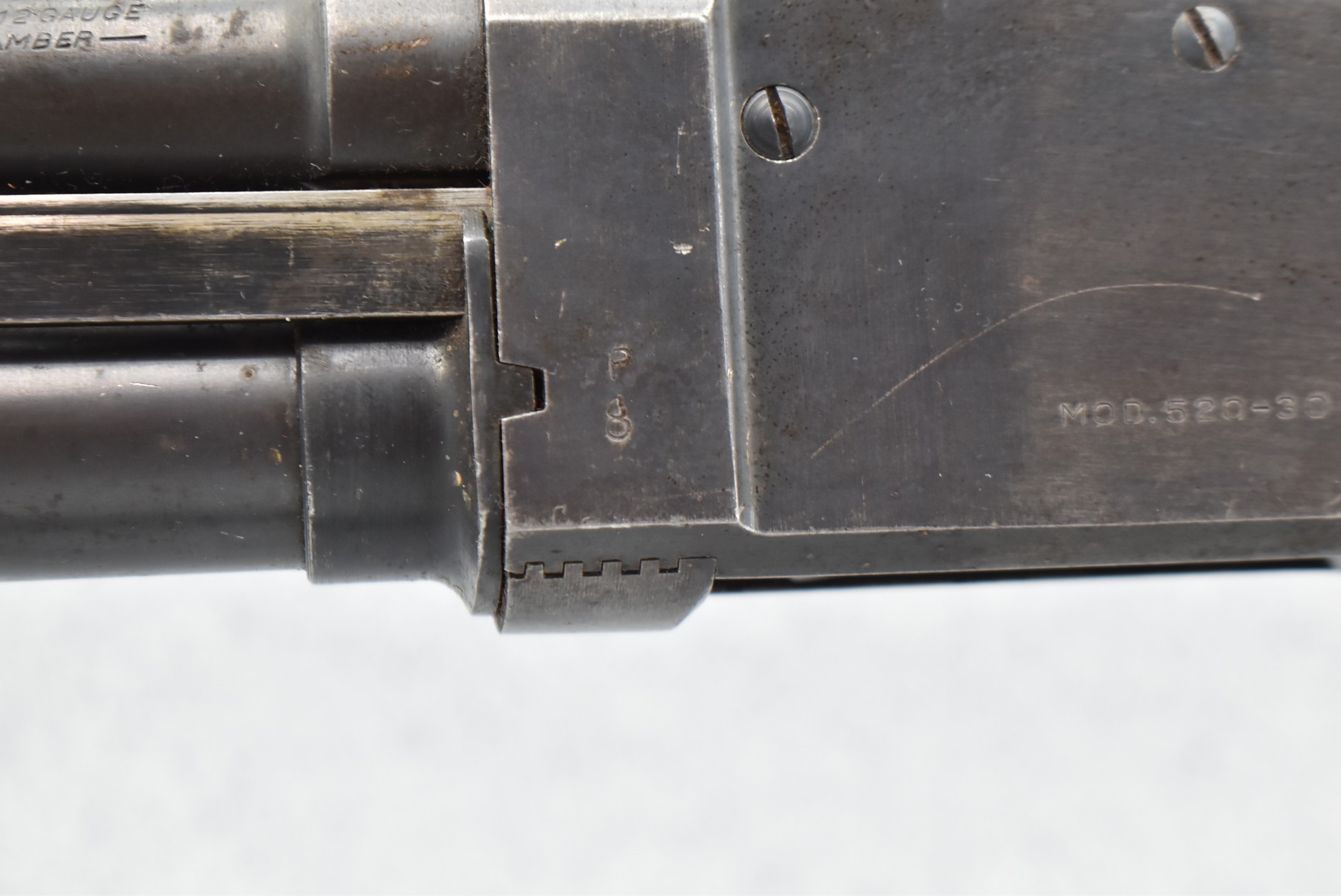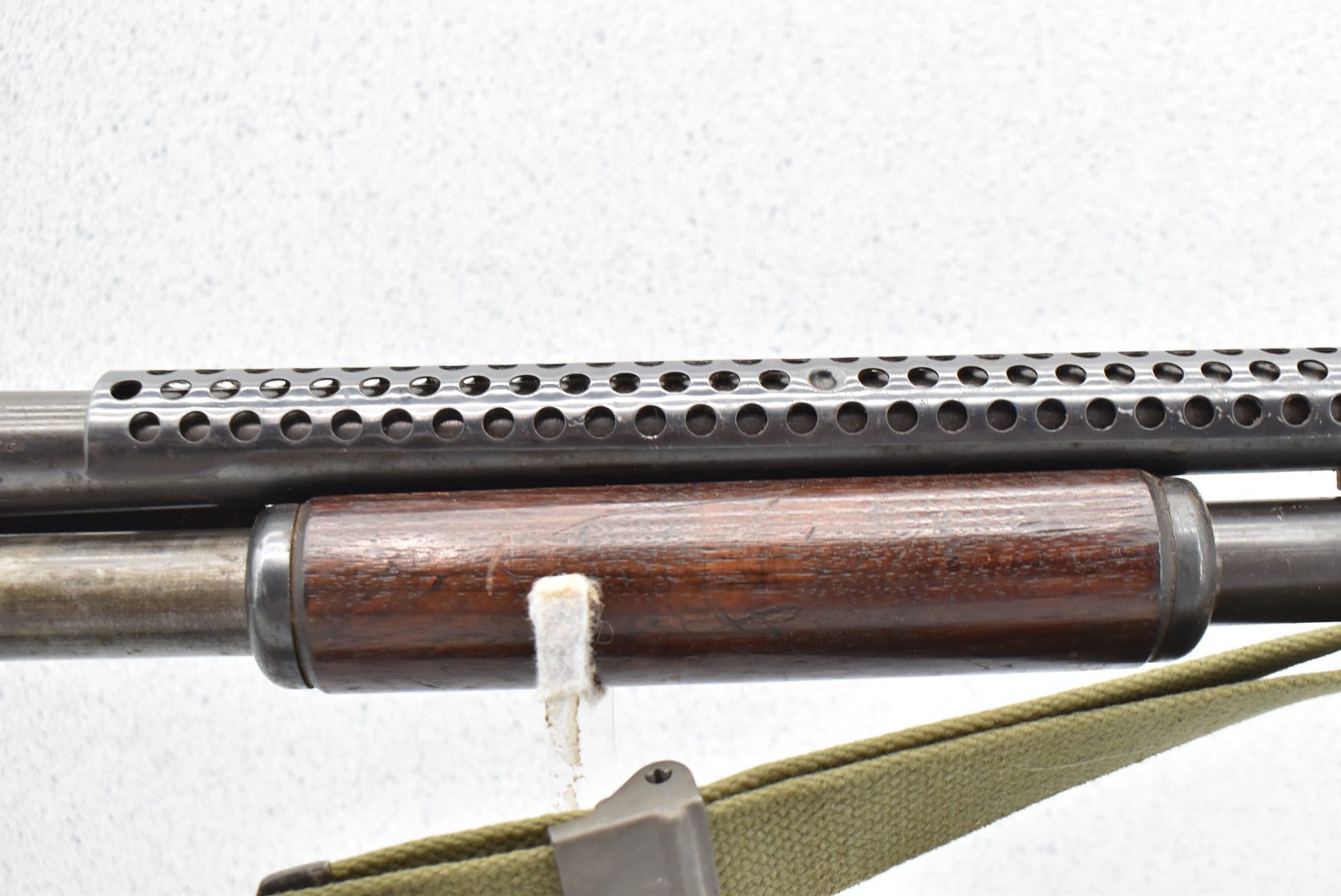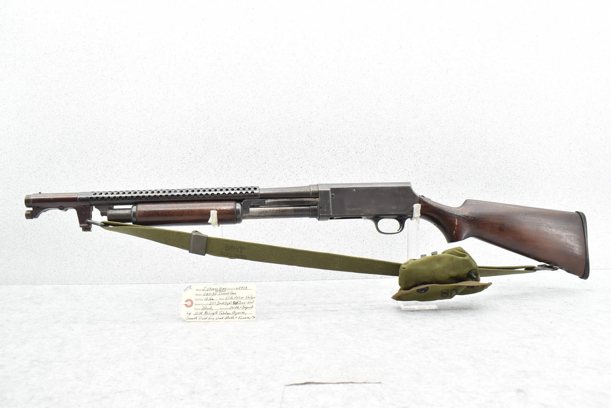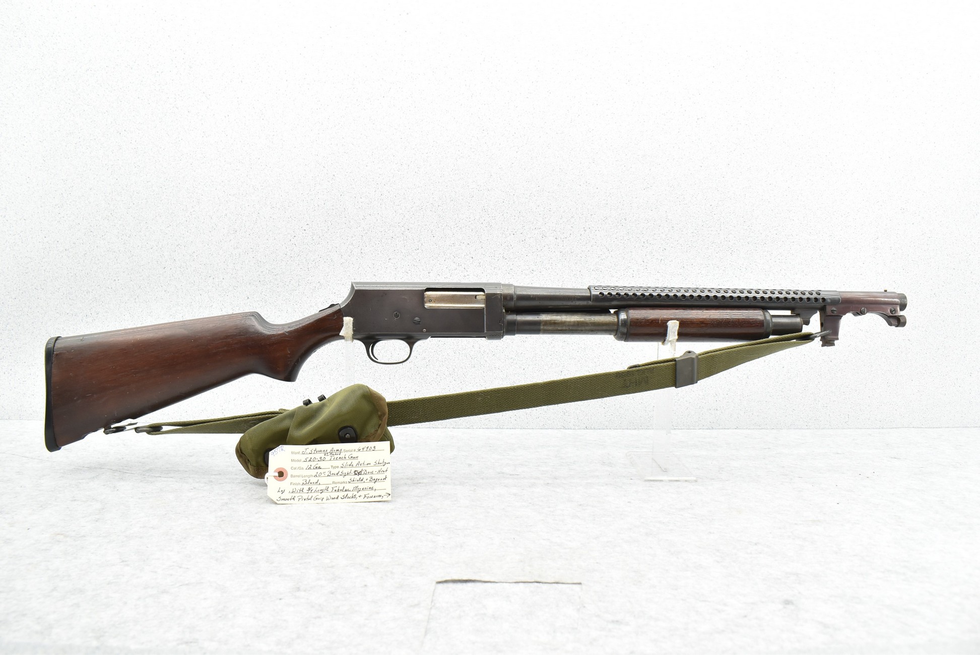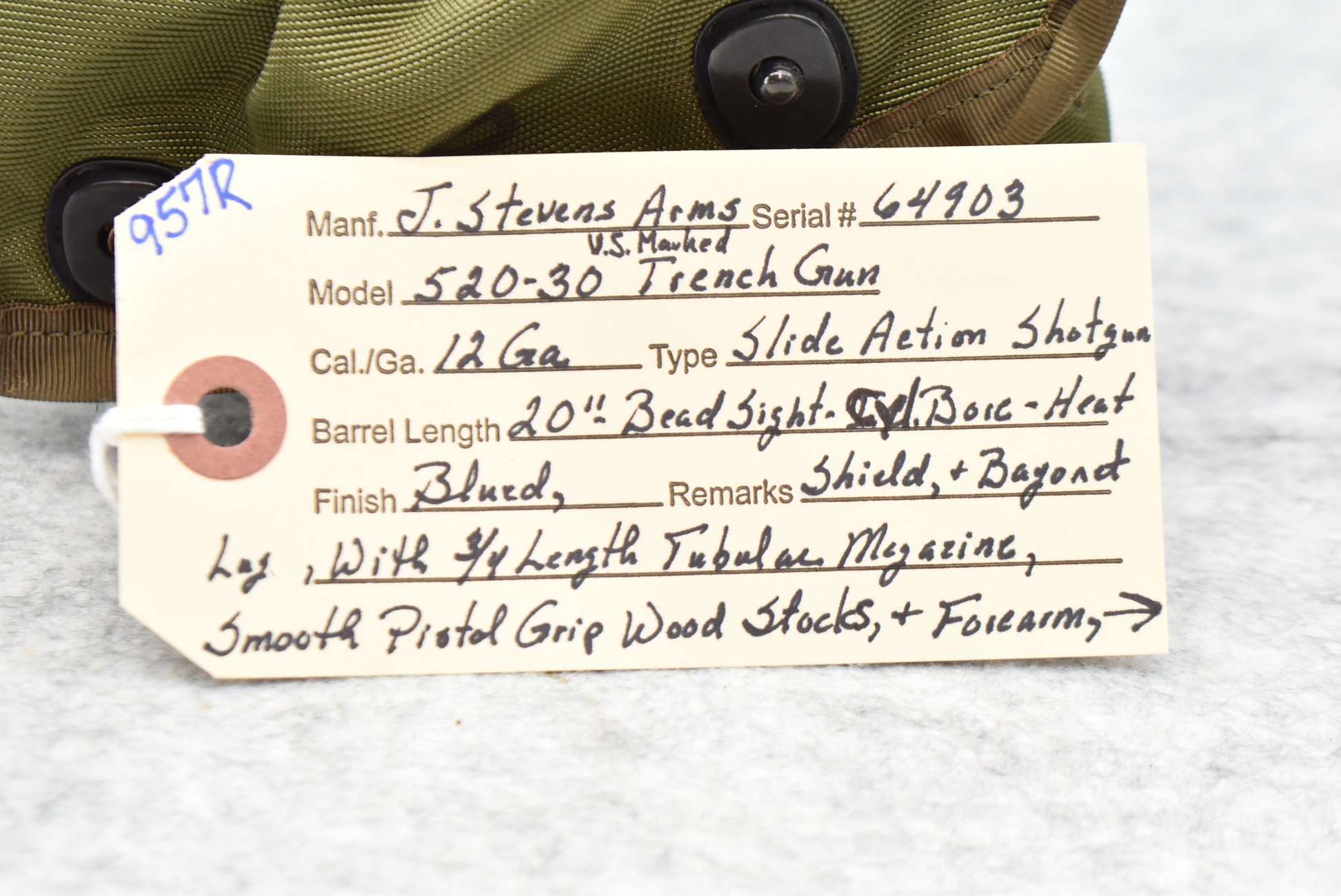 957R. J. Stevens Arms – Mod. 520-30 Trench Gun – 12ga. Pump Action Shotgun – w/20” Cyl. Choke Barrel w/Bead Sight, Heat Shield & ¾ Length Tubular Magazine w/Bayonet Lug – Blued Finish – w/Smooth Pistol Grip Wood Stocks w/Oversized Butt Plate – w/Military Sling & Ammo Pouch – US & Ordnance Bomb Marked Receiver & Ordnance Bomb Marked Barrel