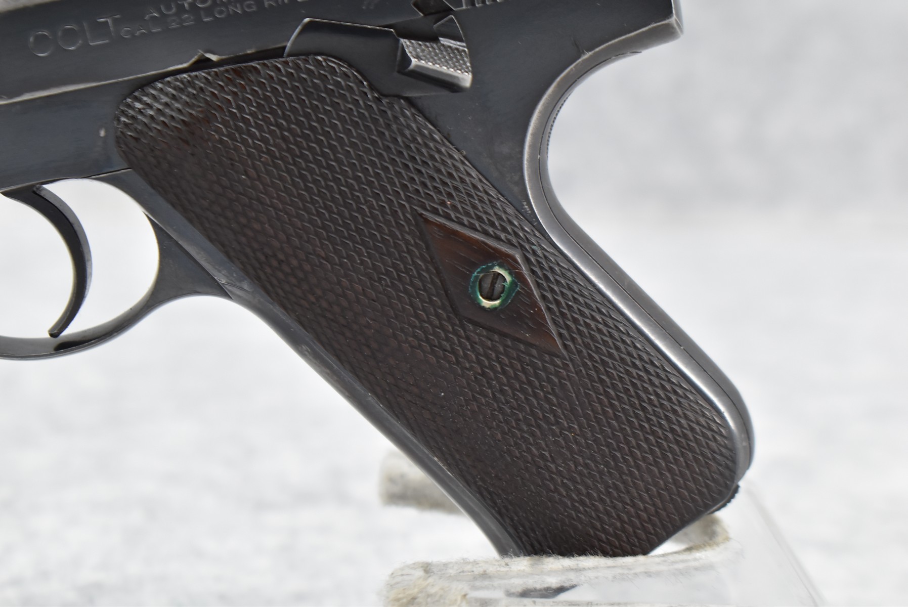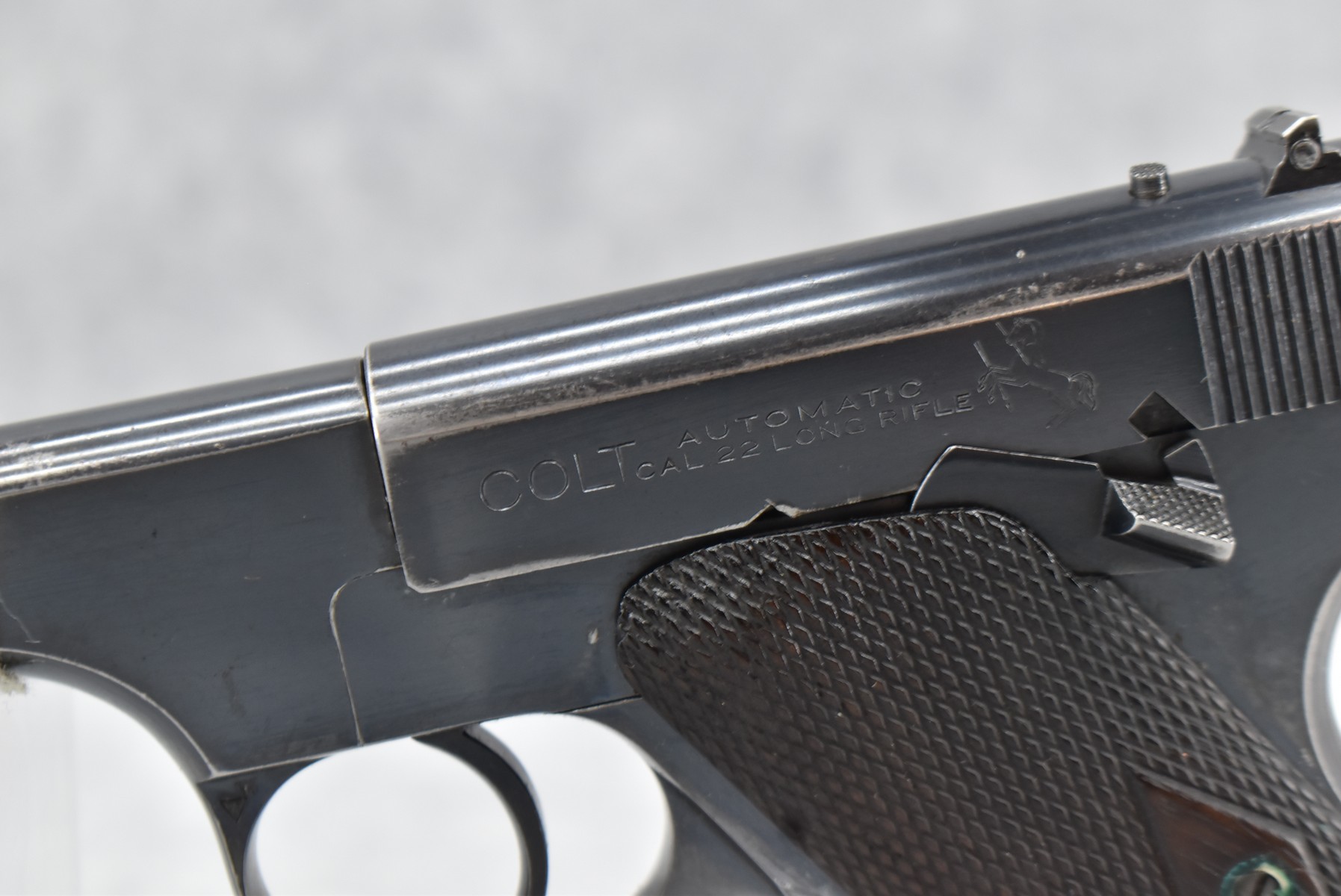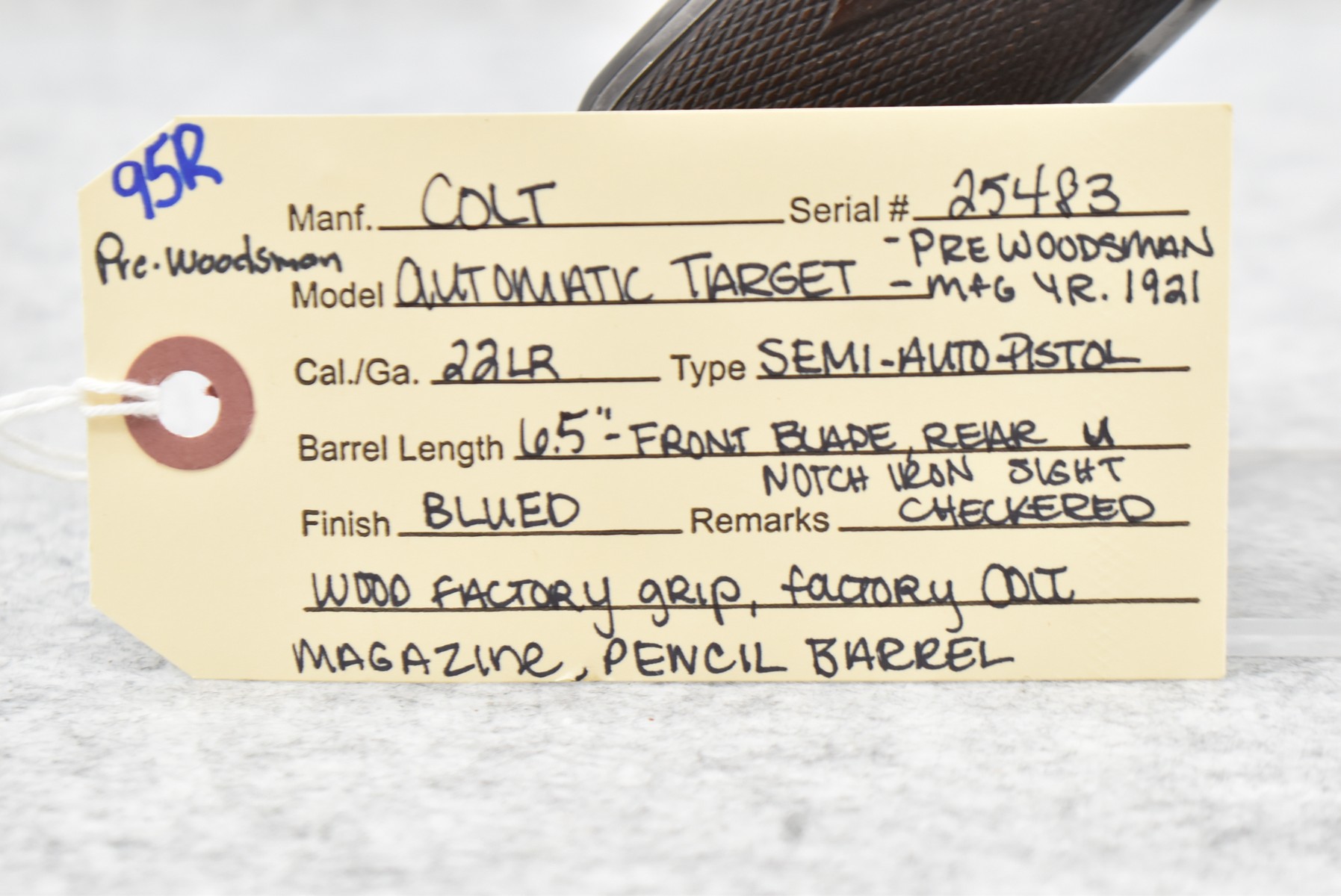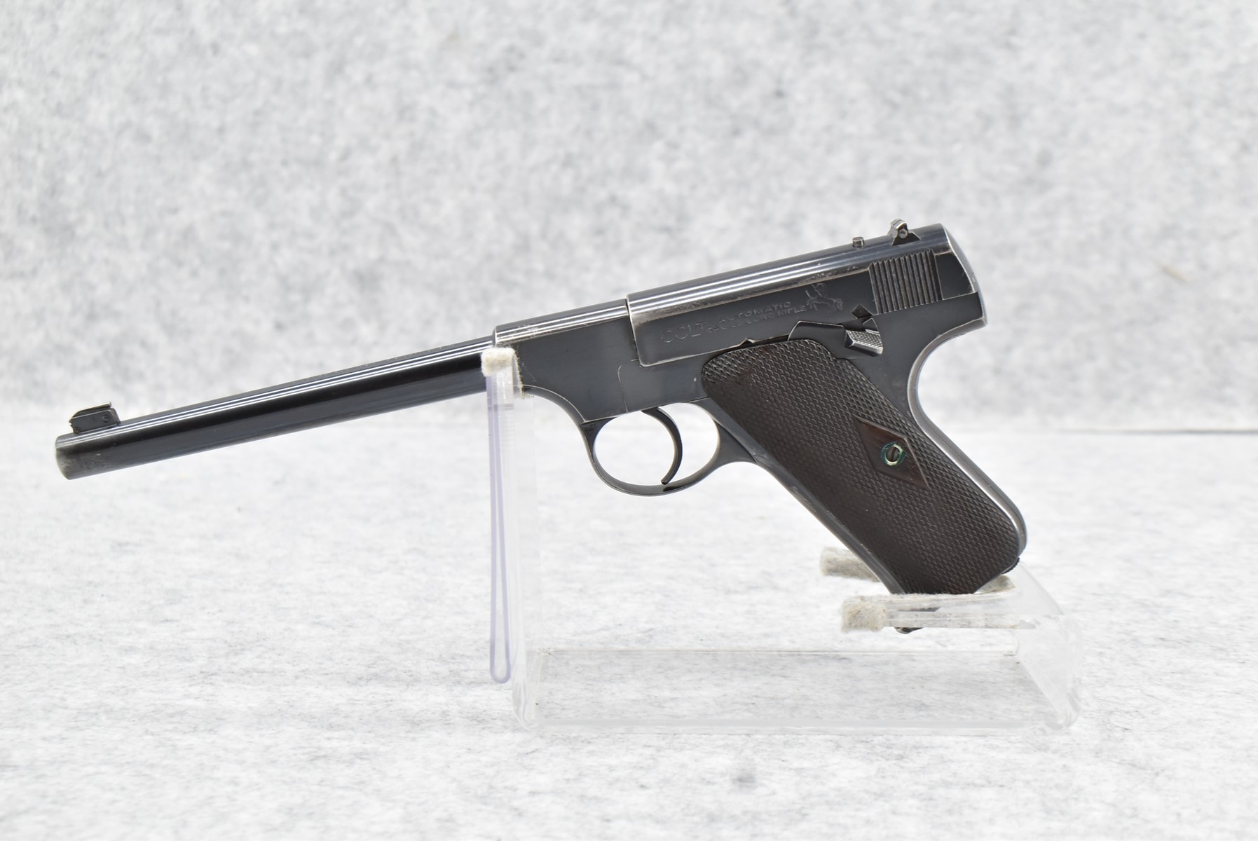 95R. Colt – Mod. Pre-Woodsman Automatic Target – 22LR Cal. Semi-Auto Pistol – w/6 ½” Pencil Barrel w/Front Blade & Rear U-Notch Iron Sights – Blued Finish – w/Checkered Wood Factory Grips – w/Factory Colt Magazine – Mfg. 1921