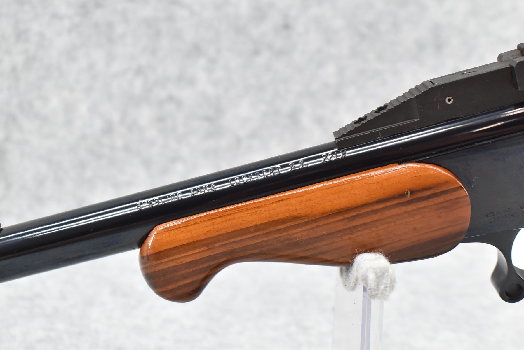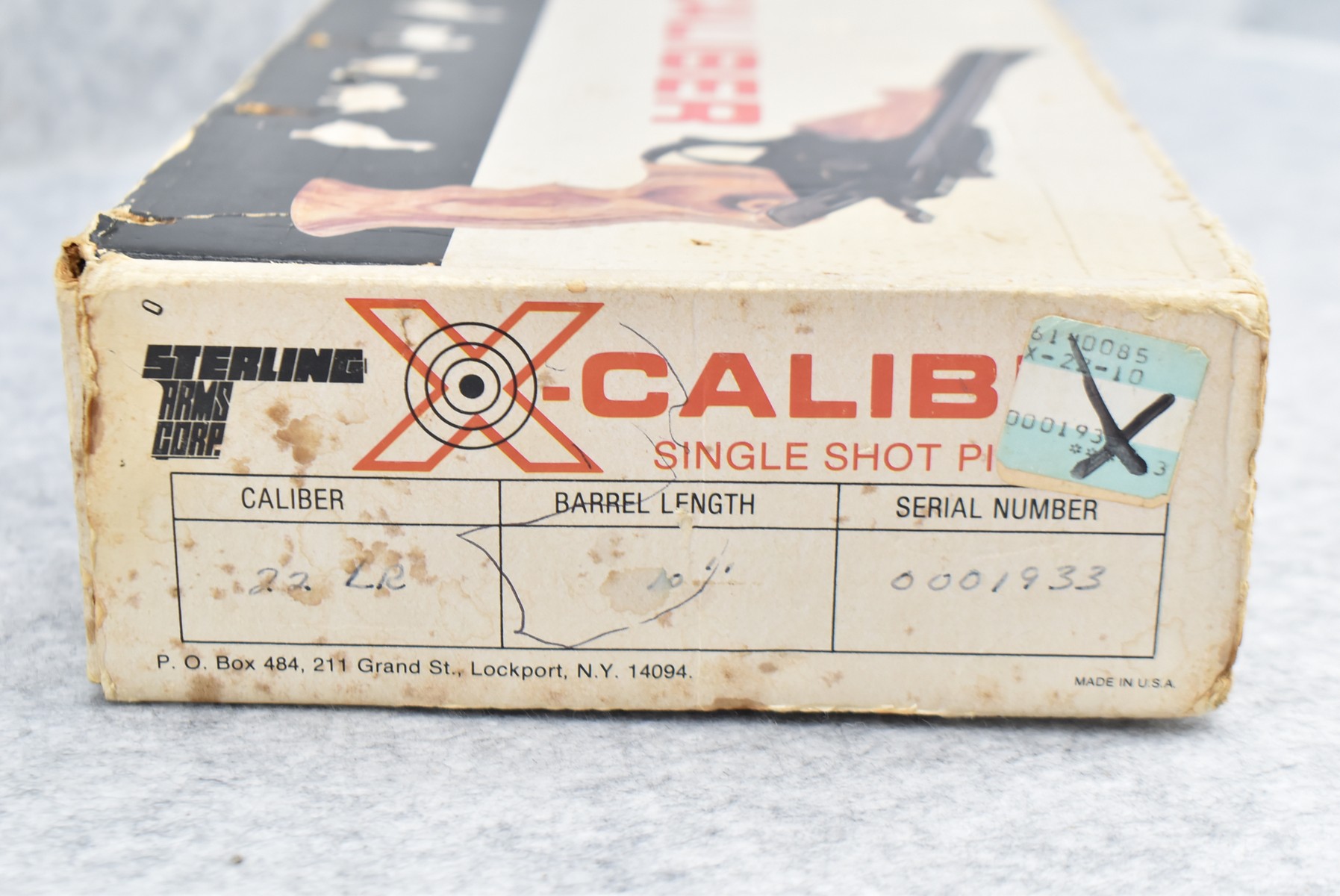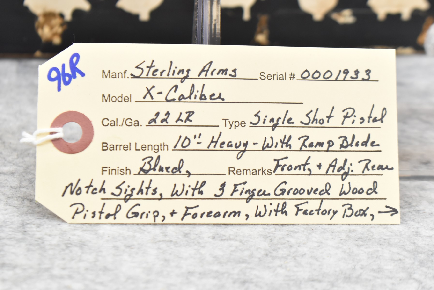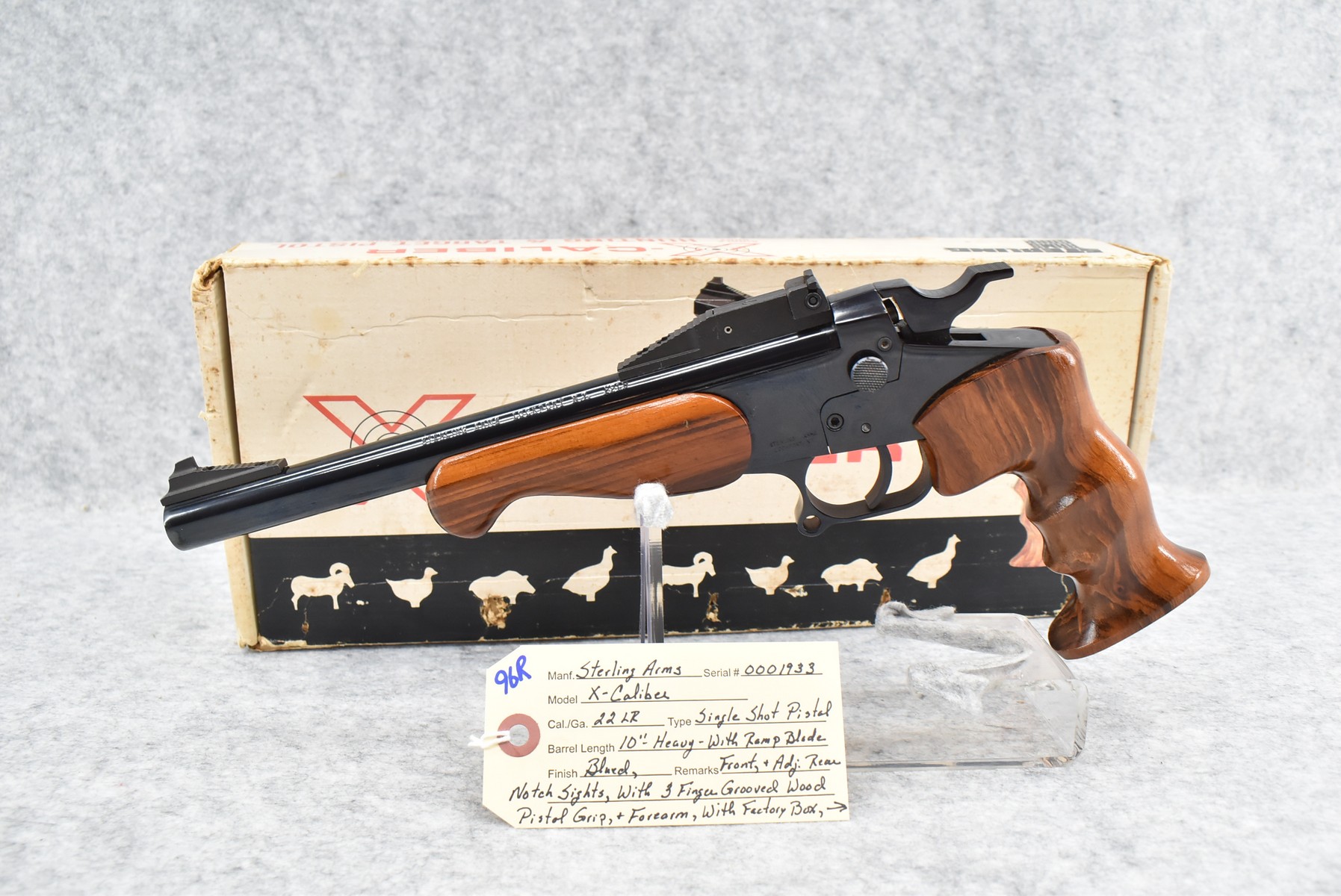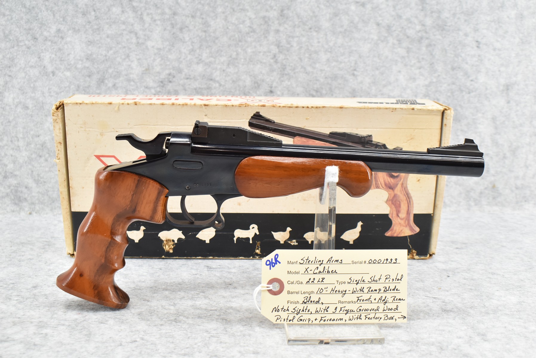 96R. Sterling Arms – Mod. X Caliber – 22LR Cal. Single Shot Pistol – w/10” Heavy Barrel w/Ramp Blade Front and Adjustable Rear Notch Sights – Blued Finish – w/3-Finger Grooved Wood Pistol Grip and Forearm – w/Factory Box and Manual