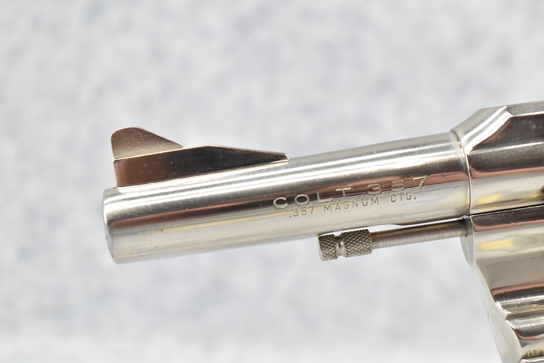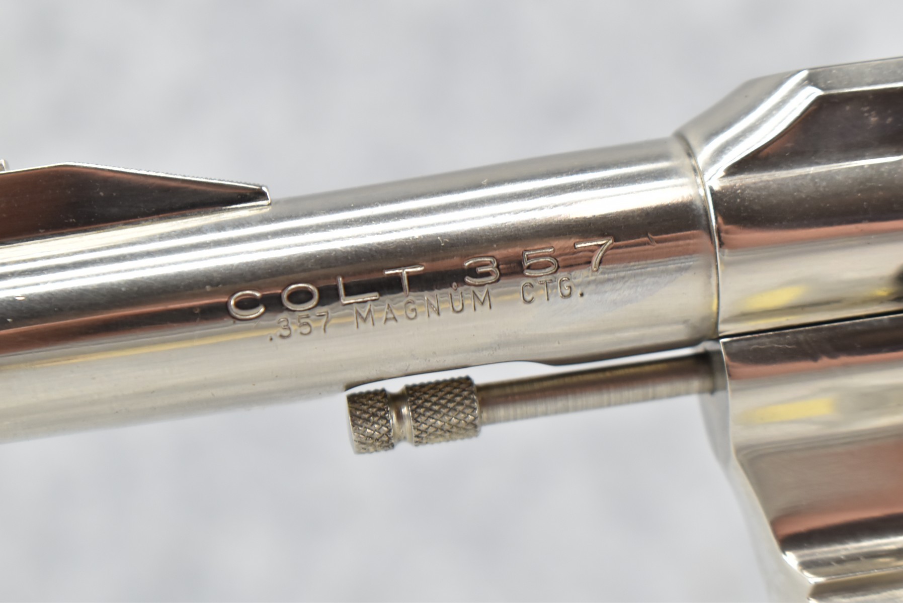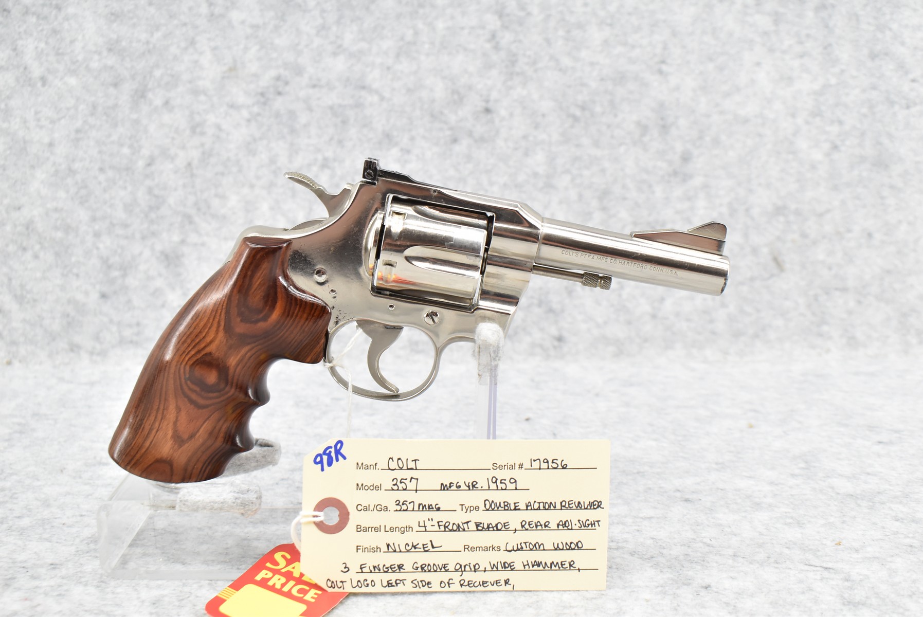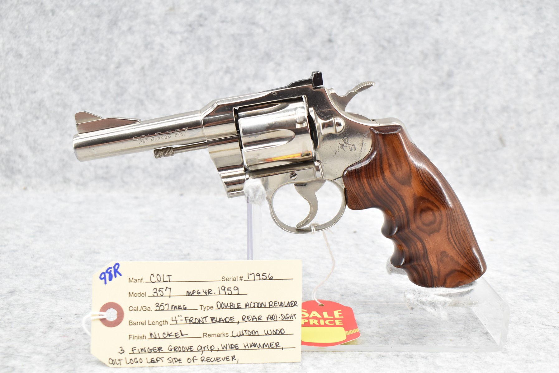 98R. Colt – Mod. 357 – 357 Mag. Cal. Double Action Revolver – w/4” Barrel w/Blade Front and Adjustable Rear Sights – Nickel Finish – w/Custom Wood 3-Finger Groove Grip