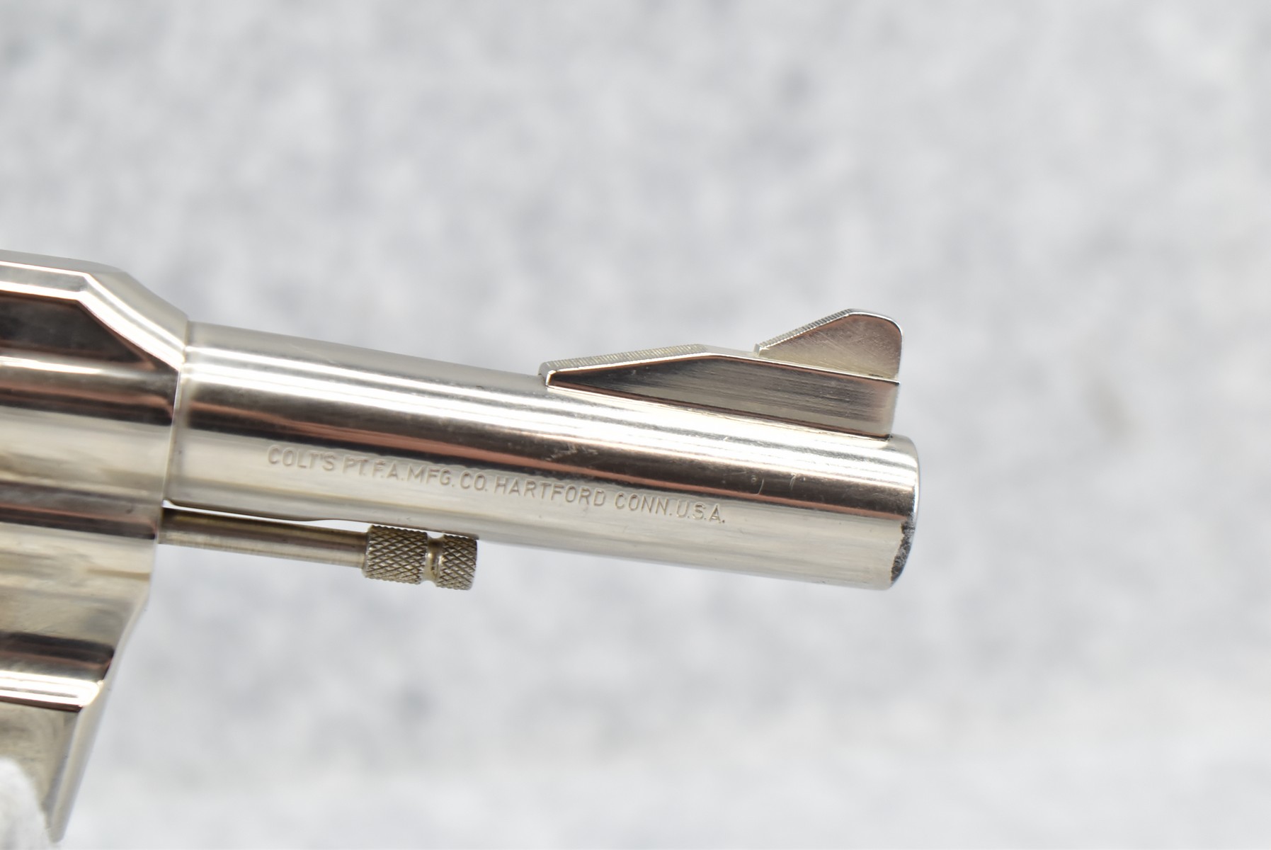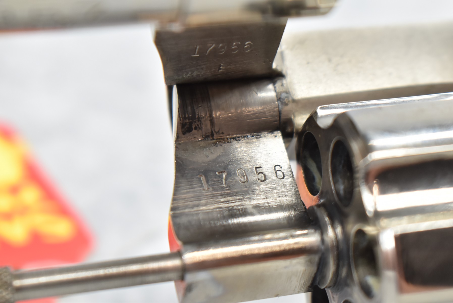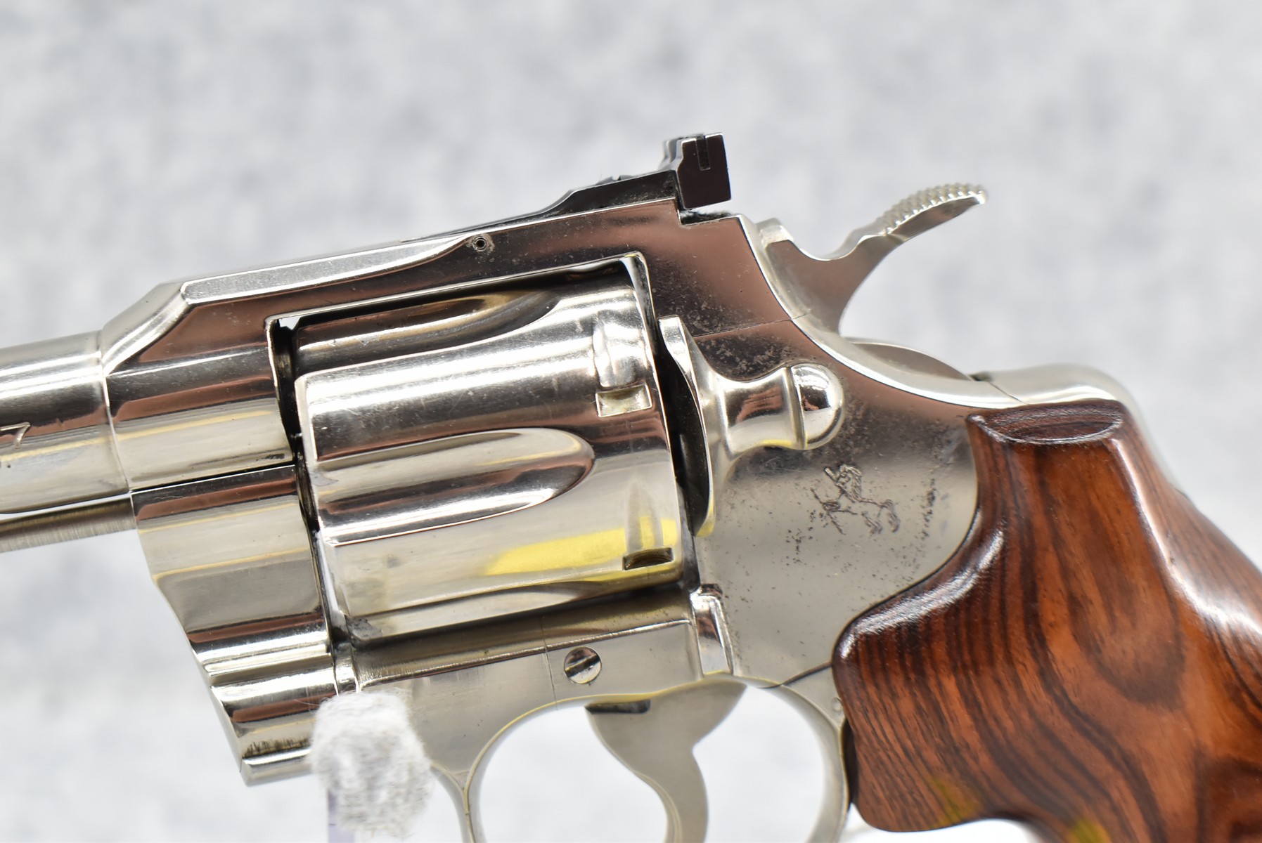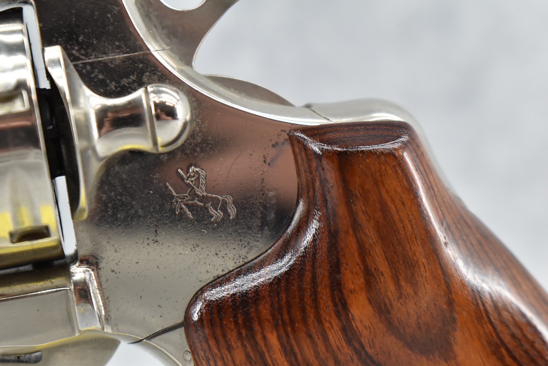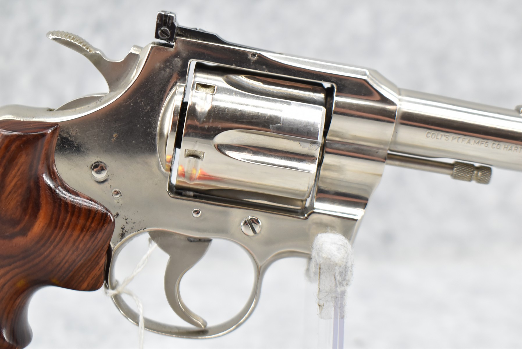 98R. Colt – Mod. 357 – 357 Mag. Cal. Double Action Revolver – w/4” Barrel w/Blade Front and Adjustable Rear Sights – Nickel Finish – w/Custom Wood 3-Finger Groove Grip