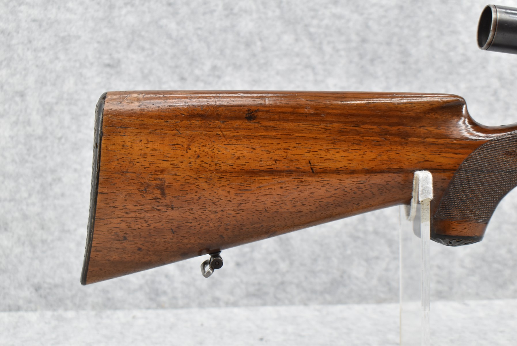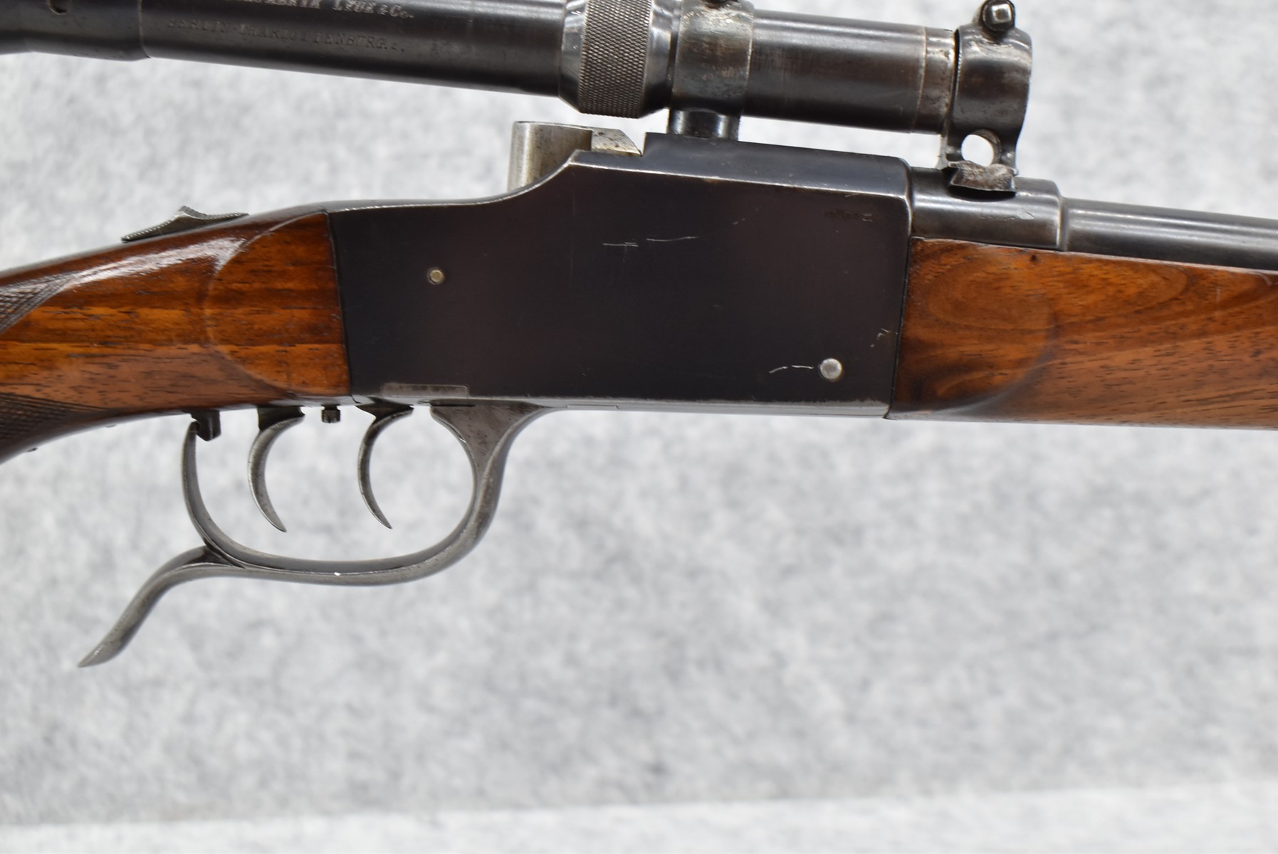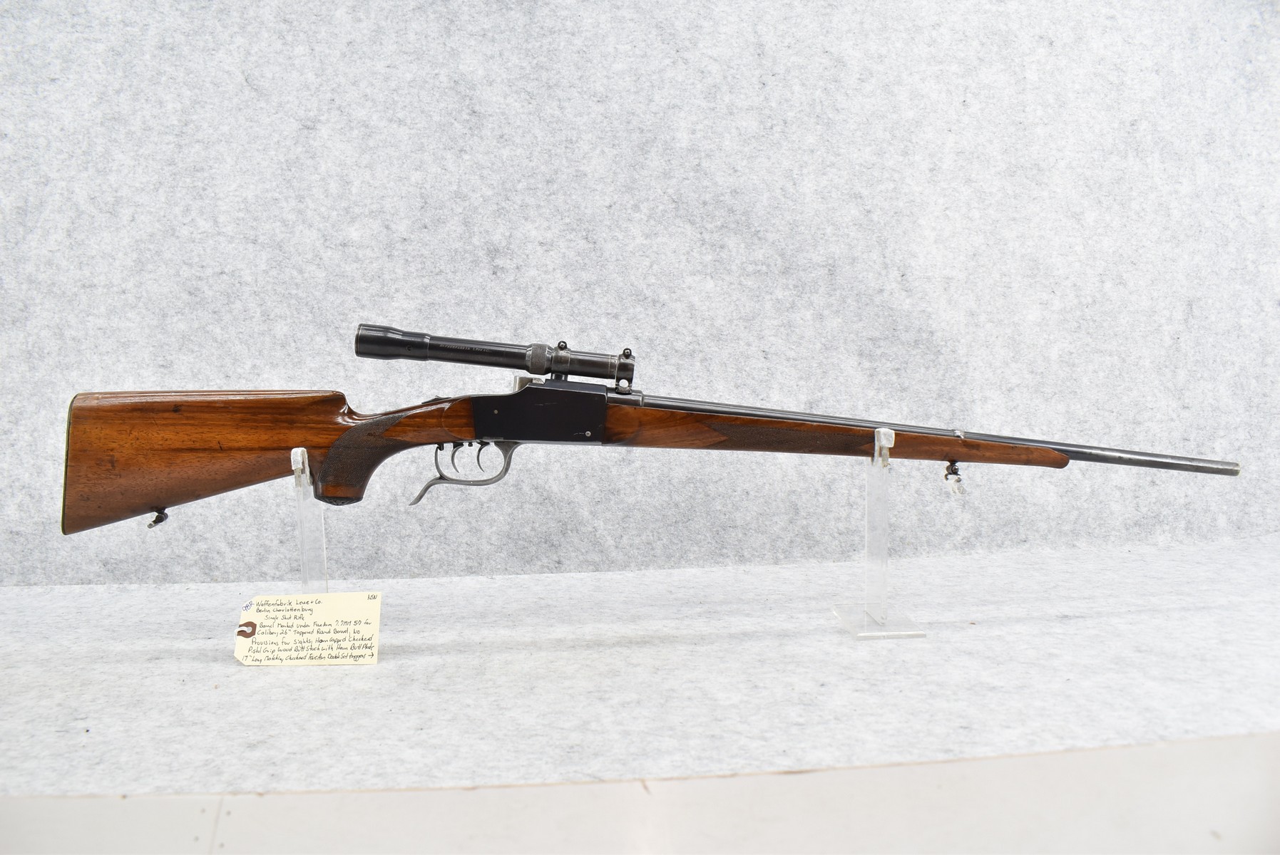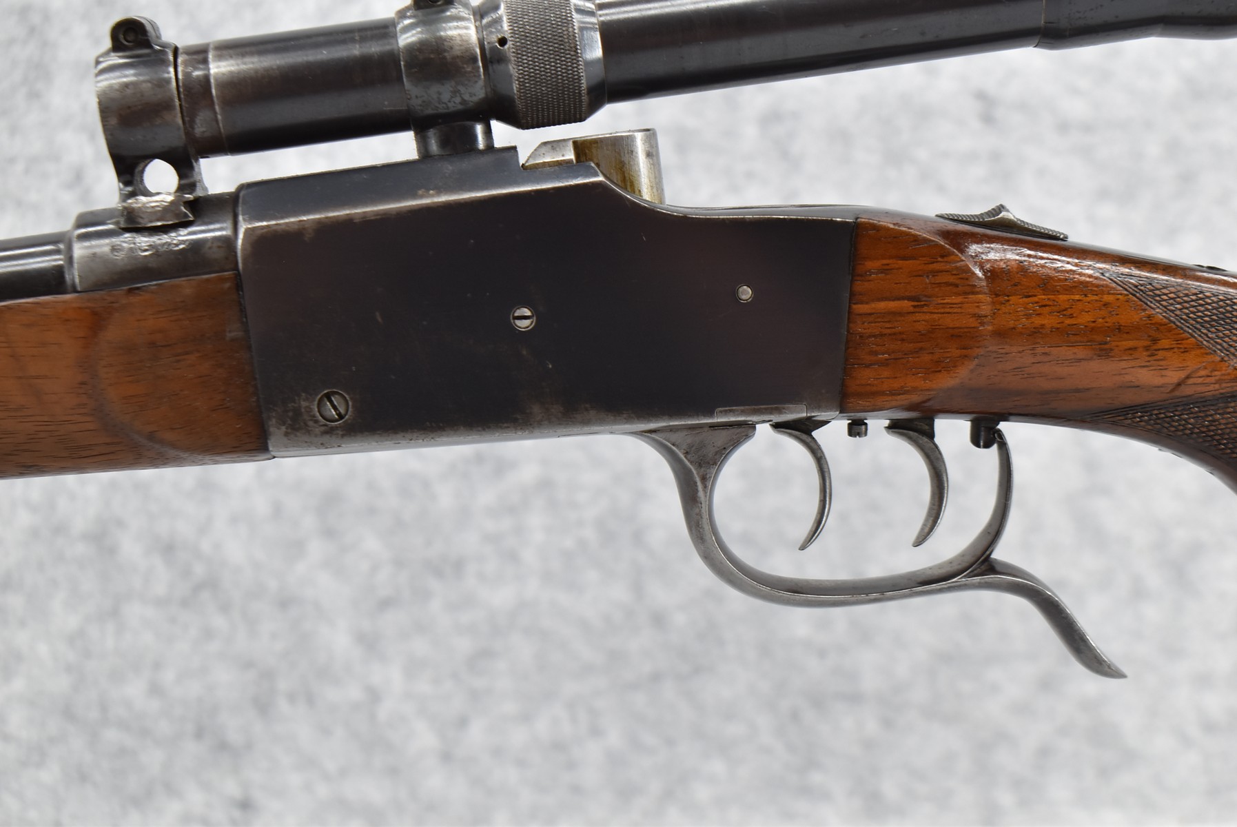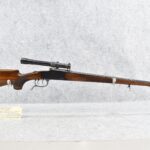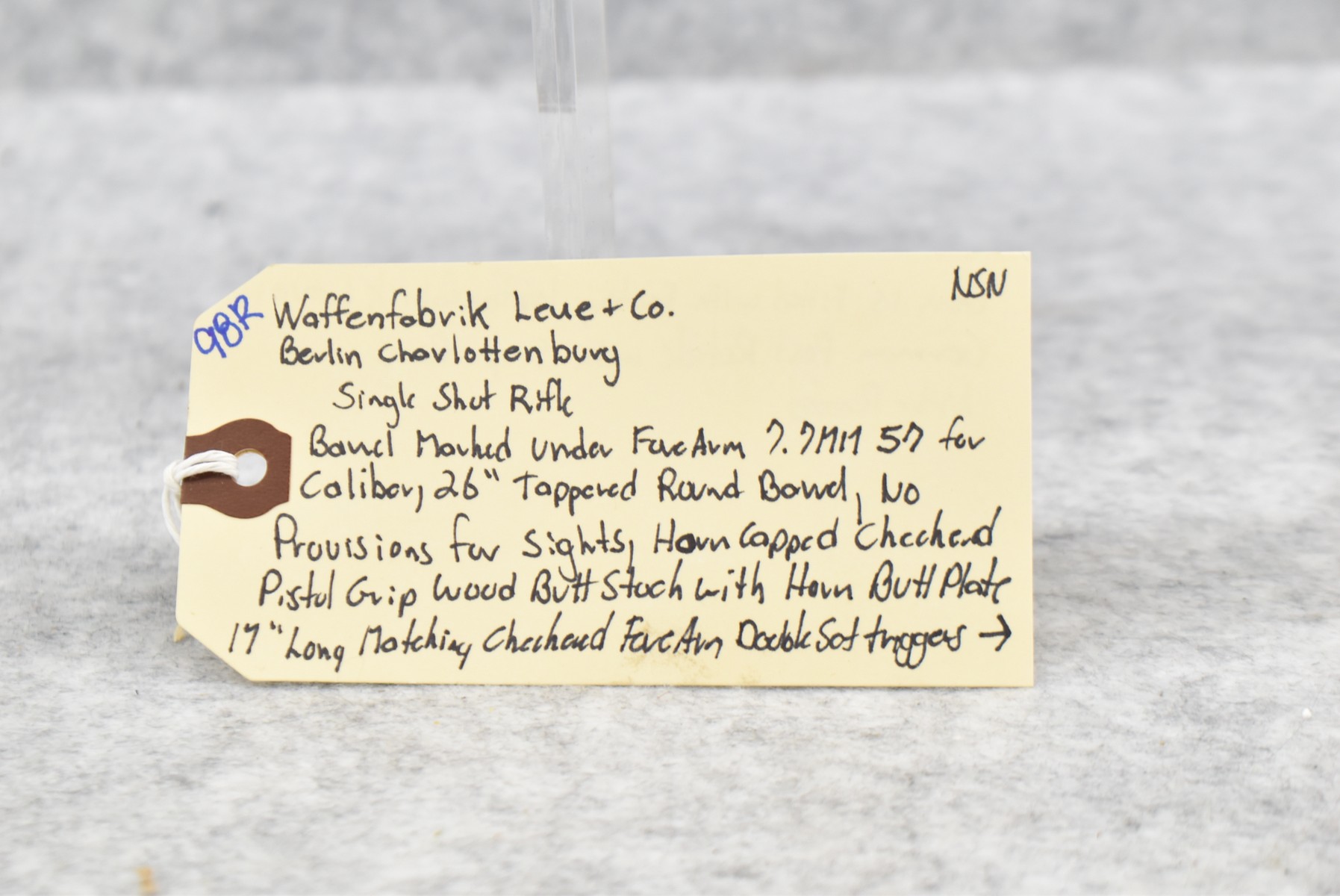 98R. Waffenfabrik Leue & Co. -Berlin Charlottenburg – Single Shot Rifle – Barrel Marked Under Forearm 7.7mm 57 for Caliber – w/26” Tapered Round Barrel (No Provisions for Sights) – w/Horn Capped Checkered Pistol Grip Wood Butt Stock w/Horn Butt Plate & 17” Long Matching Checkered Forearm – w/Double Set Triggers – Gun is Fitted w/Factory Waffenfabrik Leue & Co. German Post Reticle Scope – w/Scope Rings – Nitro Proofed