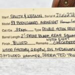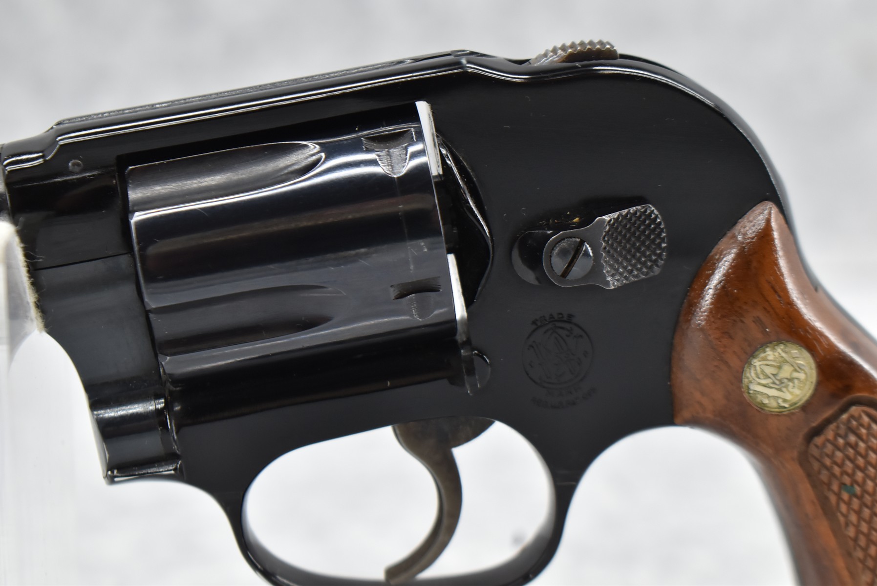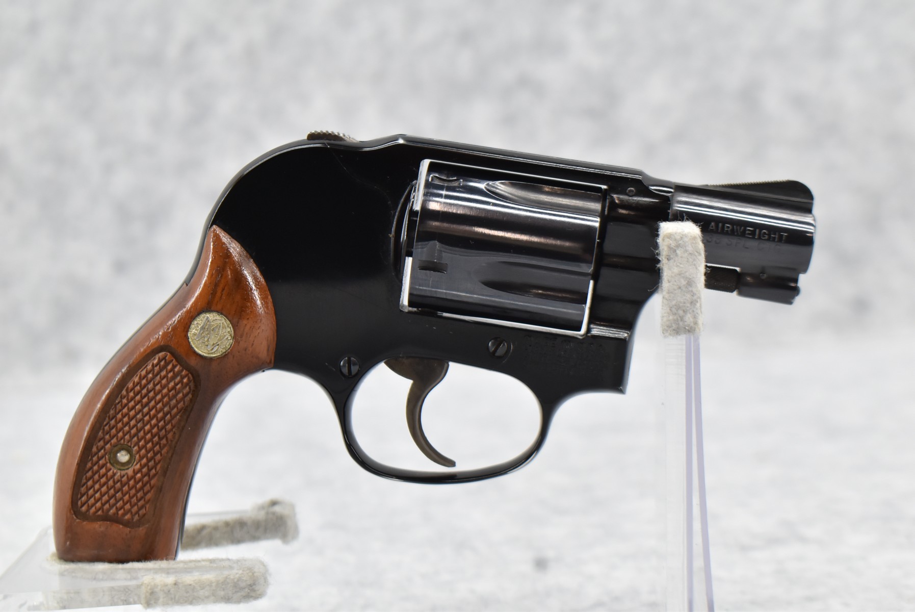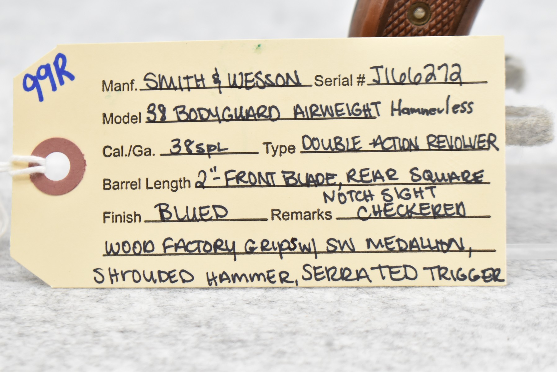 99R. Smith & Wesson – Mod. 38 Bodyguard Airweight Hammerless – 38 Spl. Cal. Double Action Revolver – w/2” Barrel w/Front Blade & Rear Square Notch Sight – Blued Finish – w/Checked Wood Factory Grips w/S&W Medallion