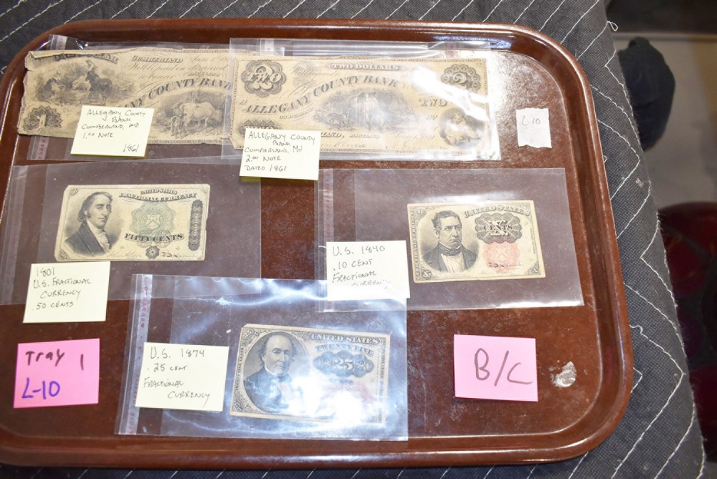 Antiques and Collectibles: Large Amount of Pottery Crocks and Jugs, Pottery Bowls, Pottery Planters, Pottery Molds, Pottery/Ceramic Figures, Signed Pottery Plates, McCoy Pottery, Williamsburg Pottery, Granite and Porcelainware, Pair of 19th Century Meissen Porcelain Salt and Pepper Figurines, Bank Notes and Currency, Black Americana Items, Large Carved Wooden Swan Decoy on Stand, Carved Wooden Duck Decoys, Railroad Buttons, Advertising Pinback Buttons, (8) Lots of Marbles Including Uranium Glass Marbles, (16) Various Lots of Vintage Poker Chips, Vintage Lamps and Lanterns, (23) Lots of Various Wood Planes, Blacksmith Tools, Keystone Mince Meat Wooden Advertising Bucket, Woven Baskets, Wooden Buildings, Case “The Early Americans” Knife Display, Coffee Mills, Woodware, Tabacco Pipes in Display Case, Vintage Mills, Vintage Decorated Wooden Sled, Amelia Cate De La Tour Art Decco Lady w/3 Dogs on Onyx Base, Vintage Match Holders, Advertising Tins, Vintage Picnic Basket, Sterling Silver Plate, British Connaught Rangers Officers Helmet Tin, Brass Balance Scales that Measure in Pennyweight, Old Photographs, Old Books, Vintage Advertising Signs, Maryland Civil Defense Arm Band, Vintage Dolls, Very Rare Carved Beaver Butter Press, Vintage Childs Toys, Vintage Oilers, Powder Horns, Powder Flasks, World Globe Pencil Sharpener, Cookie Cutters, German WWI Medical Canteen w/Original Corduroy Cover, Leather Harness, and Steel Cup, Nelke Box Dolls, Gas Pens, (11) Various Axes and Hatchets, (20) Various Carved Wooden Canes and Night Sticks, Various Knives, Framed and Unframed Prints and Pictures, and Other