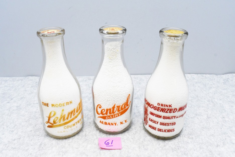 Antique Glassware: 100 Lots of Colored and Clear Vintage Glass Bottles and Jars, Milk Bottles, Glass Candy Jars, Pitcher and Glass Sets, Hobnail Candle Holders, Yellow Depression, Vintage Glasses w/Ladies, Heizey Pitcher, Chicken on Nests, and Other