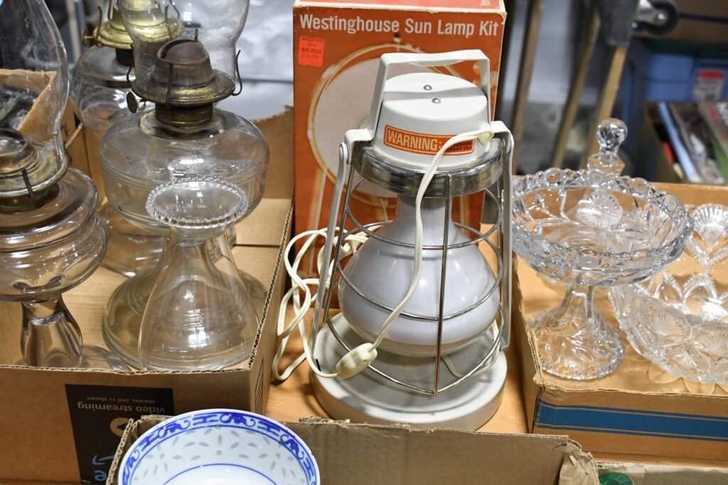 Antique Glassware: 30+ Lots of Vintage Glass Bottles, Milk Bottles, Dated Mason Jars, Wedgewood Glass, North Lodge Fishing Oriented Snow Globe, Decanters, Carnival Glass, Lenox Glass, Oriental Glass, Ruby Glass, Green Depression Glass, Oil Lamps, and Other