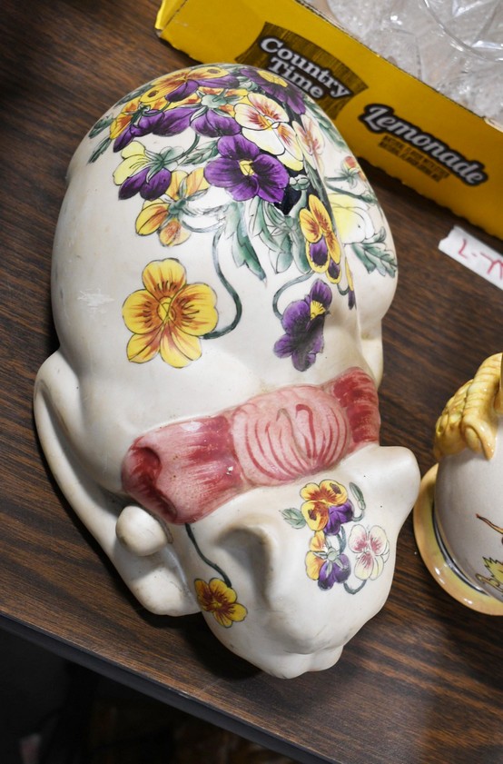 Antiques and Collectibles: (30) Longaberger Baskets of Various Sizes and Styles, Large Amount of Folding, Pen, and Sheath Knives, Knife Sets, Wade Whimsies Ceramic Figures, Vintage Childs Books, Childs Games, Bolo Ties, Belt Buckles, Belts, Ladies Vanity Set, Advertising Tins, Advertising Thermometers, Holiday Decorations, Brass Bucket, Display Cases, Flashlights, Men’s Hats, Vintage Hand Fans, Clocks, Marbles, Stamps, Vintage Tools, Calf Weaners, Meat Hooks, Glass Butter Churn, Vintage Scales, Pottery Crocks and Jugs, Singer Mod. 221 Portable Sewing Machine, Vintage Bells, Vintage Farm Equipment Manuals, Locks with Keys, Old Photographs, Large Amount of Porcelain Dolls and Doll Clothing, Postcards, Cal Ripken Jr. Bobble Head, Signed Baseball Bats, Signed Football, Large Amount of Framed and Unframed Prints and Pictures, Movie Posters, and Other