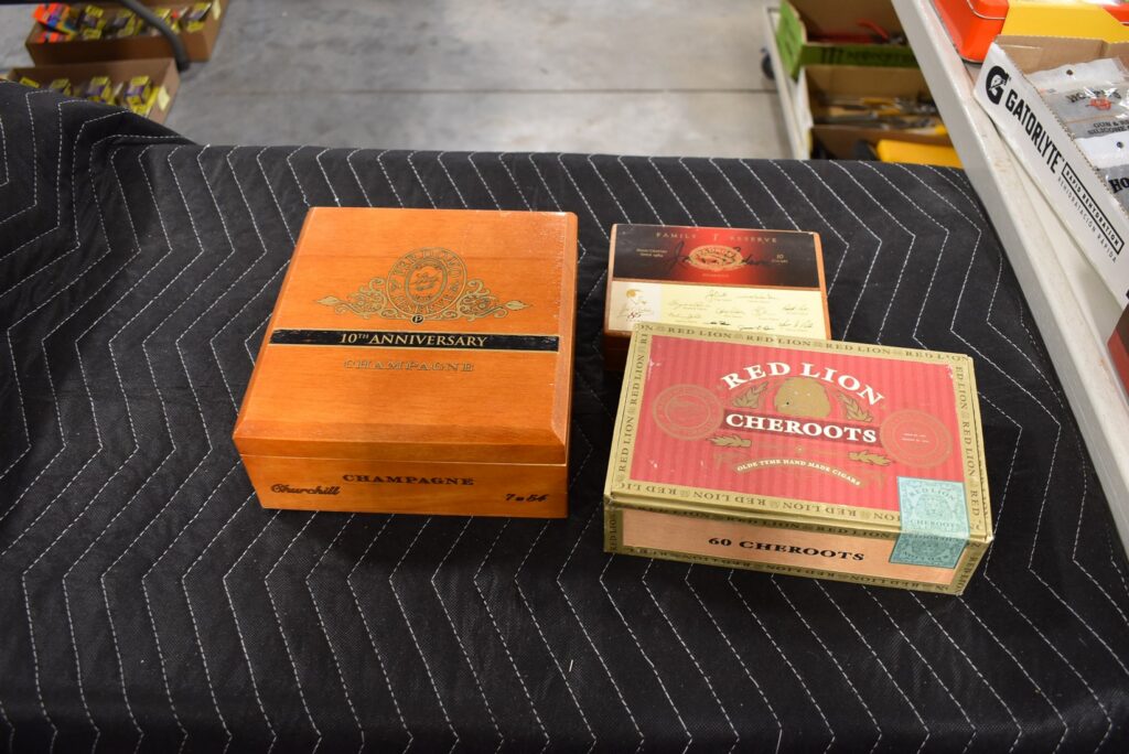 Antiques and Collectibles: (5) Longaberger Baskets of Various Sizes and Styles, Pottery Crocks and Jugs, Pottery Bowls, Castware, Beer Advertising Signs, Beer Taps, Beer Steins, Large Amount of Cigar Boxes, Underwood Typewriter, Jim Shore Figures, Lighters, Advertising Items, Copper and Brass Items, Utensils, Vintage Scales, Enterprise Sausage Stuffer, Holiday Decorations, Viewers, Modern Tools, Carved Wildlife Figures, Wildlife Plates, Hats, Framed Prints and Pictures, and Other