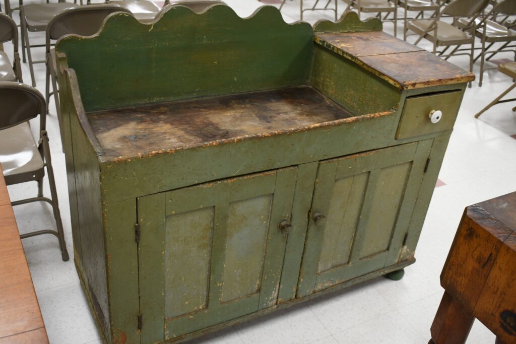Furniture: Rare Walnut and Porcelain Ships Captain Sink, Miniature Walnut 2-Drawer Hutch, Apple Cider Press, Cast Butcher Kettle on 3 Legs, (2) Wooden Roll-Over Butter Churns on Bases, Wood Beam Platform Scales, Wooden Luxury Coffee Store Bin, Unique Water Pump with Hammer Forged Heart Handle, Hanging Decorated 2-Door Wall Cabinet, Wooden Decorated Childs Hobby Horse, Wooden Wheel Childs Express Wagon, Period Blue Painted Single Door Wardrobe/Cabinet, Blue Decorated Hammer Tin Pie Safe, Milk Paint Decorated 1-Piece Blind Door Corner Cupboard, Wooden Painted Dry Sink w/Gally, Period Walnut 3-Drawer Farm Table in Excellent Condition, Period Walnut 3-Drawer Farm Table w/Pad Feet, Period Decorated (Green) Farm Table w/3-Drawers and Turned Legs, 2-Door 2-Drawer Wooden Jelly Cupboard, Green Decorated Plank Bench, Primitive Single Door Cabinet w/Blue Paint, Small 4-Leg Butchers Block, Primitive Dry Sink w/Period Green Paint, Green Decorated Plank Bench w/Apples, 12-Drawer Organizing Cabinet, 9-Drawer Narrow Case of Drawers w/Yellow Paint, Green Decorated 1-Drawer Drop Leaf Spool Stand, Yellow Decorated Deacons Bench, Walnut 2-Piece Combination Gun Cabinet Bookcase, 6’ Wood Spoke Wagon Wheel, Round Oak Drop Leaf Table, Primitive 1-Door Wooden Cabinet, Primitive 1-Door Green Decorated Cabinet, Small Lighted Curio Cabinet, Various Stands and Chairs, and Other