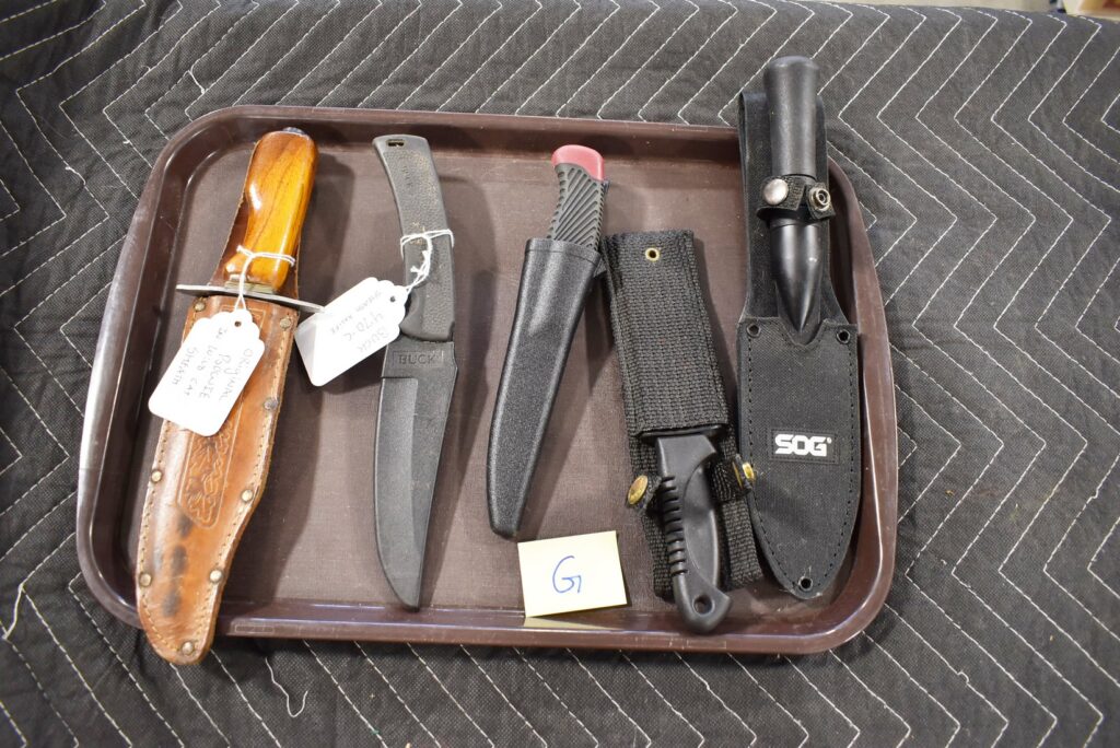 Sporting, Militaria, and Fishing: Firearms, Large Amount of Ammunition, Large Amount of Folding, Pen, and Sheath Knives, Scope Rings and Bases, Ammo Cans, Deer Antlers, European Mounts, (16) Various Machetes and Axes, Military Buttons, Fishing Rods, Reels, Tackle, and Lures, and Other