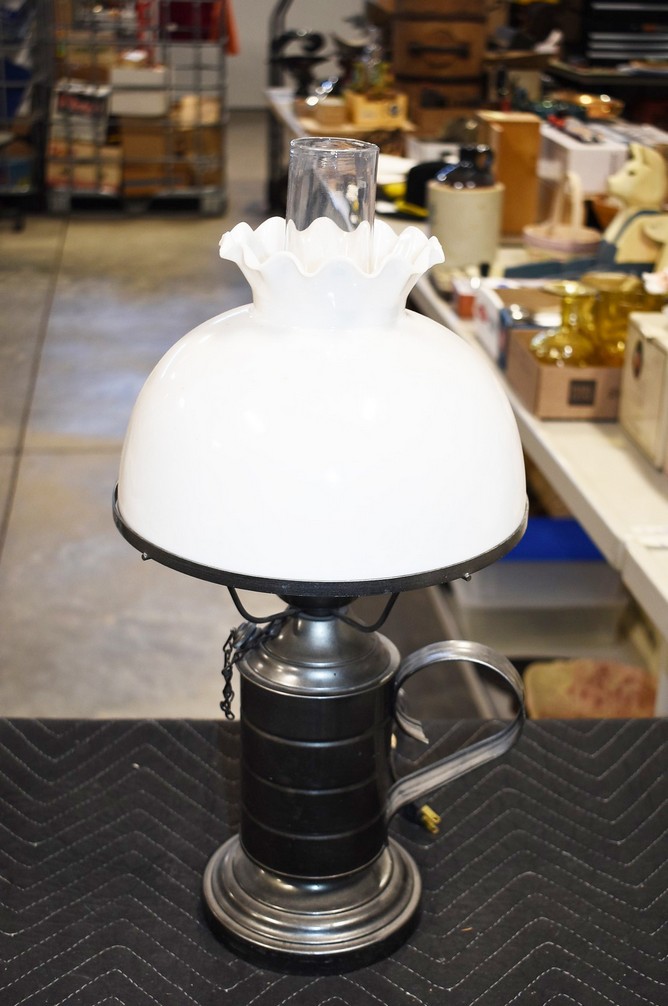 Antiques and Collectibles: (20) Longaberger Baskets of Various Sizes and Styles, (28) Various Wild Turkey Decanters, (4) Carved Wooden Canes, Pottery Crocks and Jugs, Pottery Planters, Roseville Pottery, (4) Jim Shore Angels, Griswold Dampers and Waffle Iron, Lamps and Lanterns, Petroleum Advertising Tins, Vintage Scales, Carved Wooden Figures, Winchester Roller Skates, Advertising Pinback Buttons, Miniature Cast Cannon, Vintage Holiday Cards, Vintage Bells, Miniature Cast Figures, Feed Bags, Car Plates, Woodware, Belt Buckles, Granite and Porcelainware, Copper and Brass Items, Old Photographs, World Globe, Vintage Tools, Vintage Egg Beaters, Hallmark Keepsake Ornaments, Vintage Advertising Signs, Vintage Maps, JFK Memorabilia, Crate Audio Equipment, Framed and Unframed Prints and Pictures, and Other