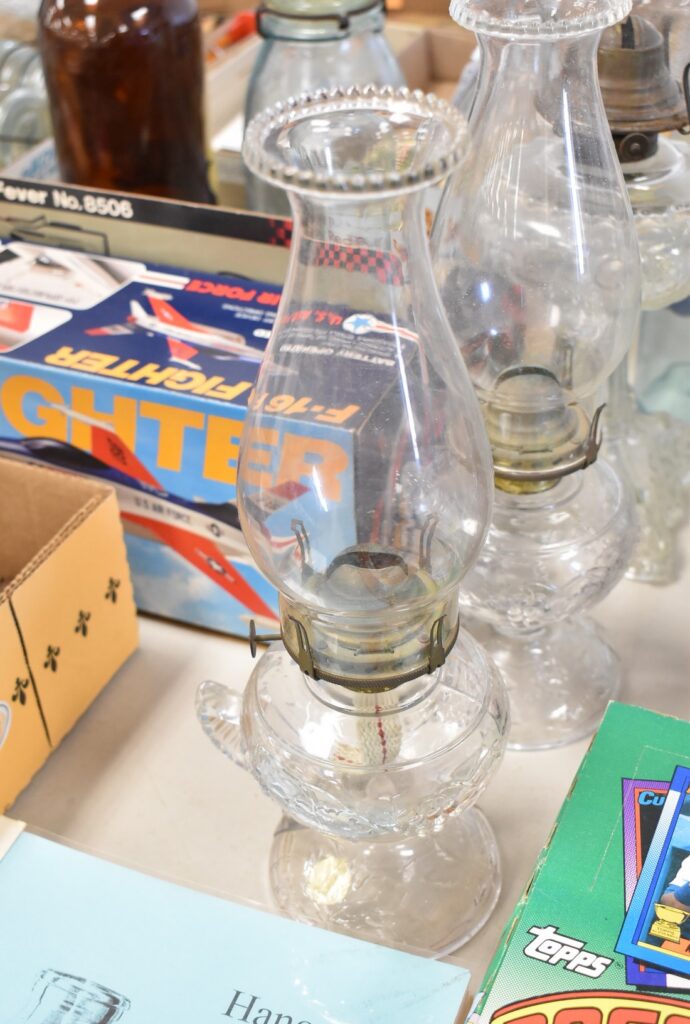 Antique Glassware: (60) Lots of Various Colored and Clear Vintage Glass Bottles and Jars, Milk Bottles, (14) Various Lots of Character and Peanut Butter Glasses, Lenox Glass, Blown Glass Flowers, Carnival Glass, Moon and Star Glass, Shot Glasses, Glass Oil Lamps, Glass Salt and Pepper Shakers, Pilsbury Dough Boy Cookie Jar, Glass Lady Figurines, and Other